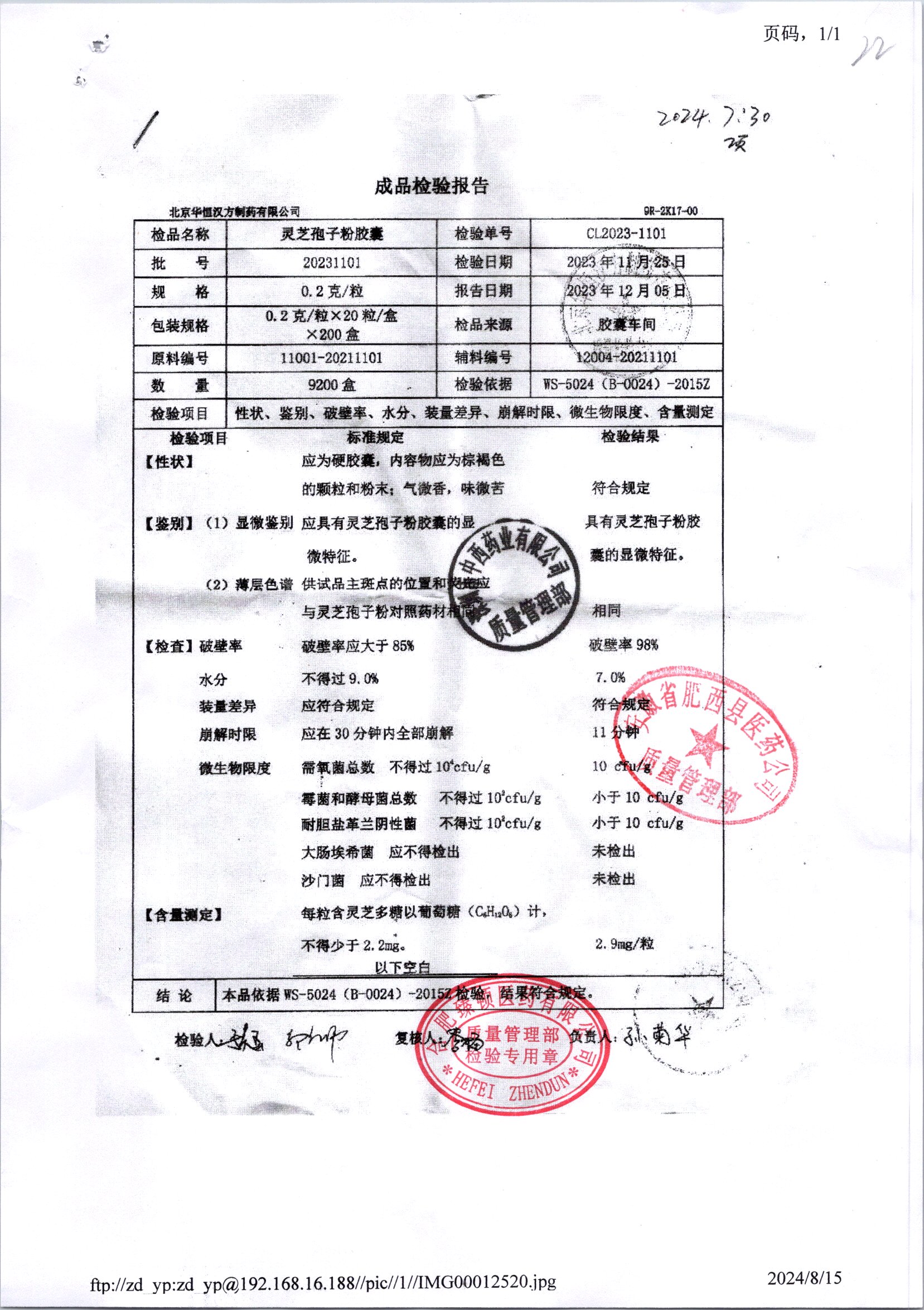 | 靈芝孢子粉膠囊 | 0.2g*20s | 20231201/2 | 查看詳情 |