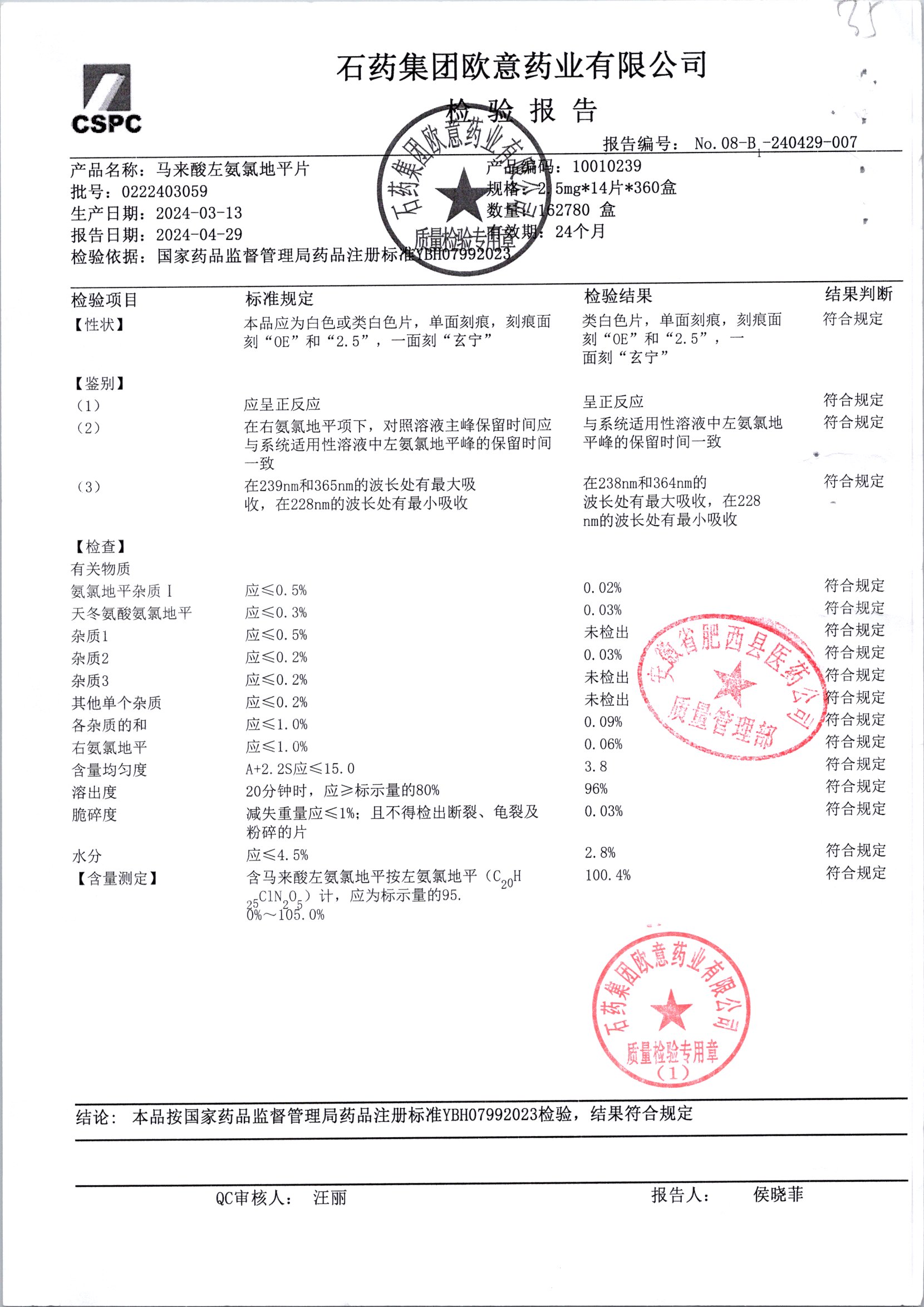 馬來酸左氨氯地平片 2.5mg*14片 0222403059 查看詳情