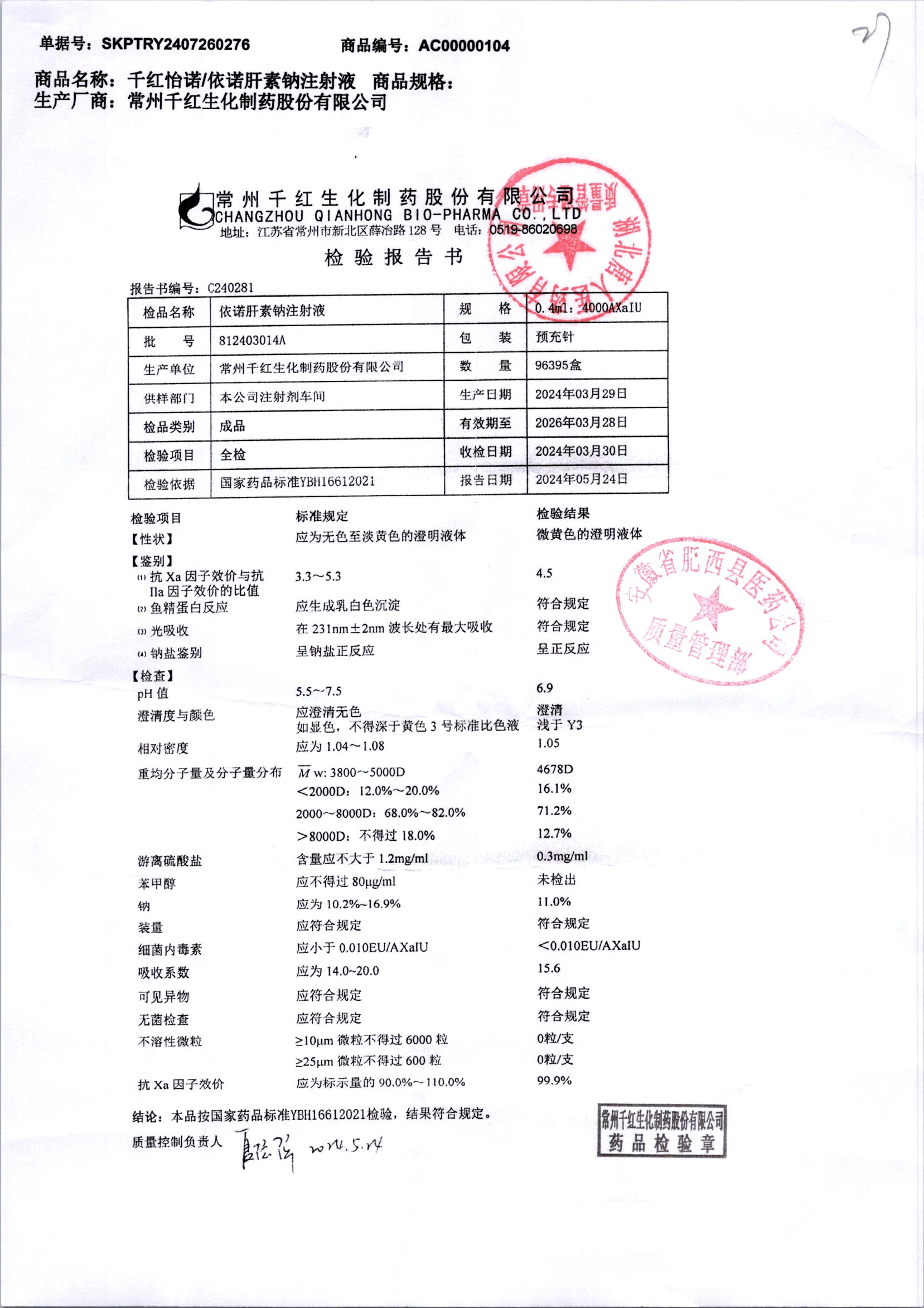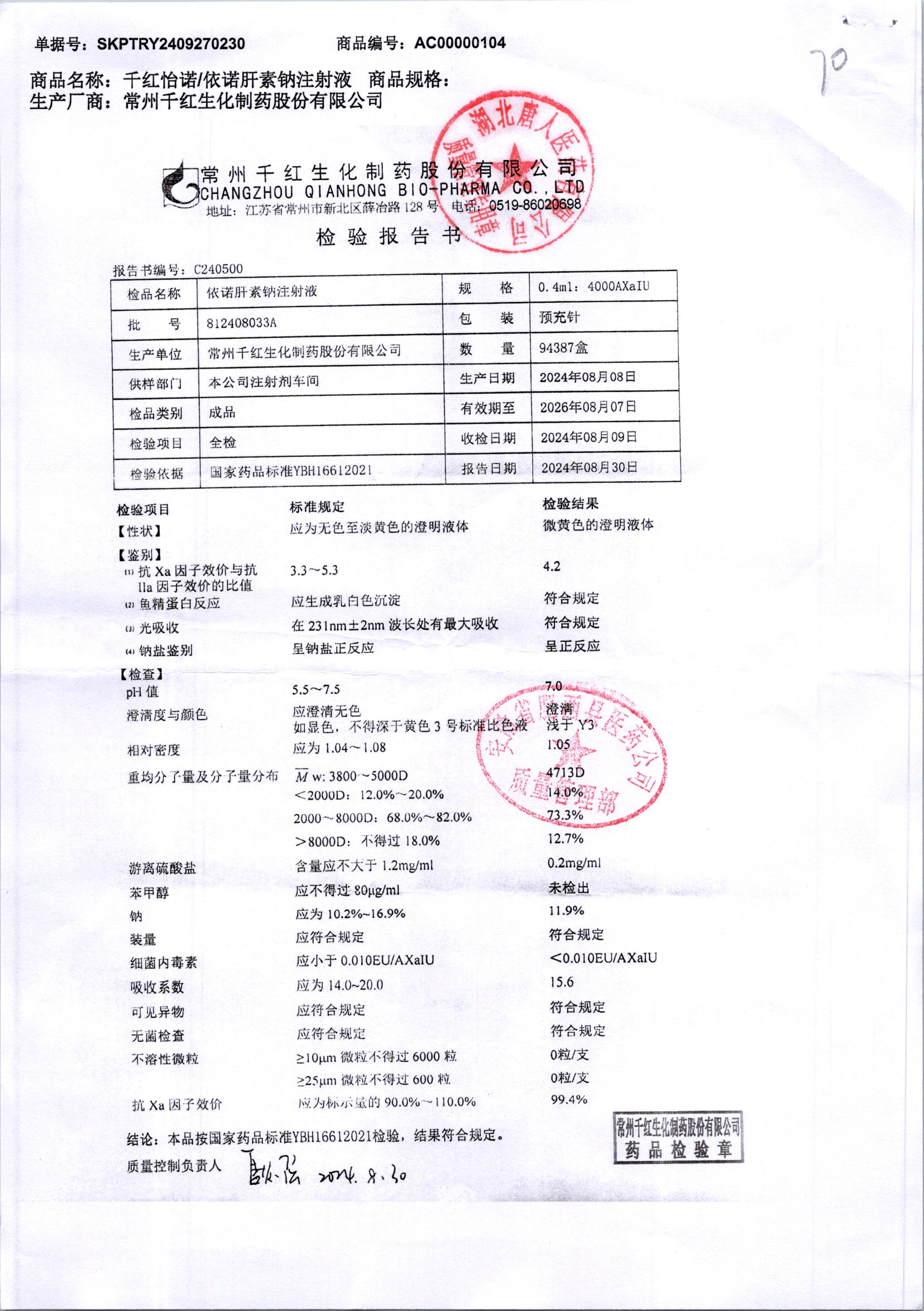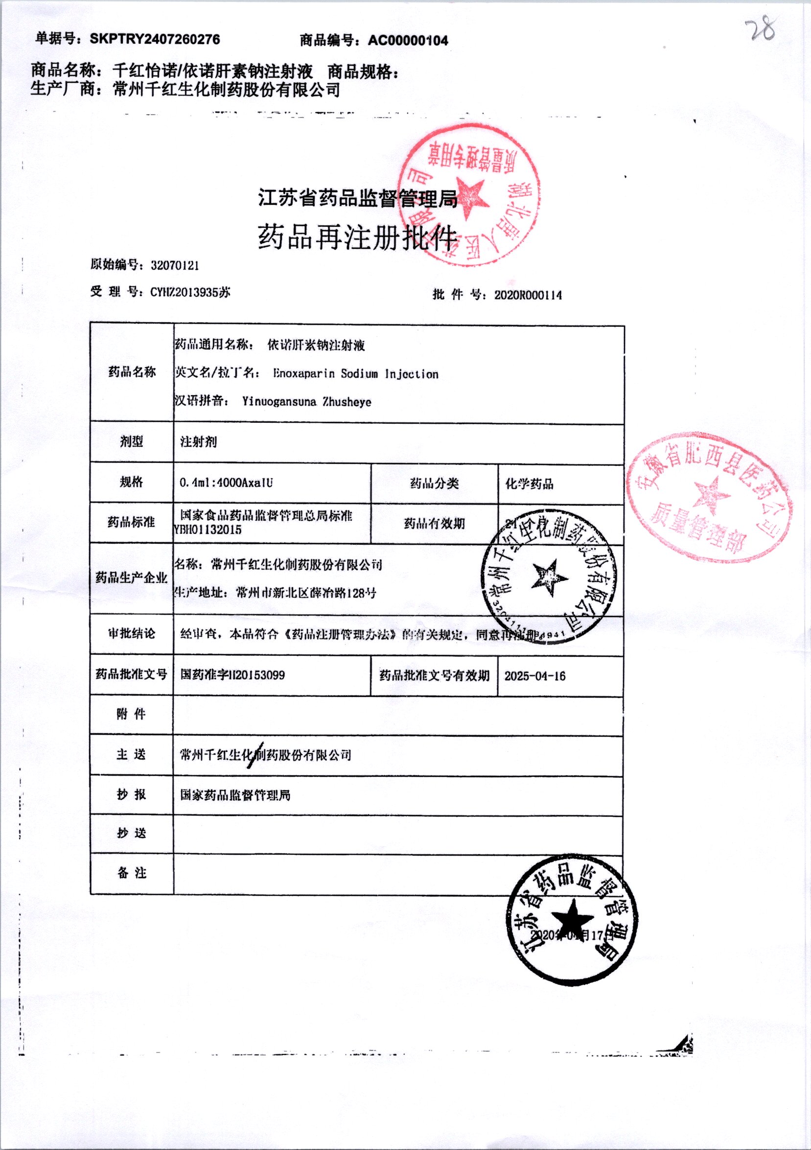 | 依諾肝素鈉注射液 | 0.4ml:4000AxaIU | 812408033A | 查看詳情 |