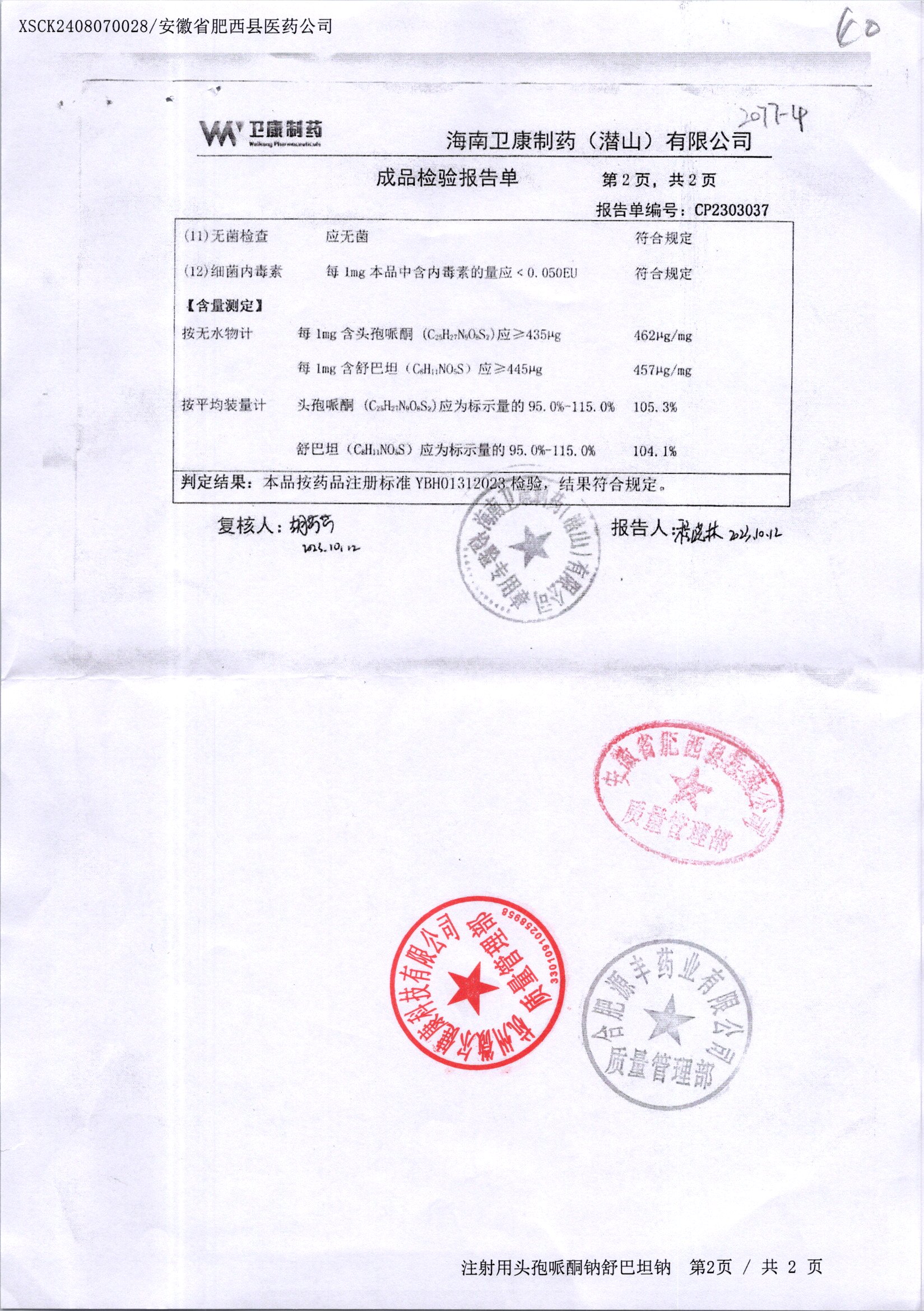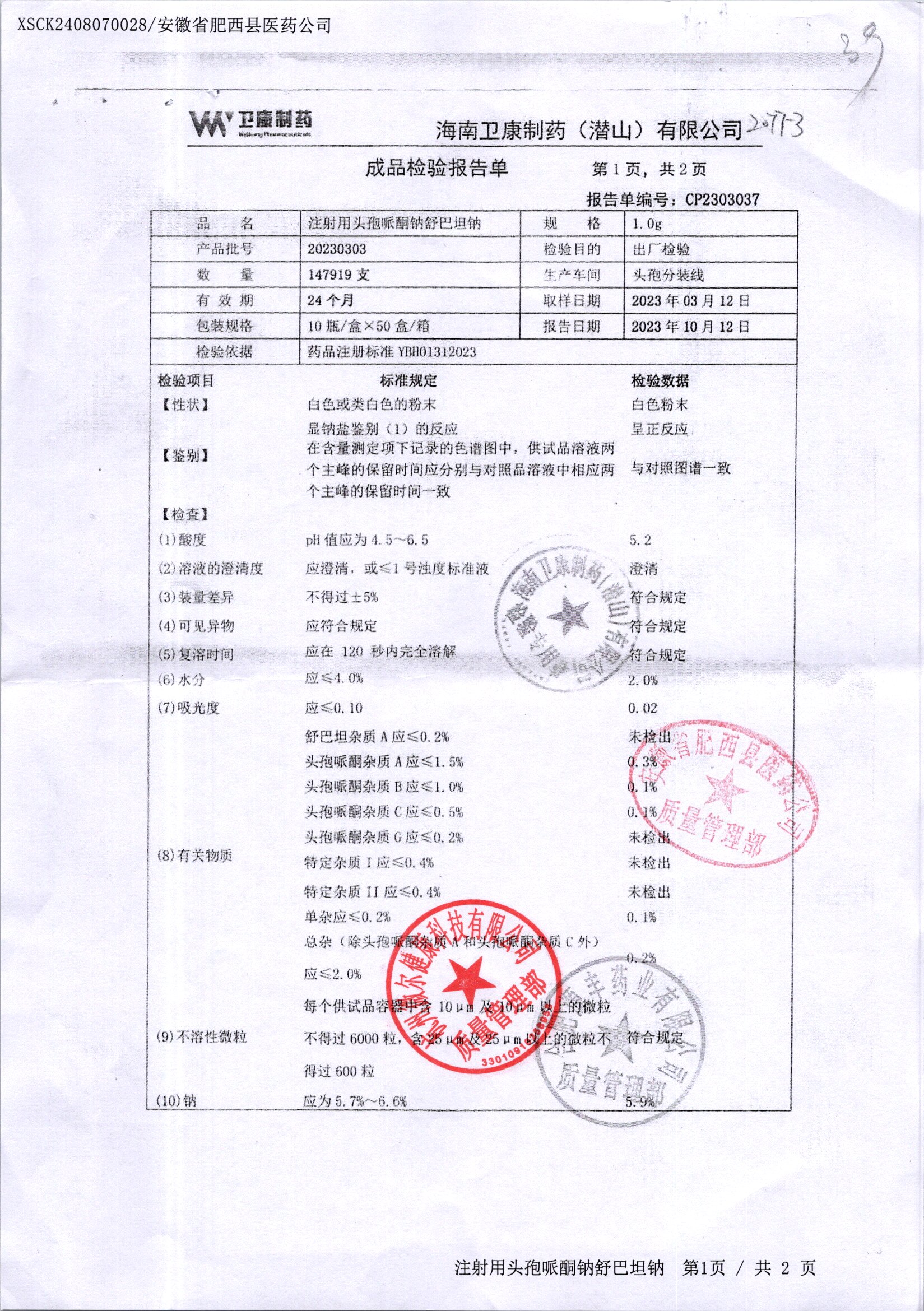 注射用頭孢哌酮鈉舒巴坦納 1.0g*10瓶 20230303/2 查看詳情