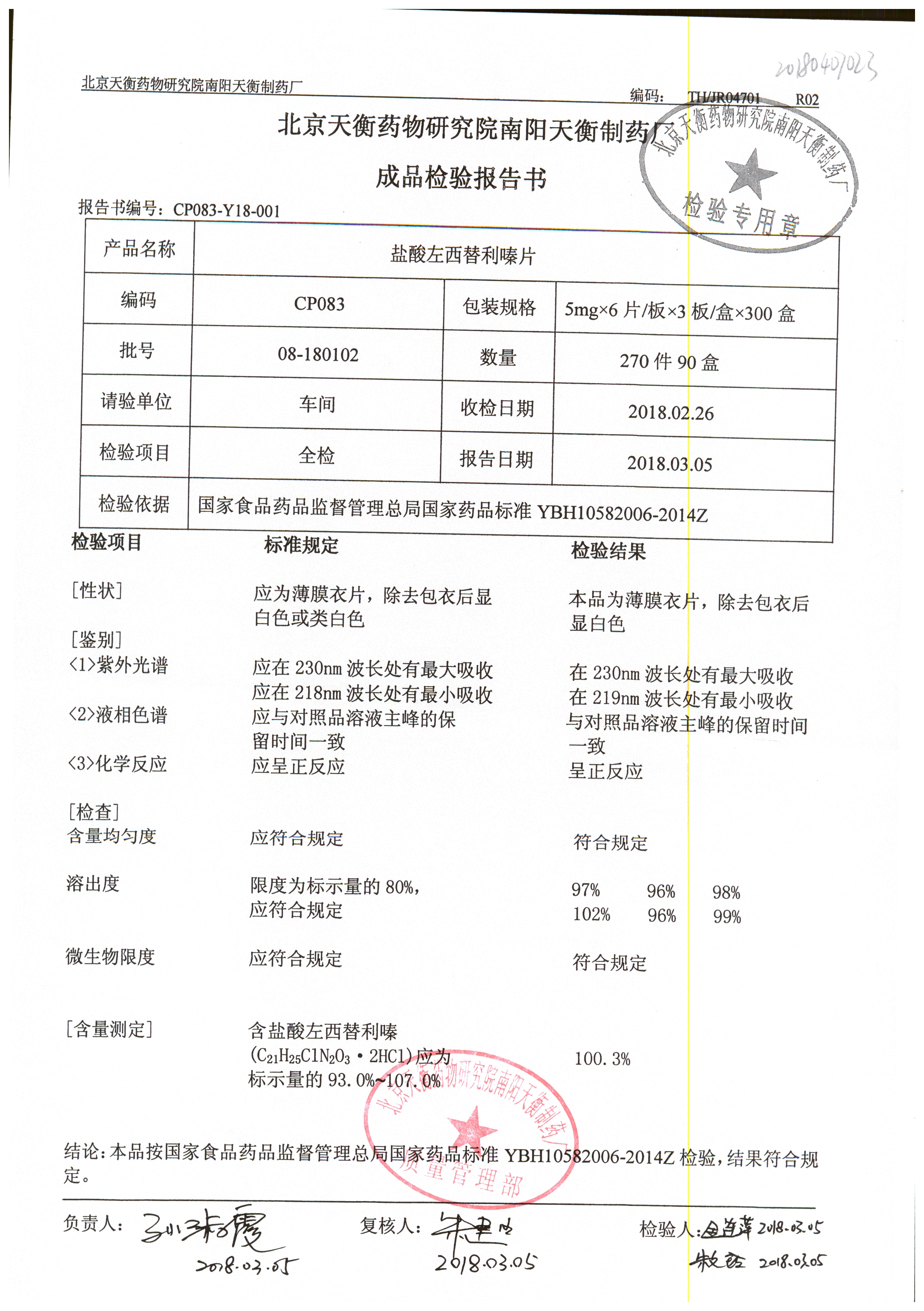 | 鹽酸左西替利嗪片 | 5mg*18s | 08-180901 | 查看詳情 |