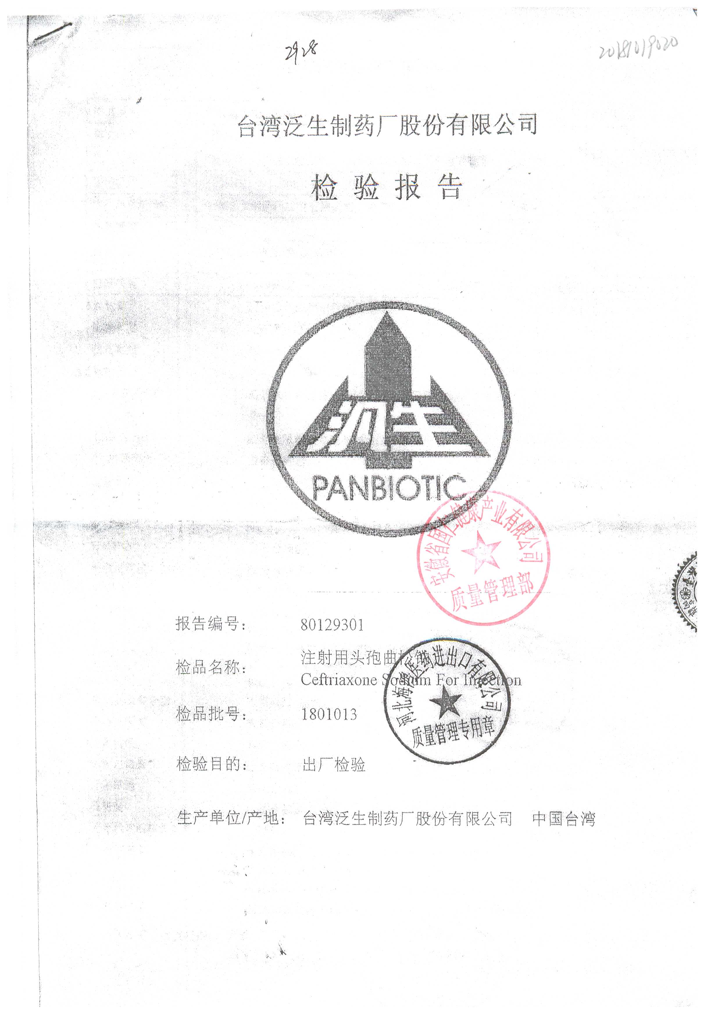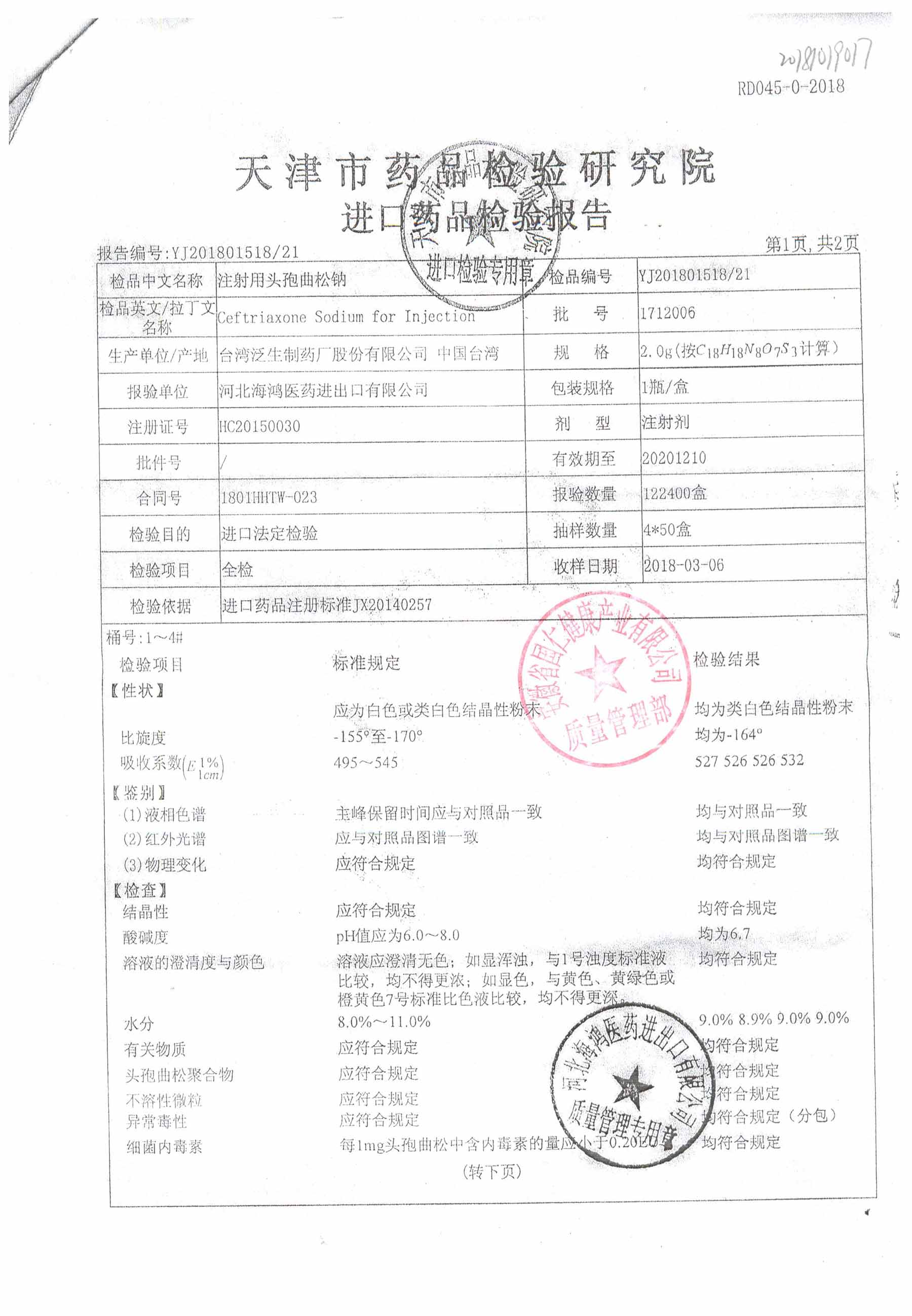 | 注射用頭孢曲松鈉 | 2.0g | 1801013(3/3) | 查看詳情 |