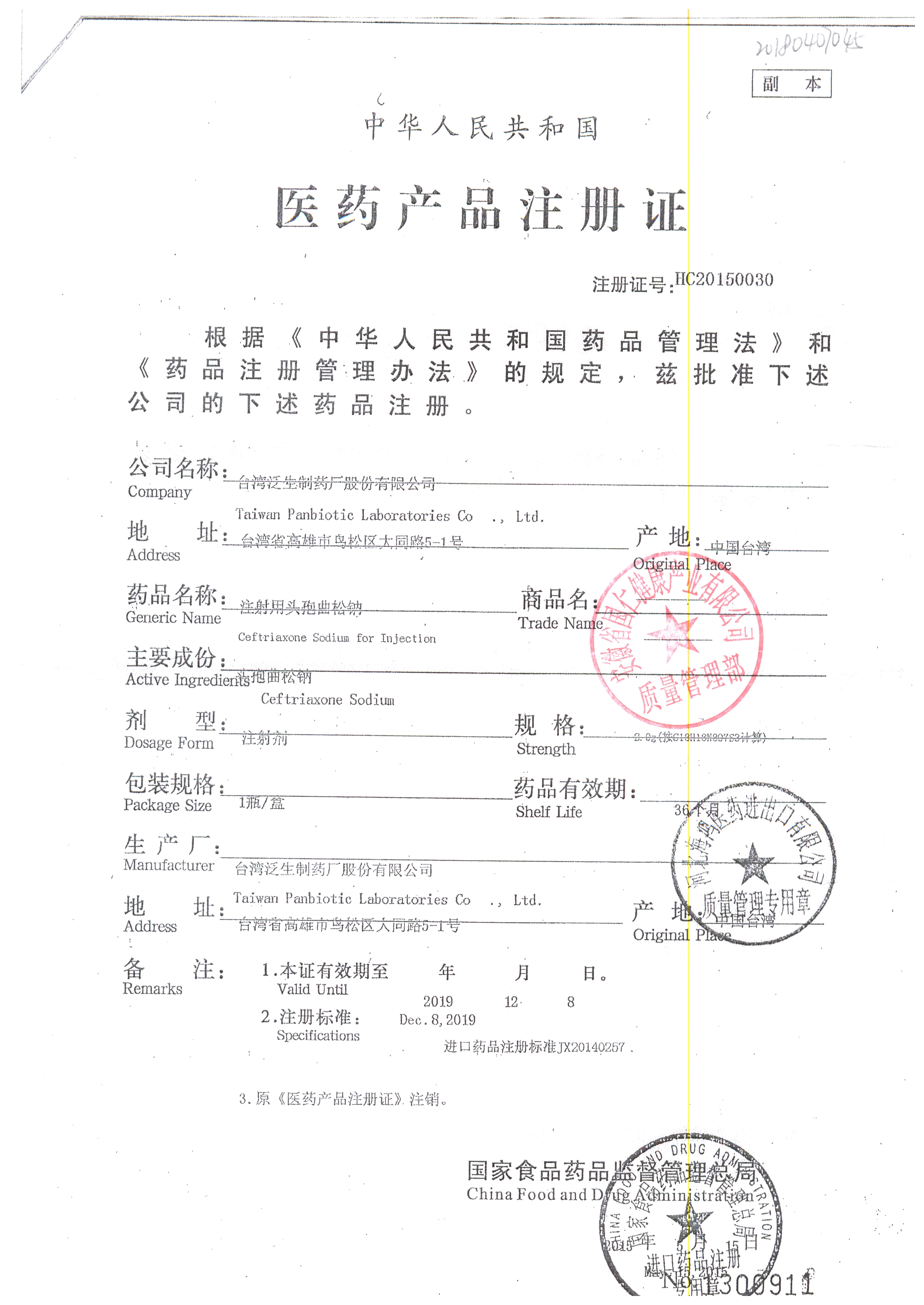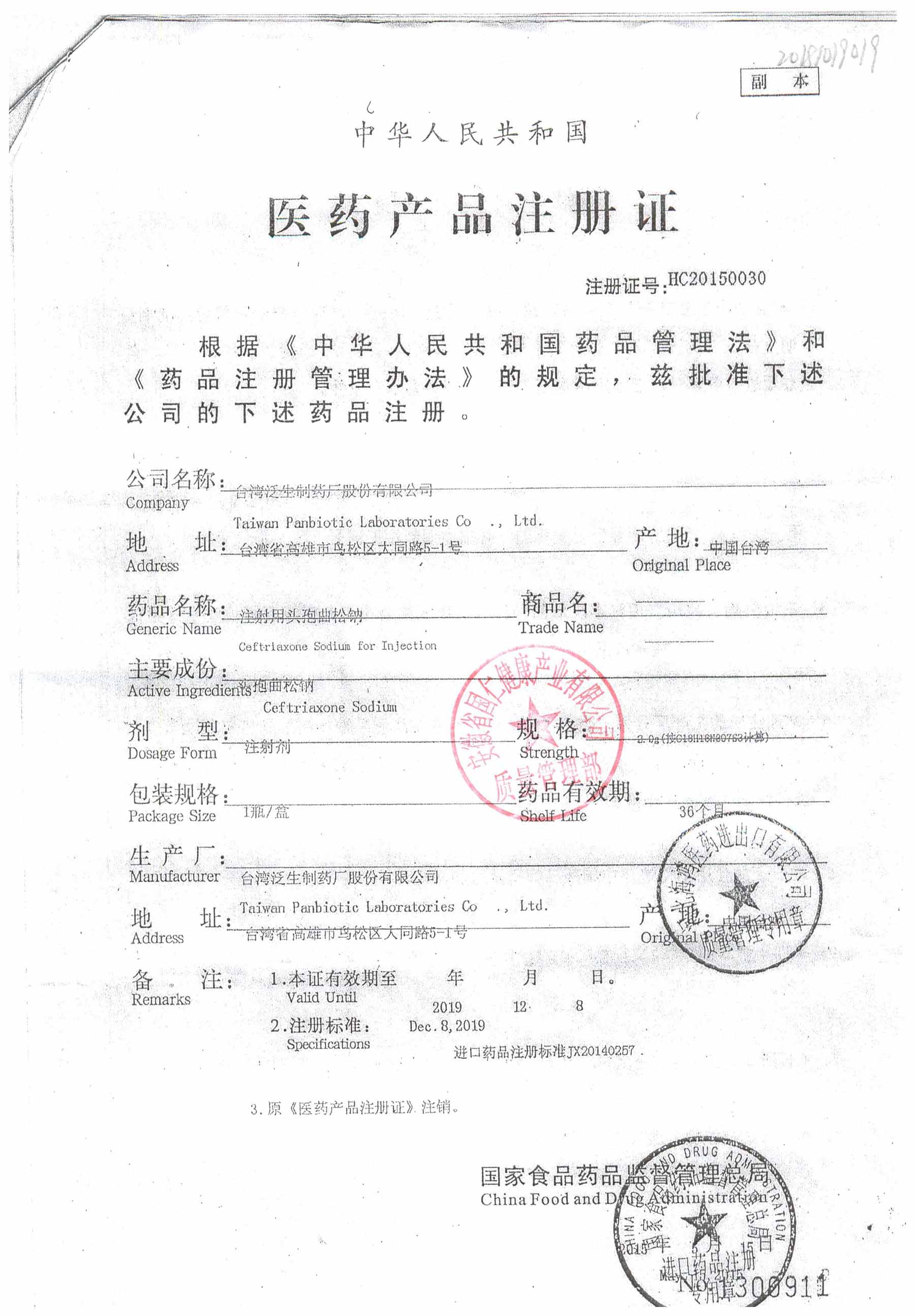| 注射用頭孢曲松鈉 | 2.0g | 1903007(5/5) | 查看詳情 |