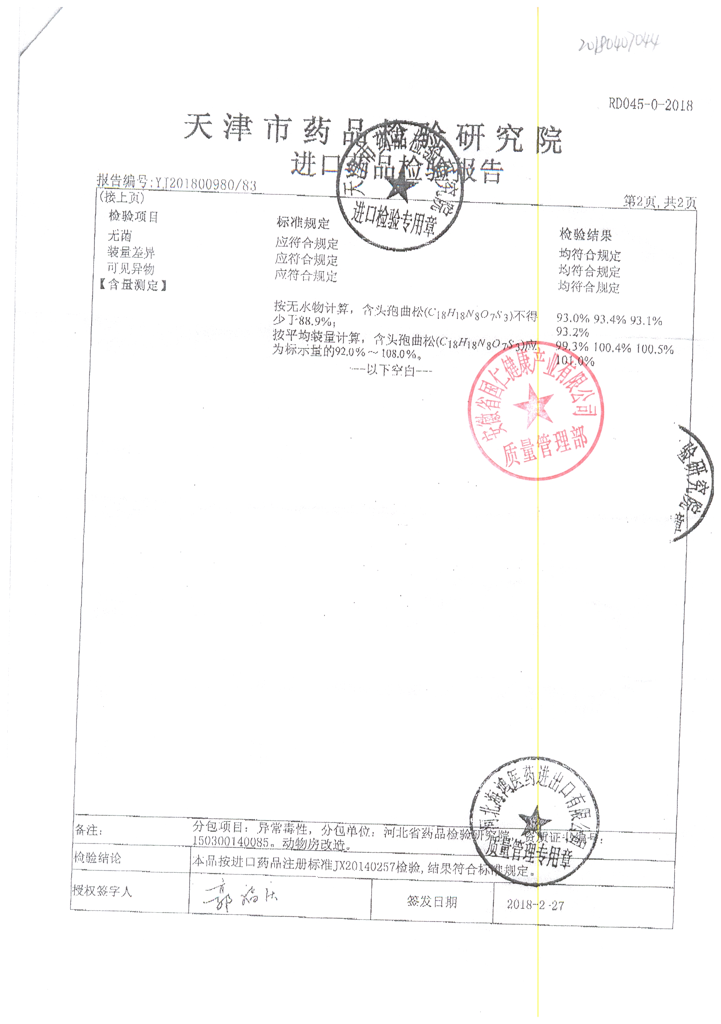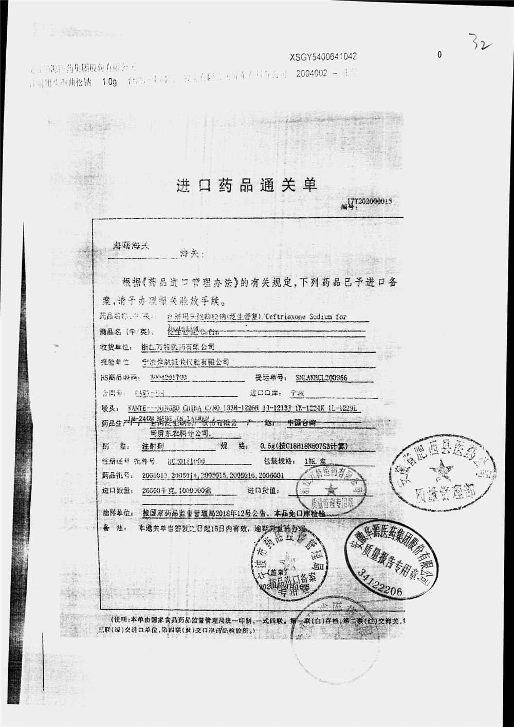 | 注射用頭孢曲松鈉 | 2.0g | 2004003(3/4) | 查看詳情 |