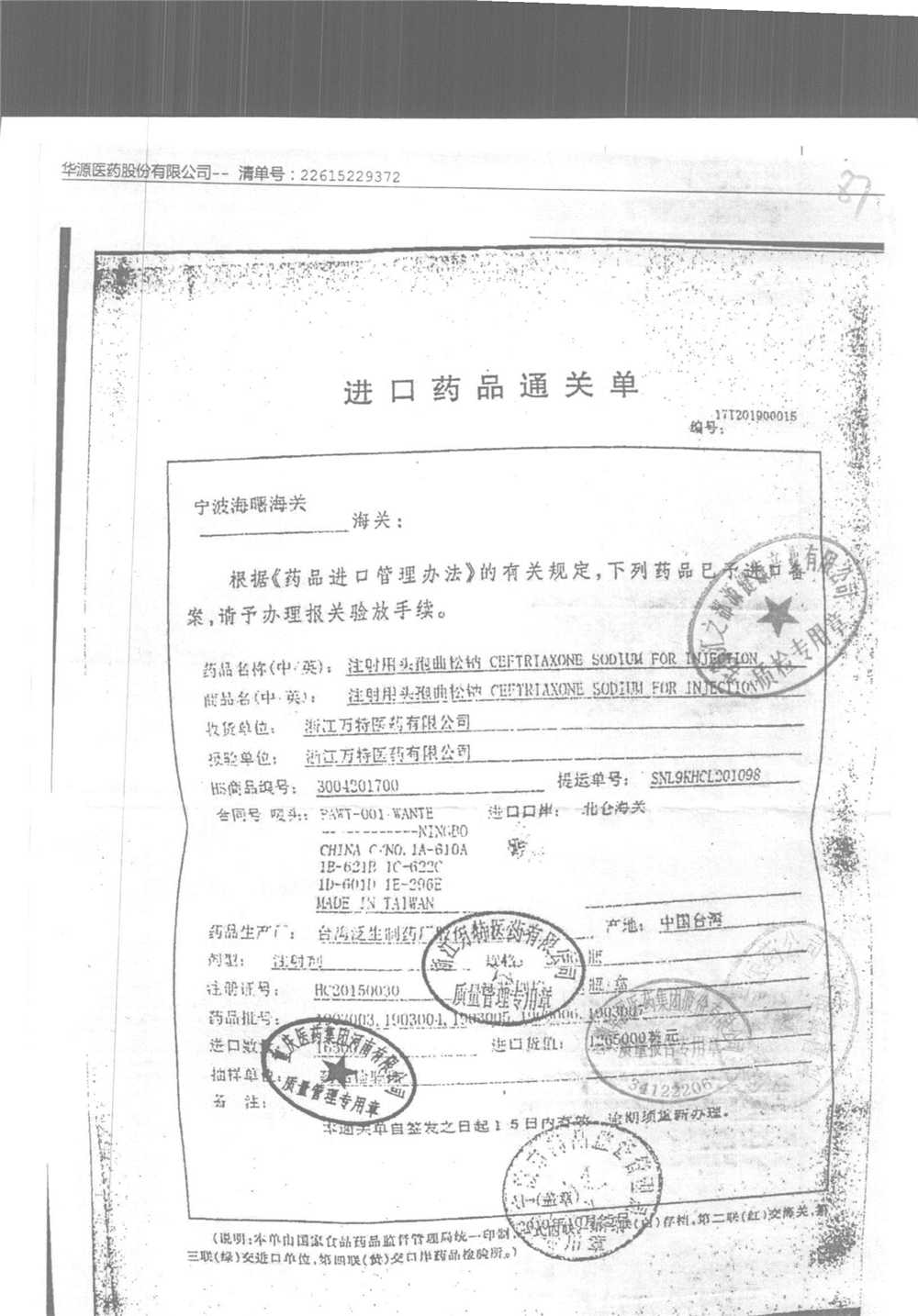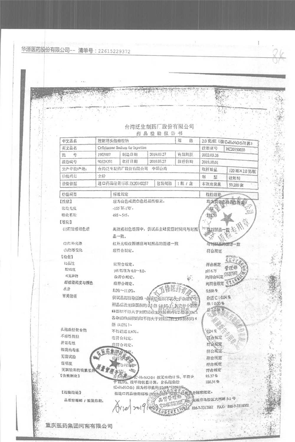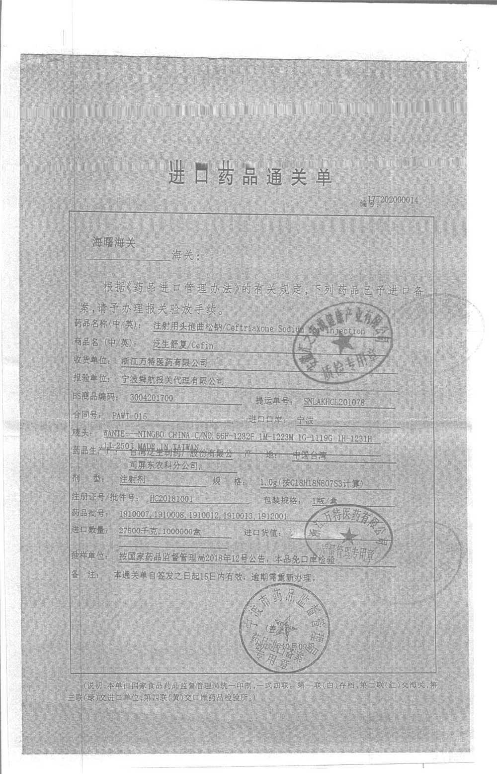 | 注射用頭孢曲松鈉 | 2.0g | 1903007(2/5) | 查看詳情 |