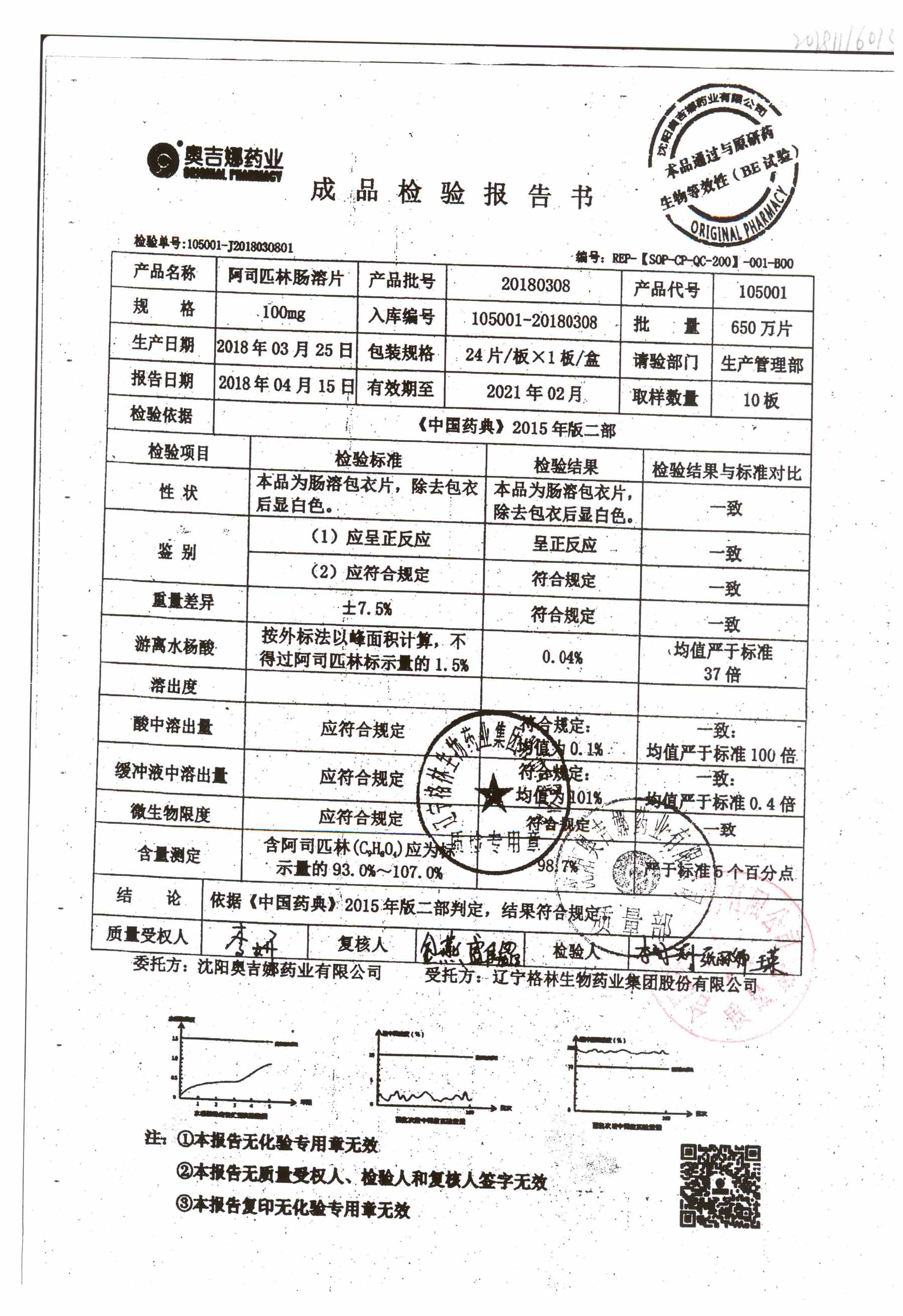 | 阿司匹林腸溶片 | 100mg*24s | 20180308 | 查看詳情 |