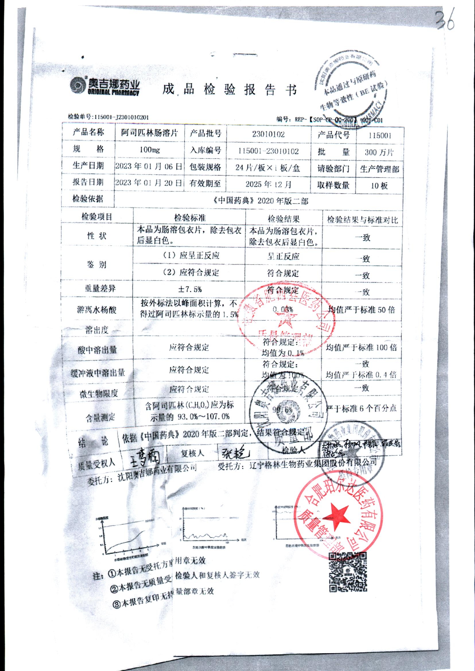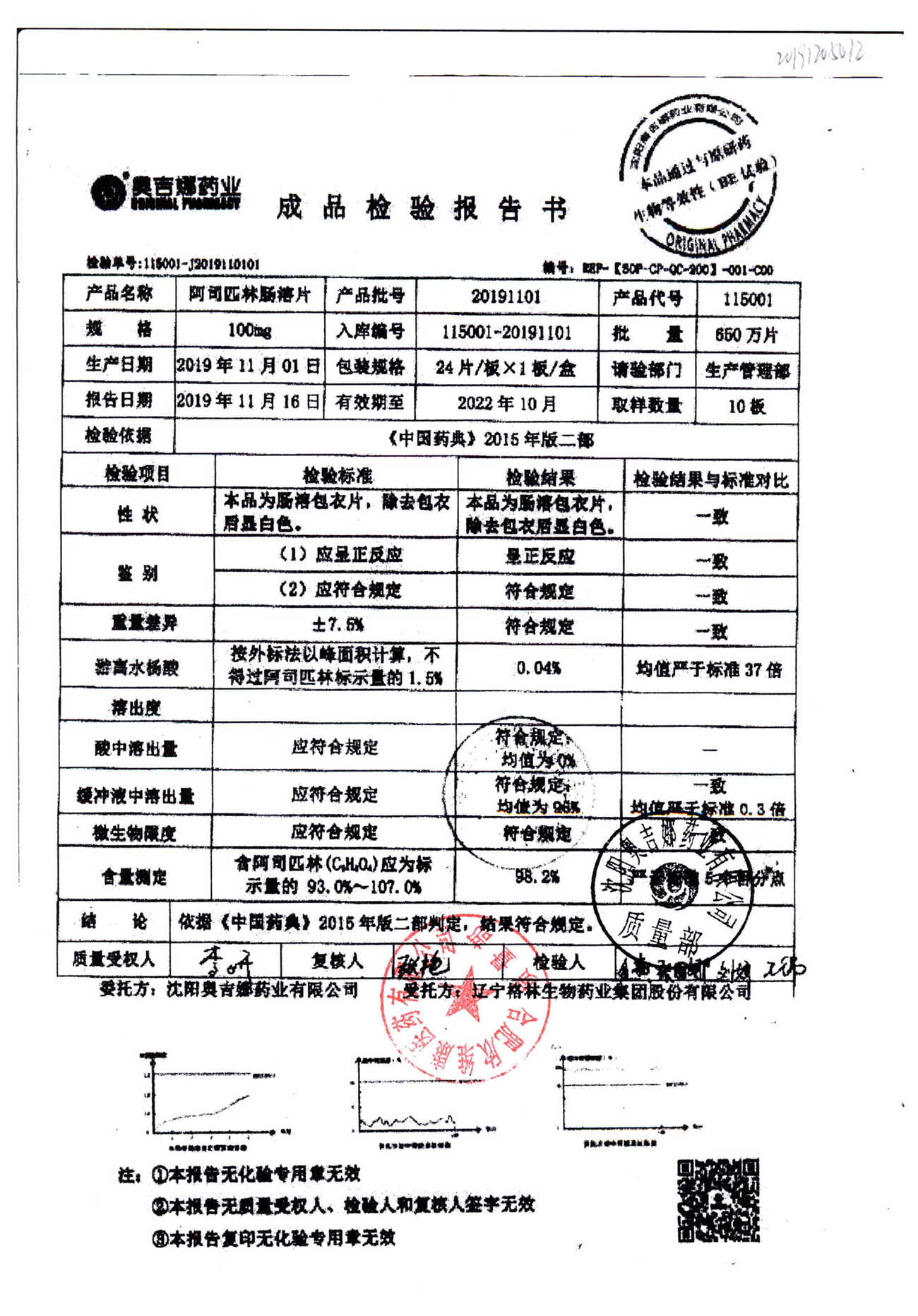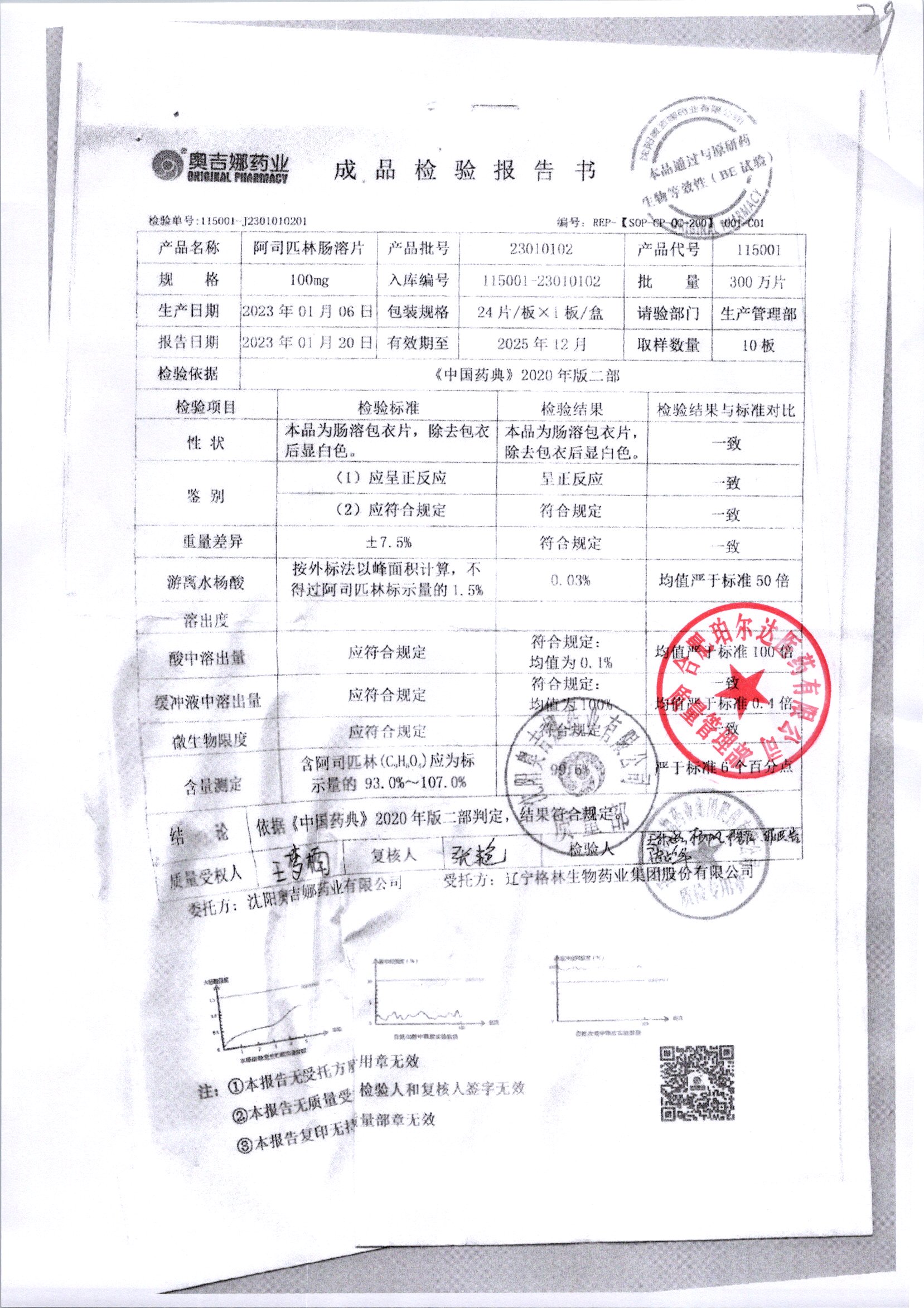 | 阿司匹林腸溶片 | 100mg*24s | 20191210 | 查看詳情 |