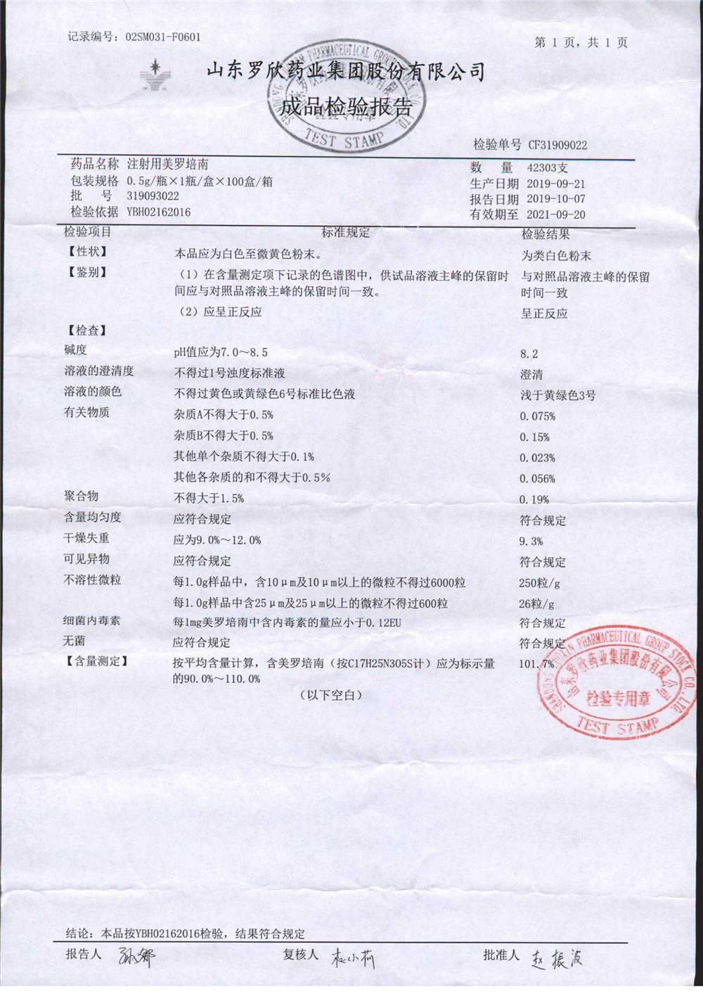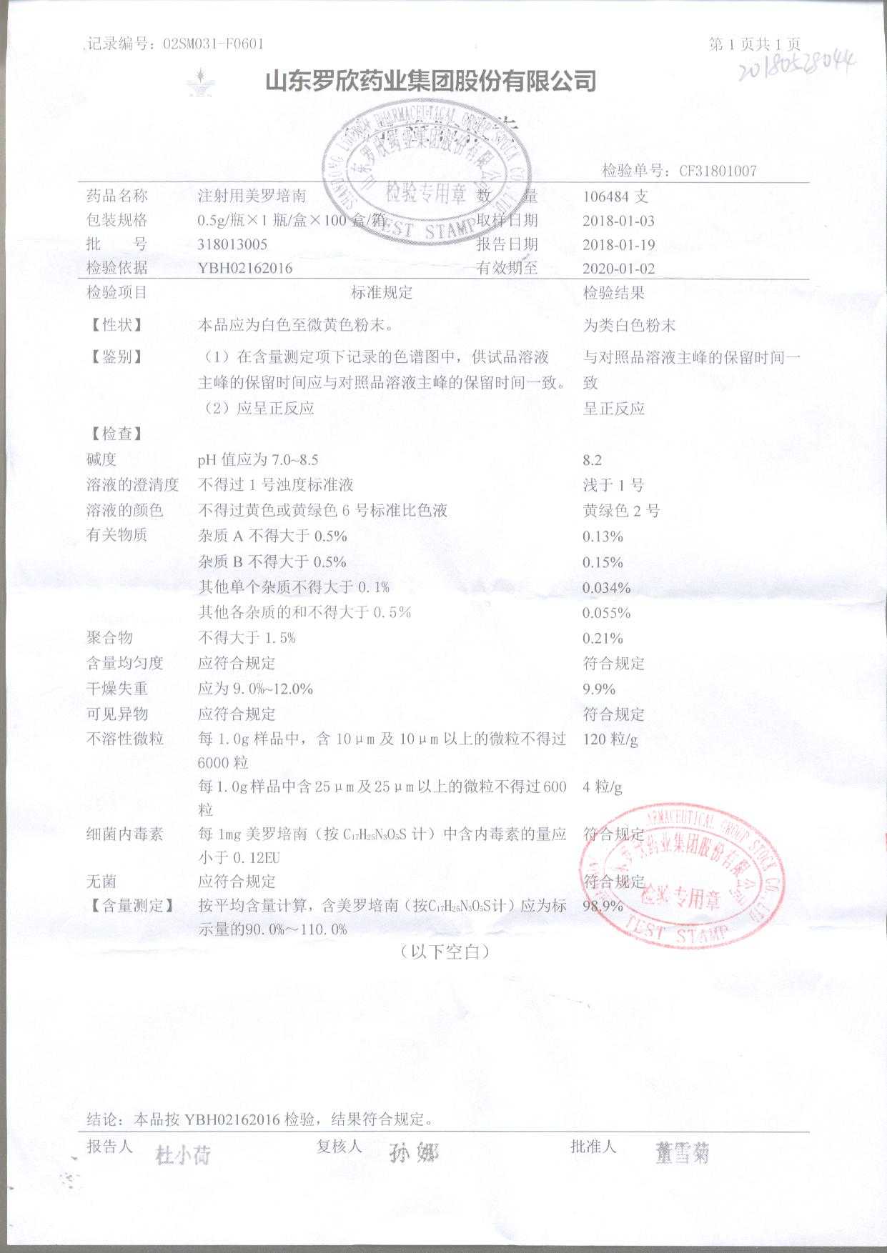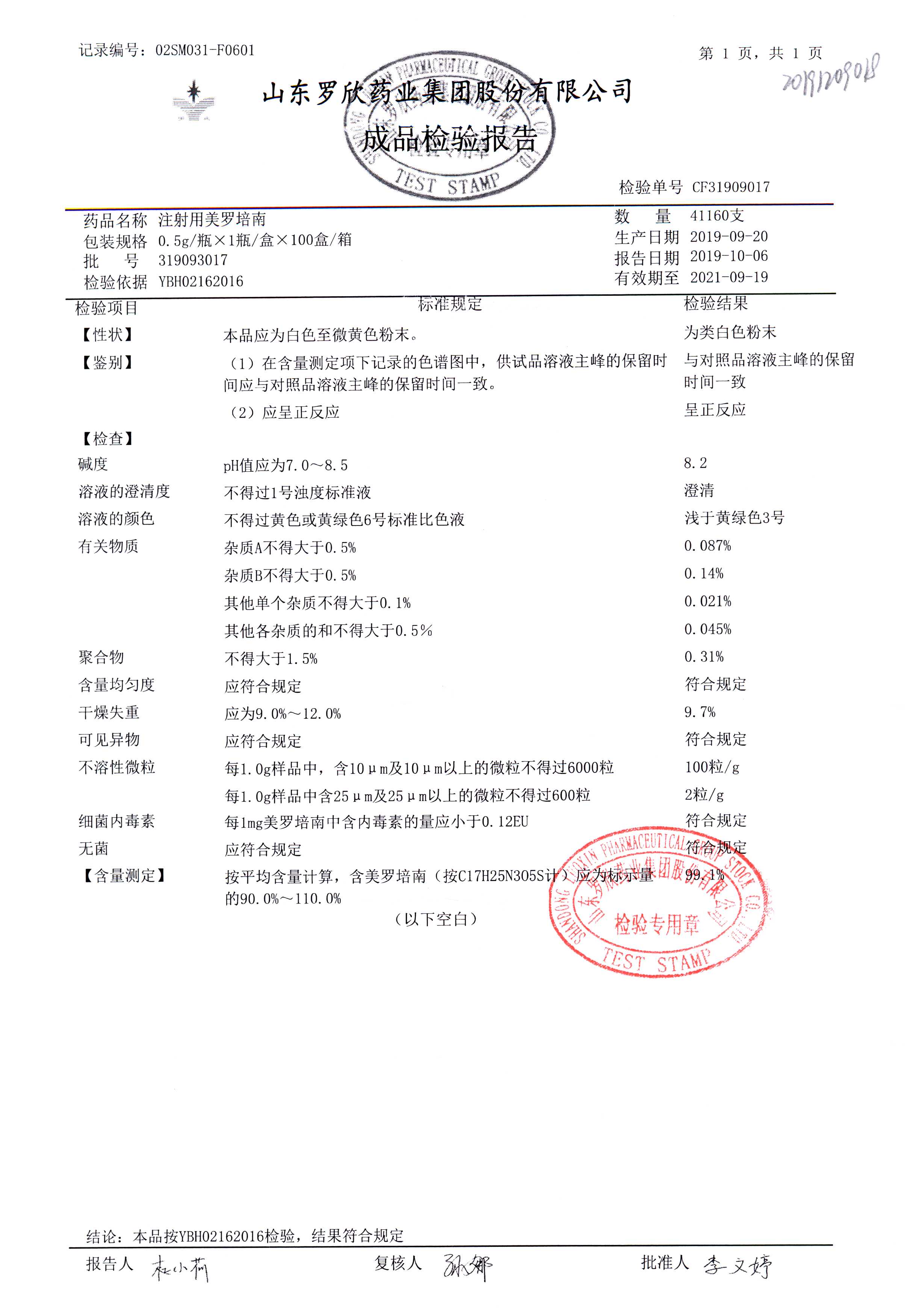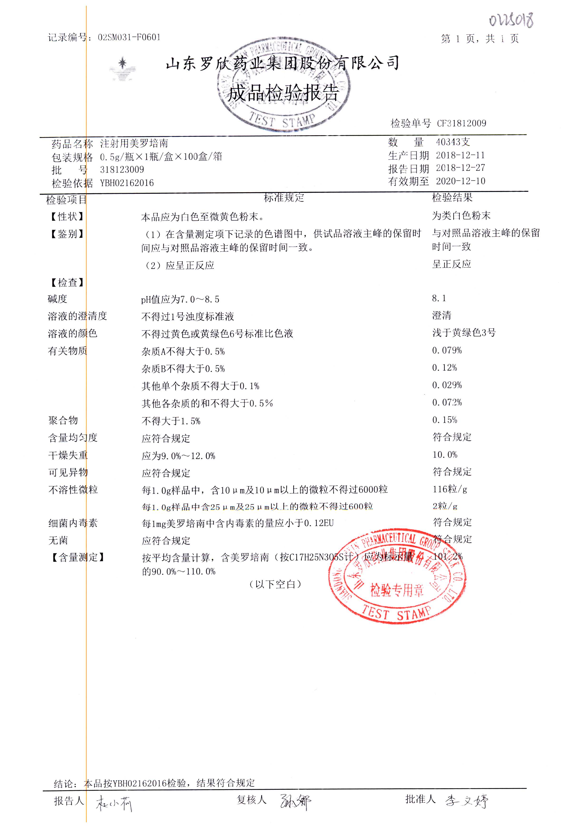 | 注射用美羅培南 | 0.5g | 318013004 | 查看詳情 |