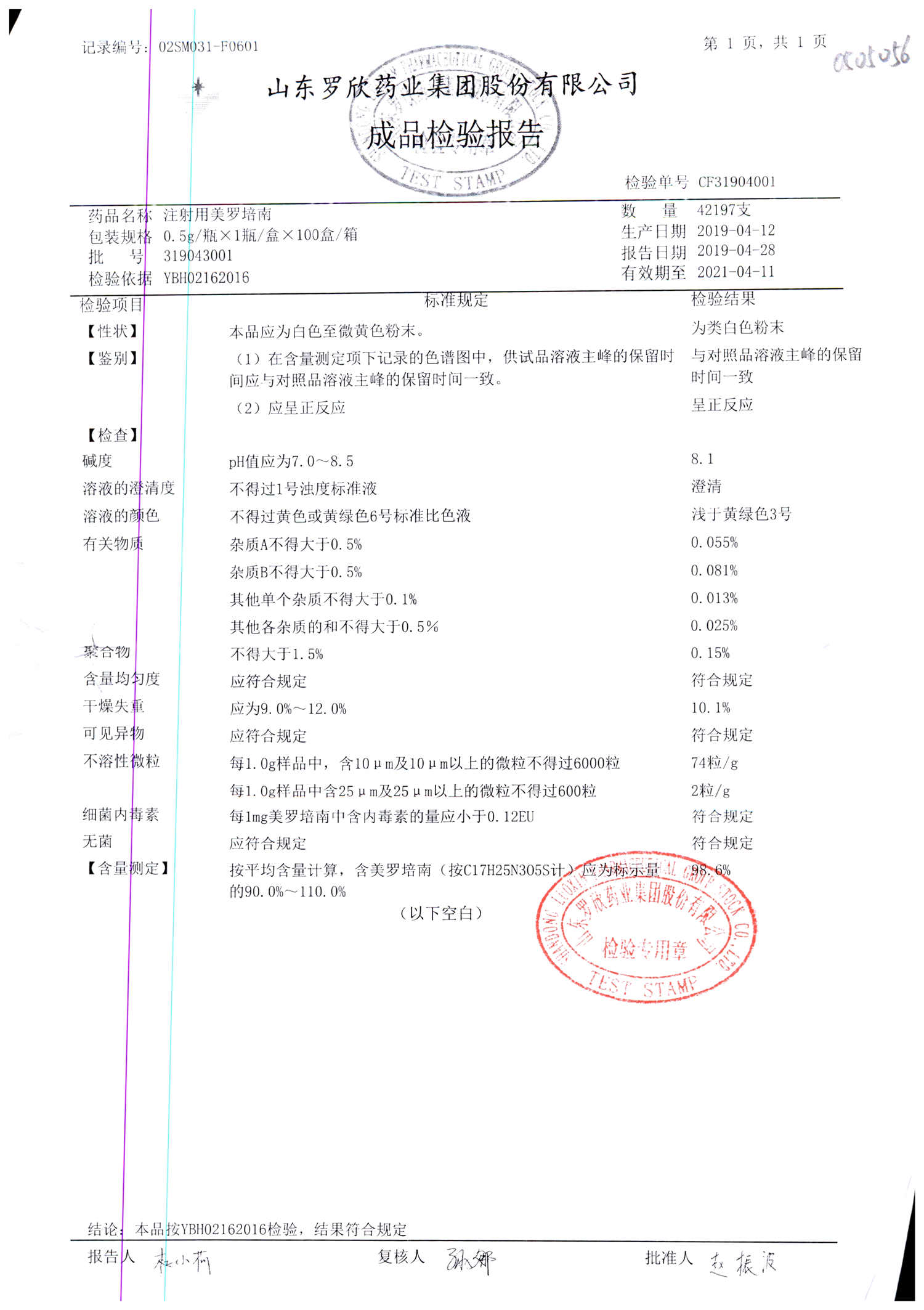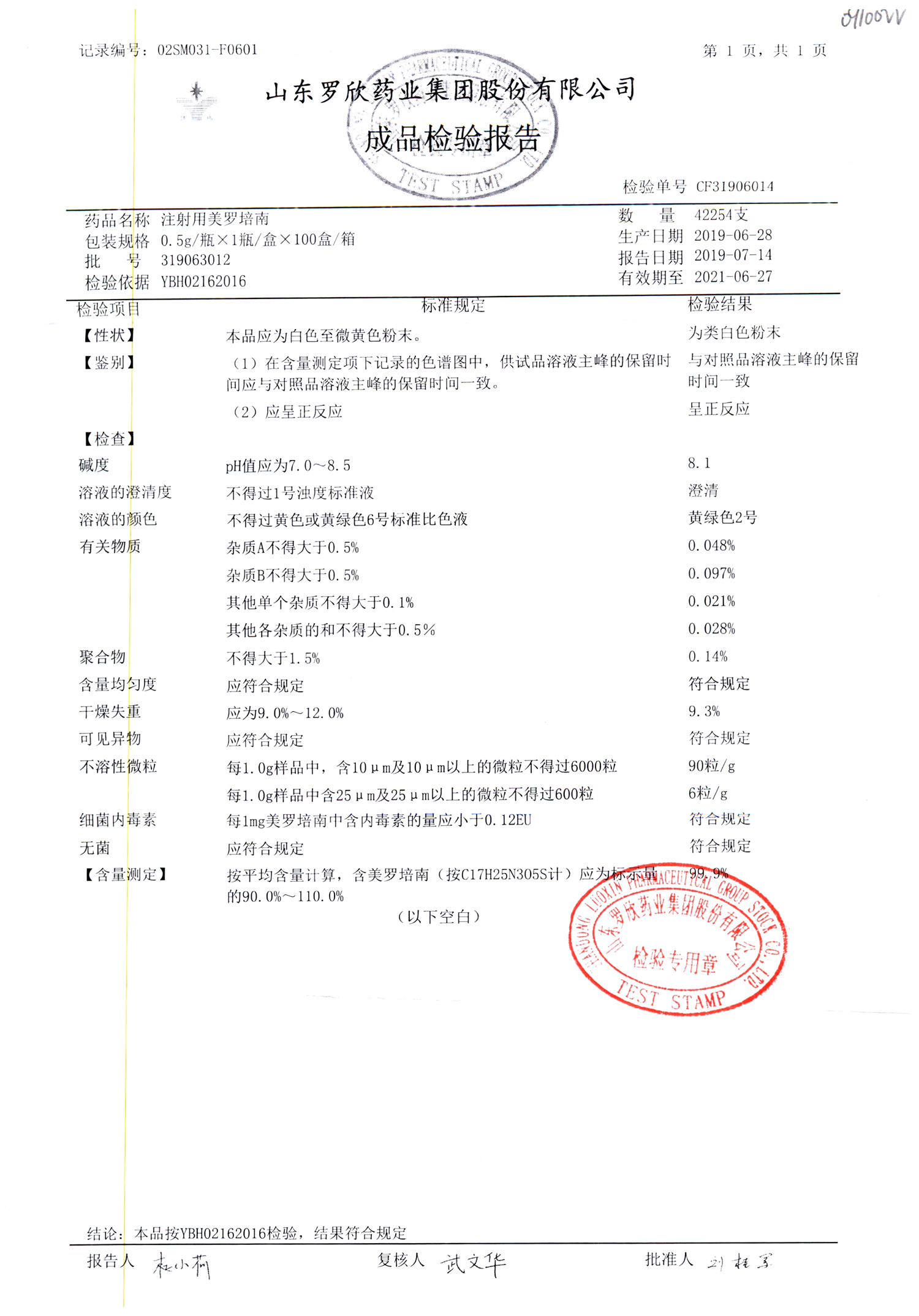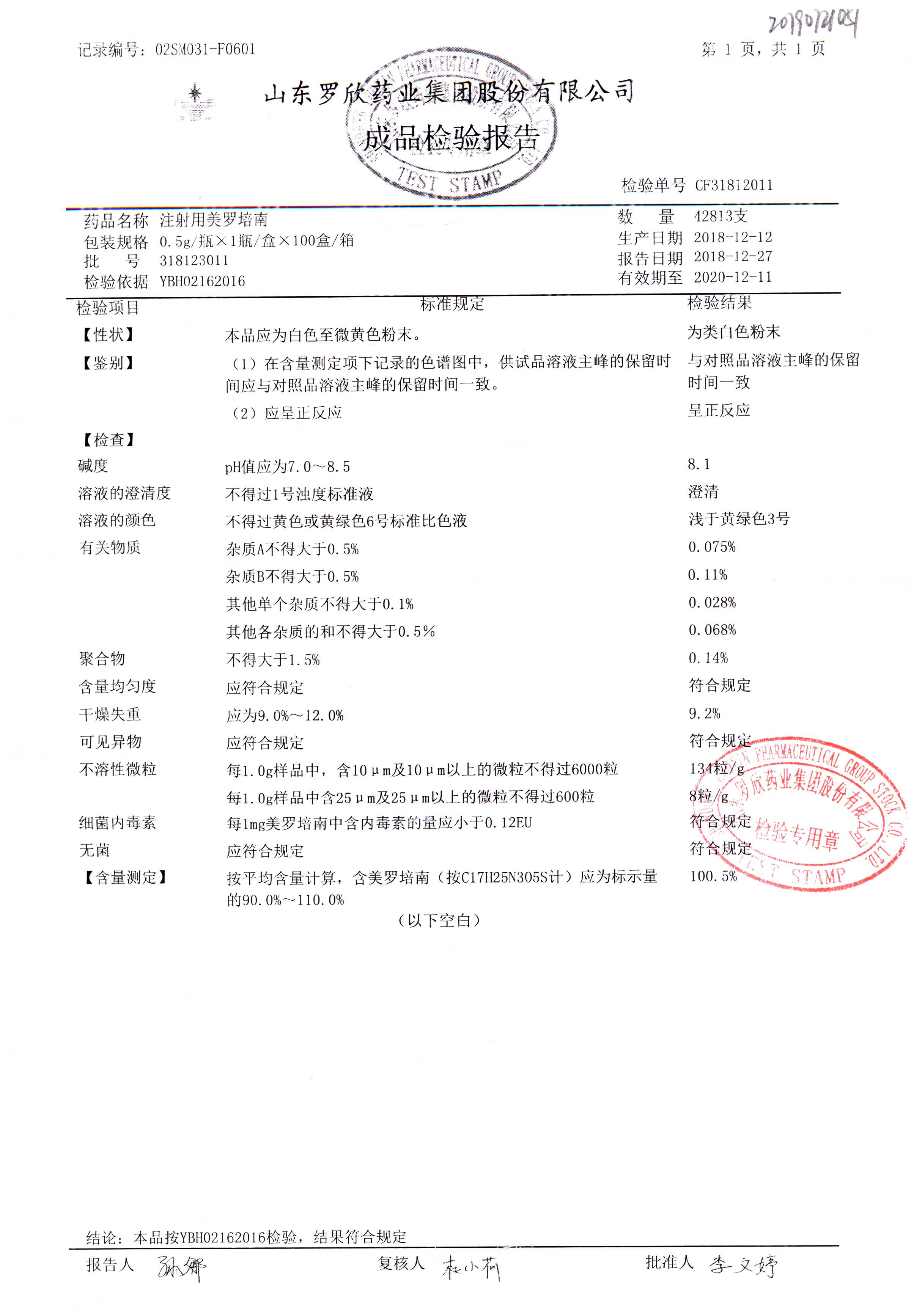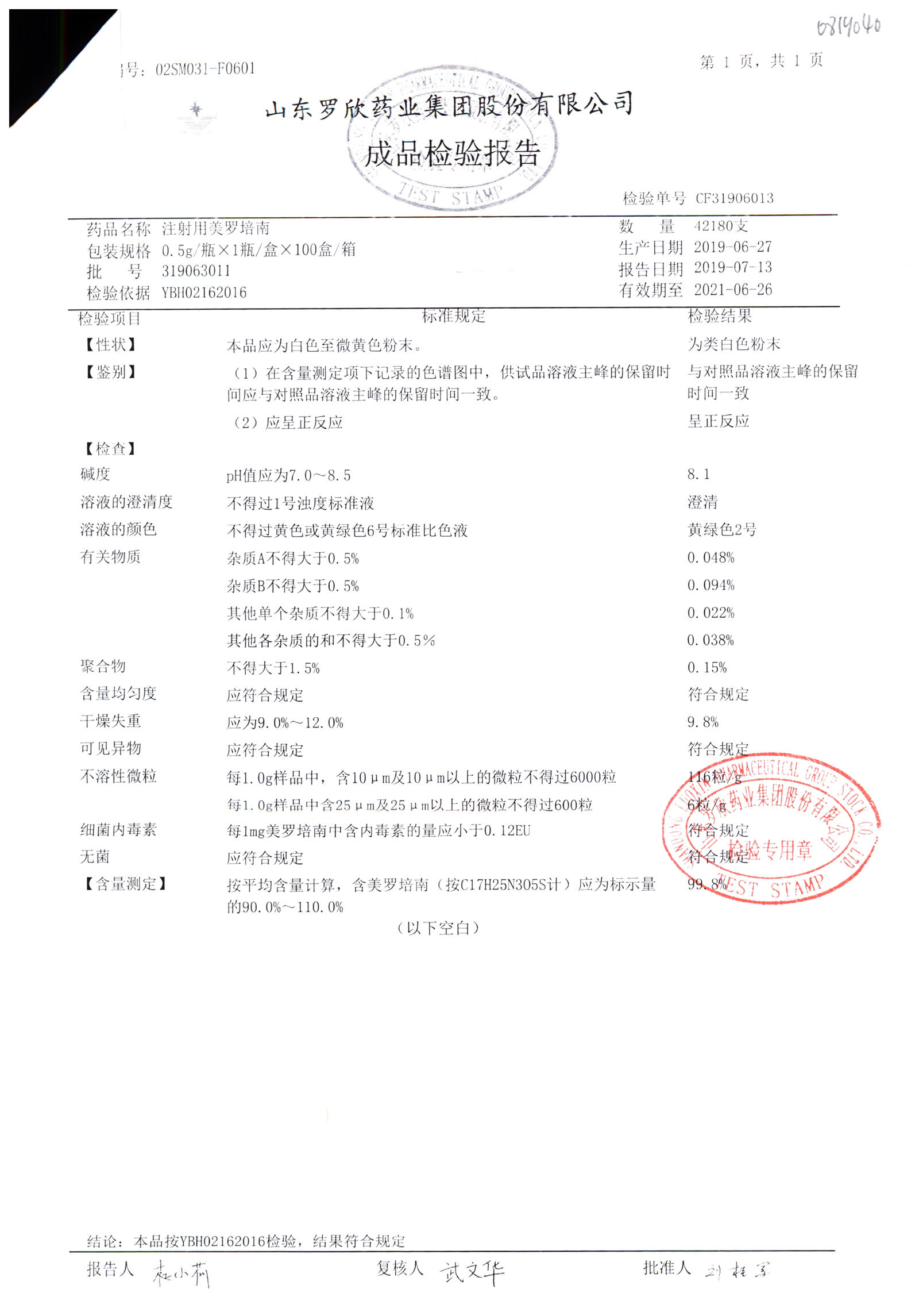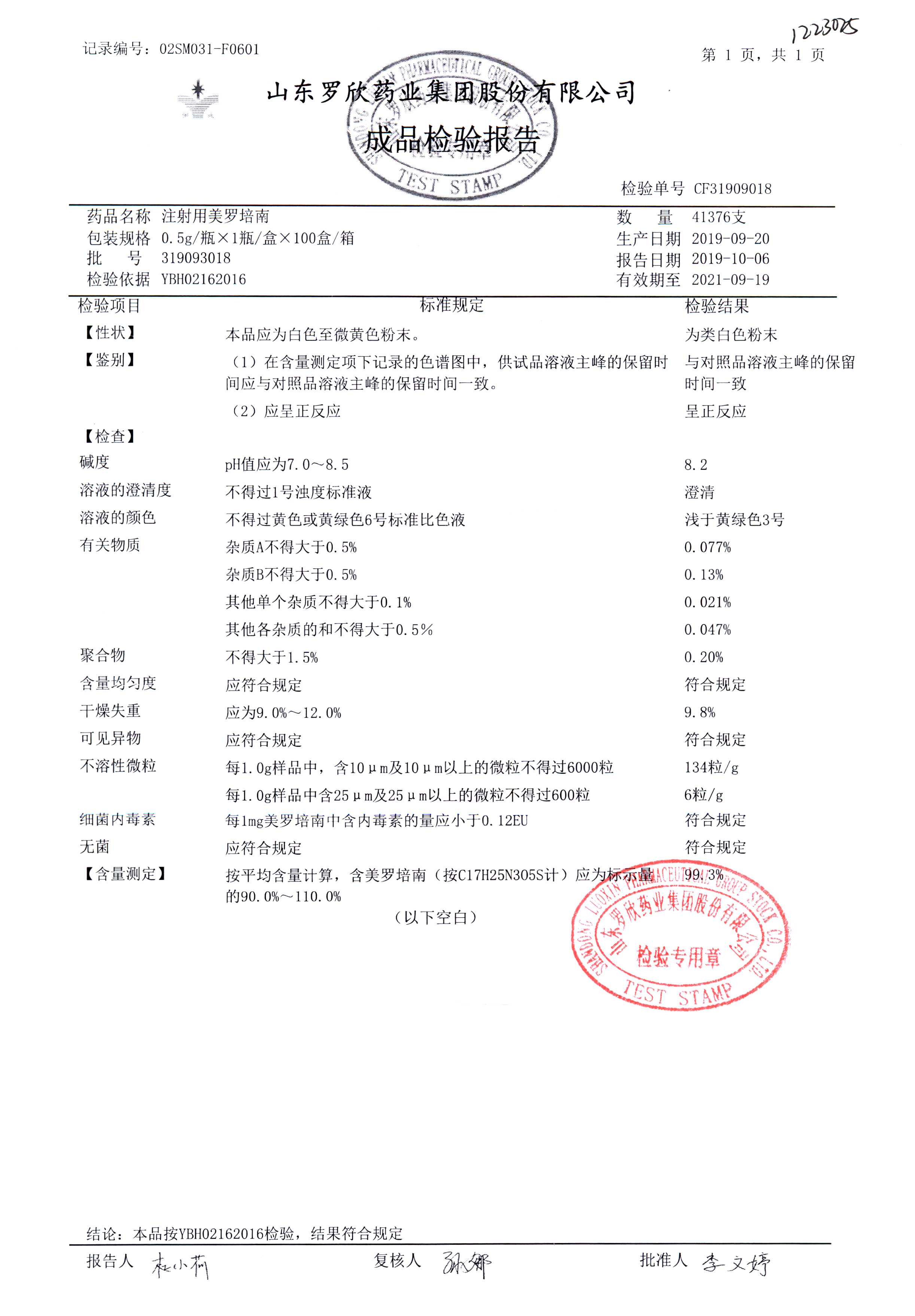 | 注射用美羅培南 | 0.5g | 318013004 | 查看詳情 |
