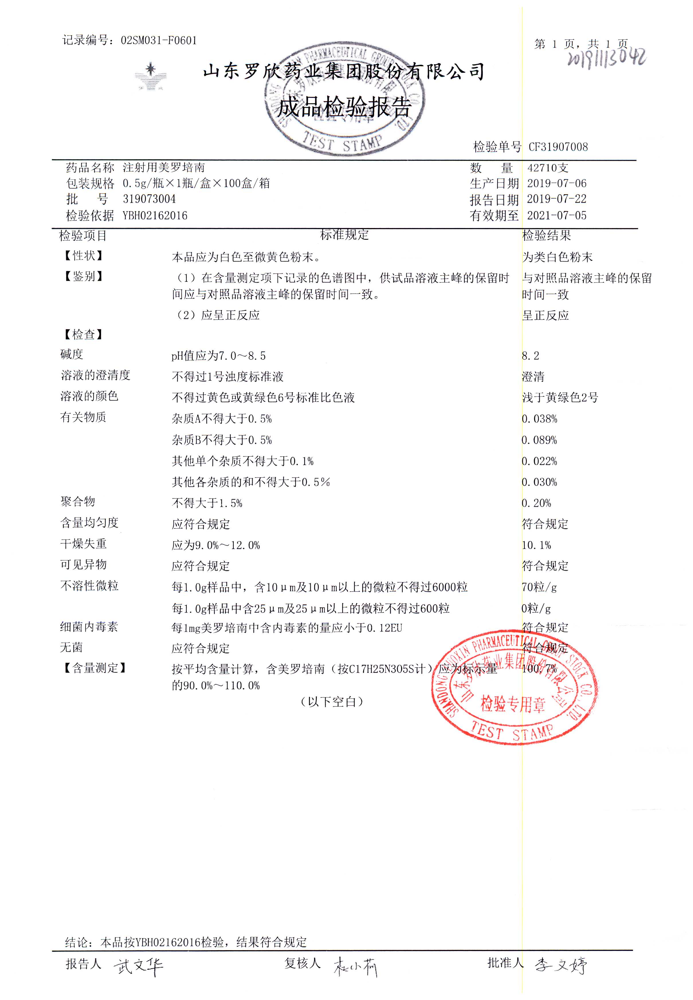 | 注射用美羅培南 | 0.5g | 319043002 | 查看詳情 |