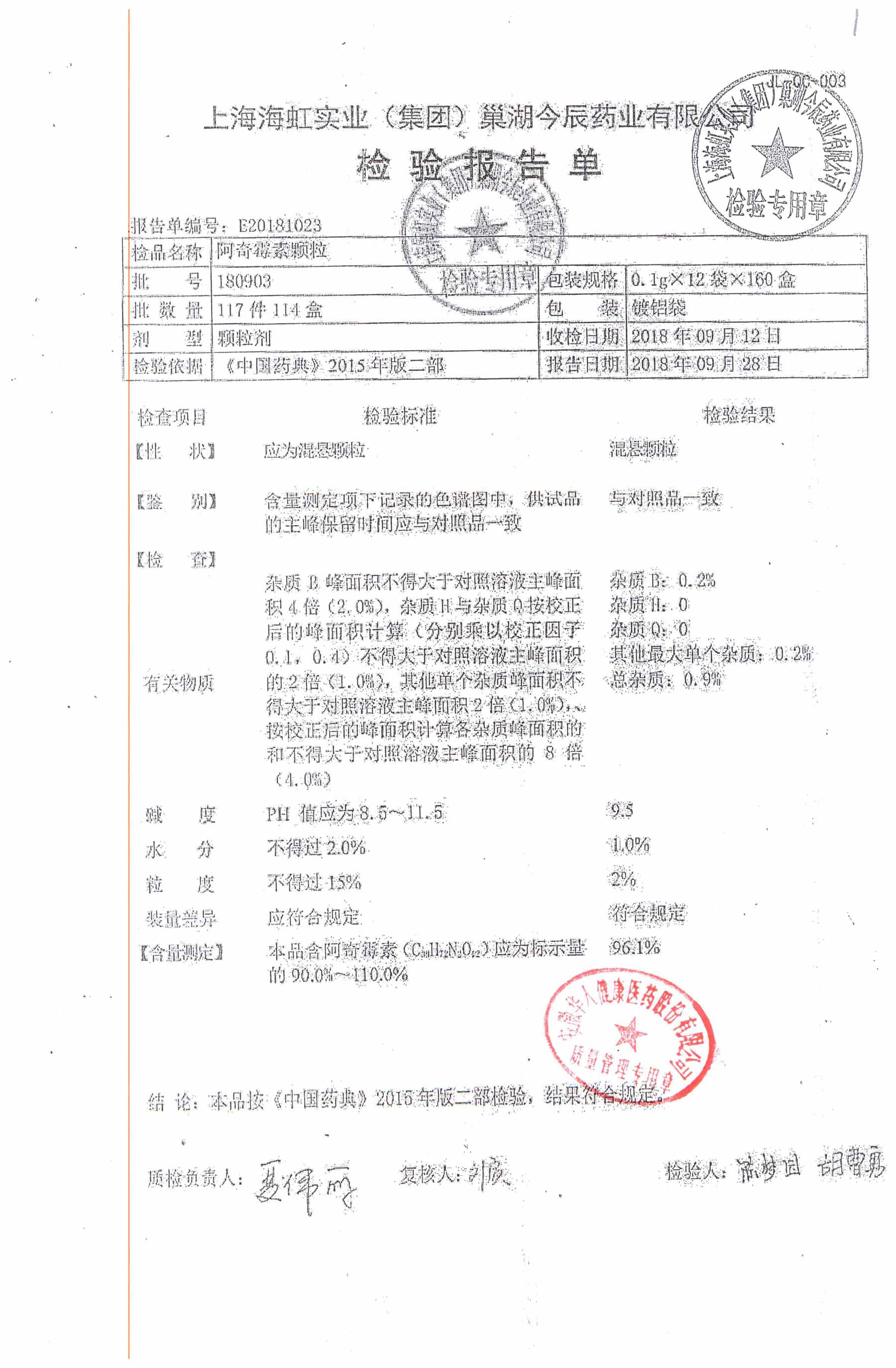 | 阿奇霉素顆粒 | 0.1g-12袋 | 180903 | 查看詳情 |