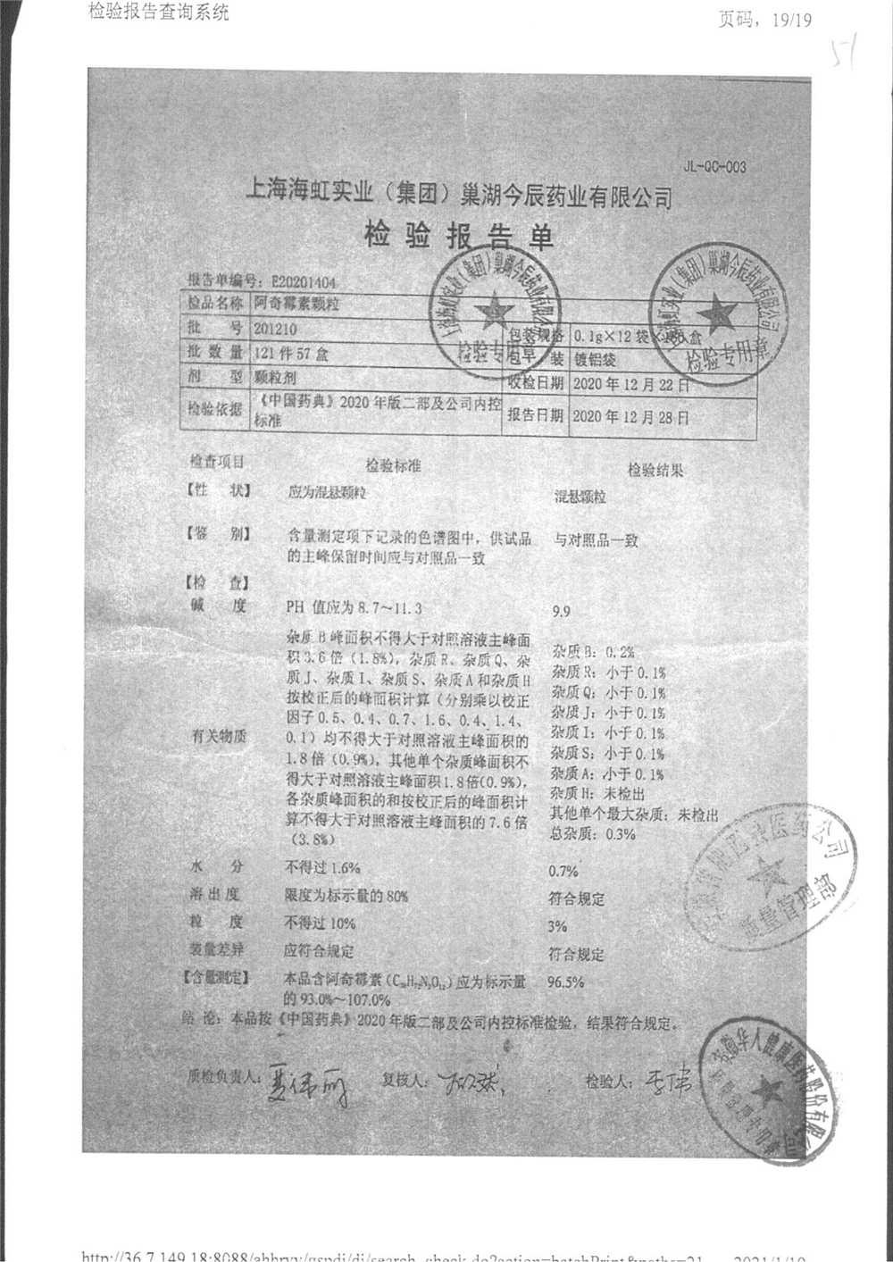 | 阿奇霉素顆粒 | 0.1g-12袋 | 190226 | 查看詳情 |