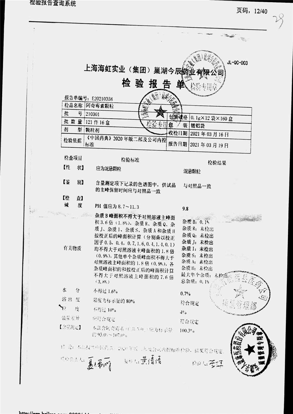 | 阿奇霉素顆粒 | 0.1g-12袋 | 201210 | 查看詳情 |