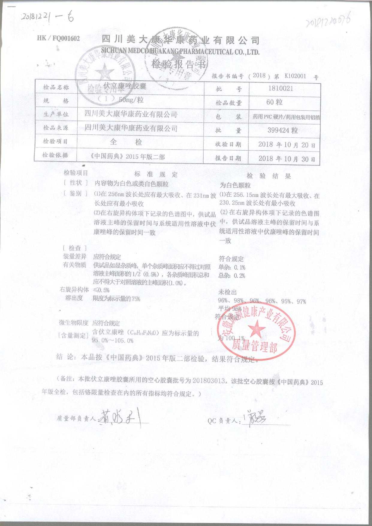 | 伏立康唑膠囊 | 50mg | 1810021 | 查看詳情 |