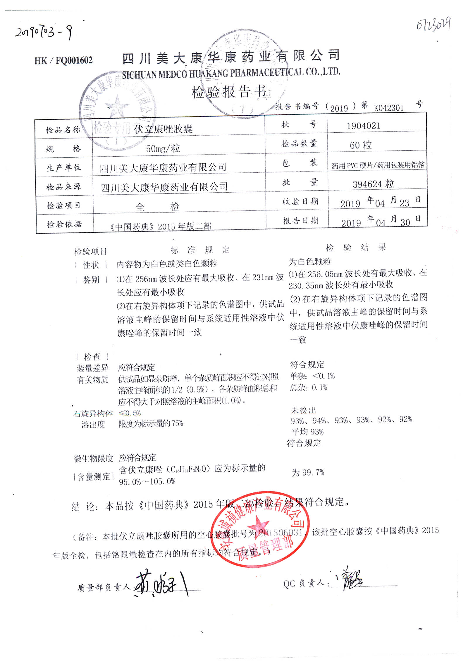 | 伏立康唑膠囊 | 50mg | 1906021 | 查看詳情 |