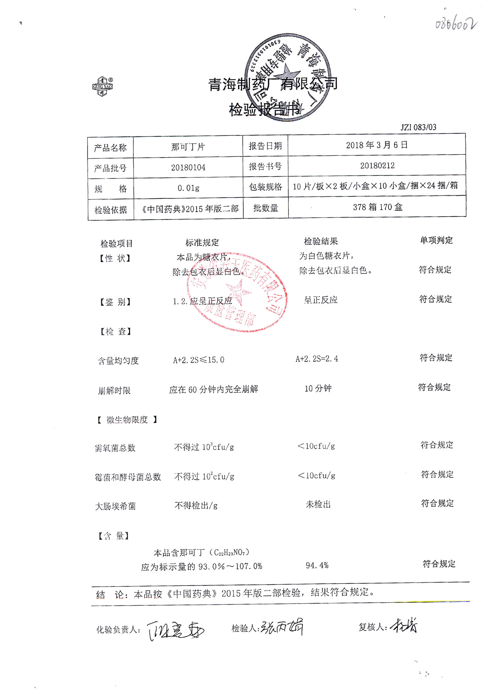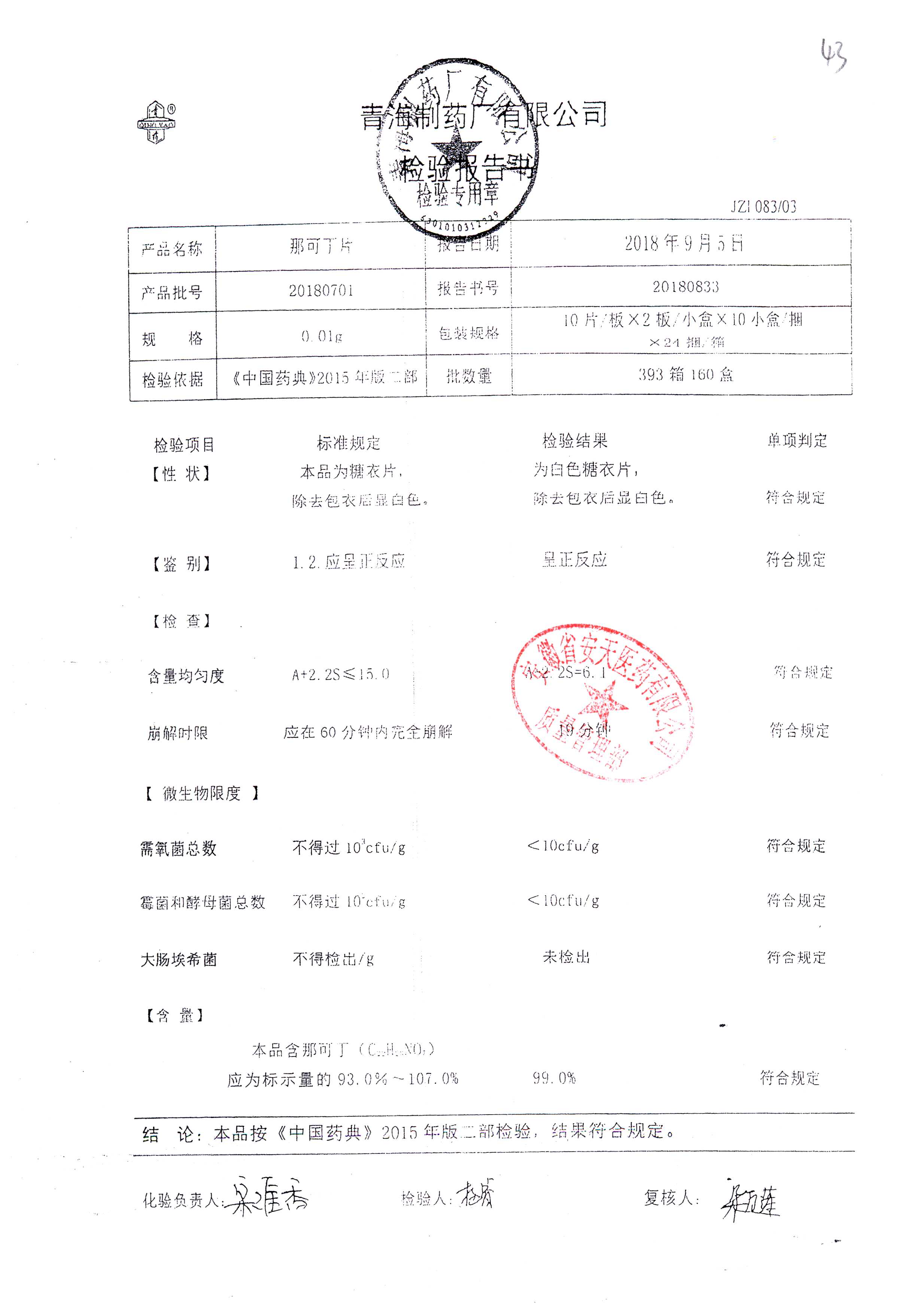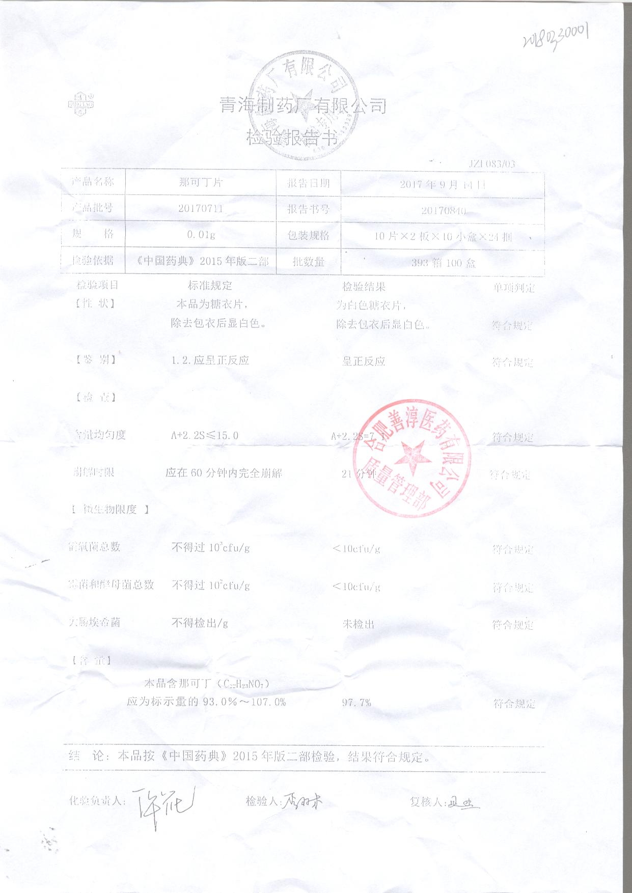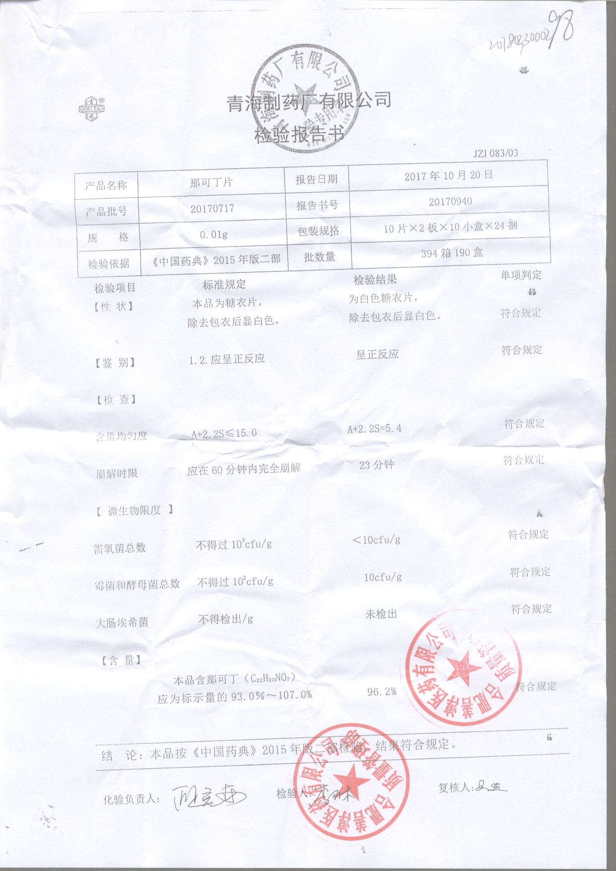 | 那可丁片 | 0.01g | 20180104 | 查看詳情 |