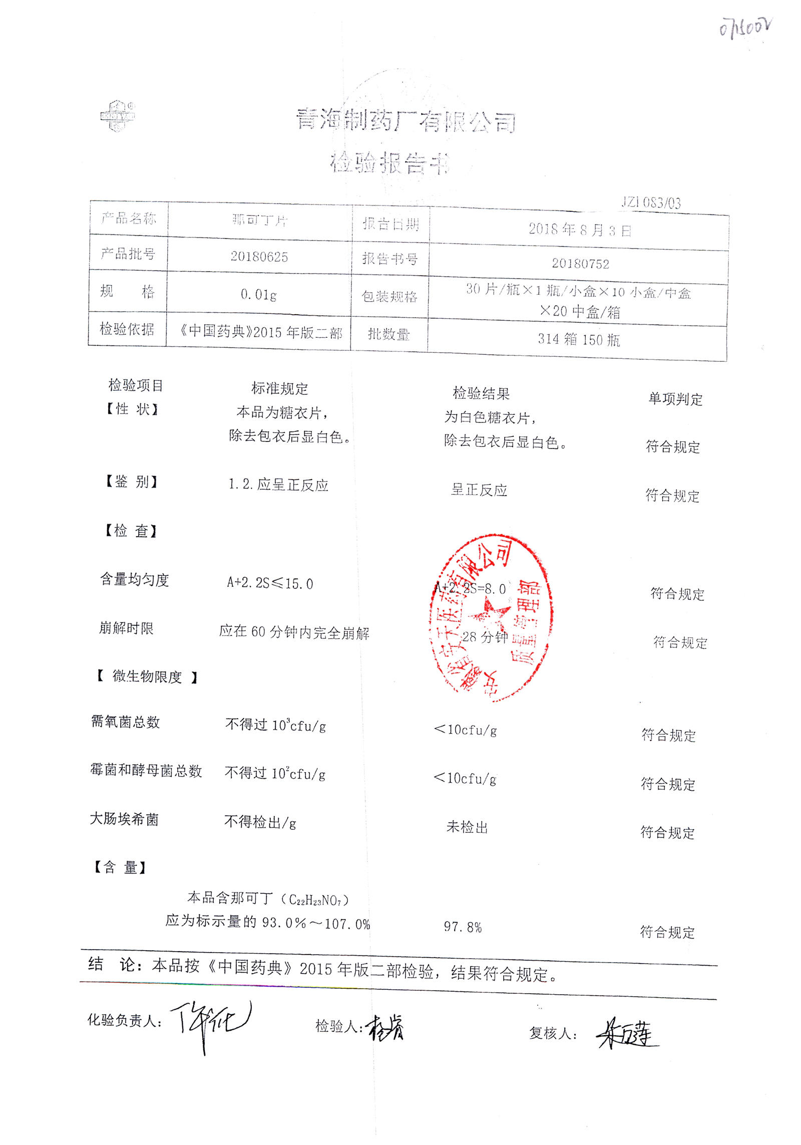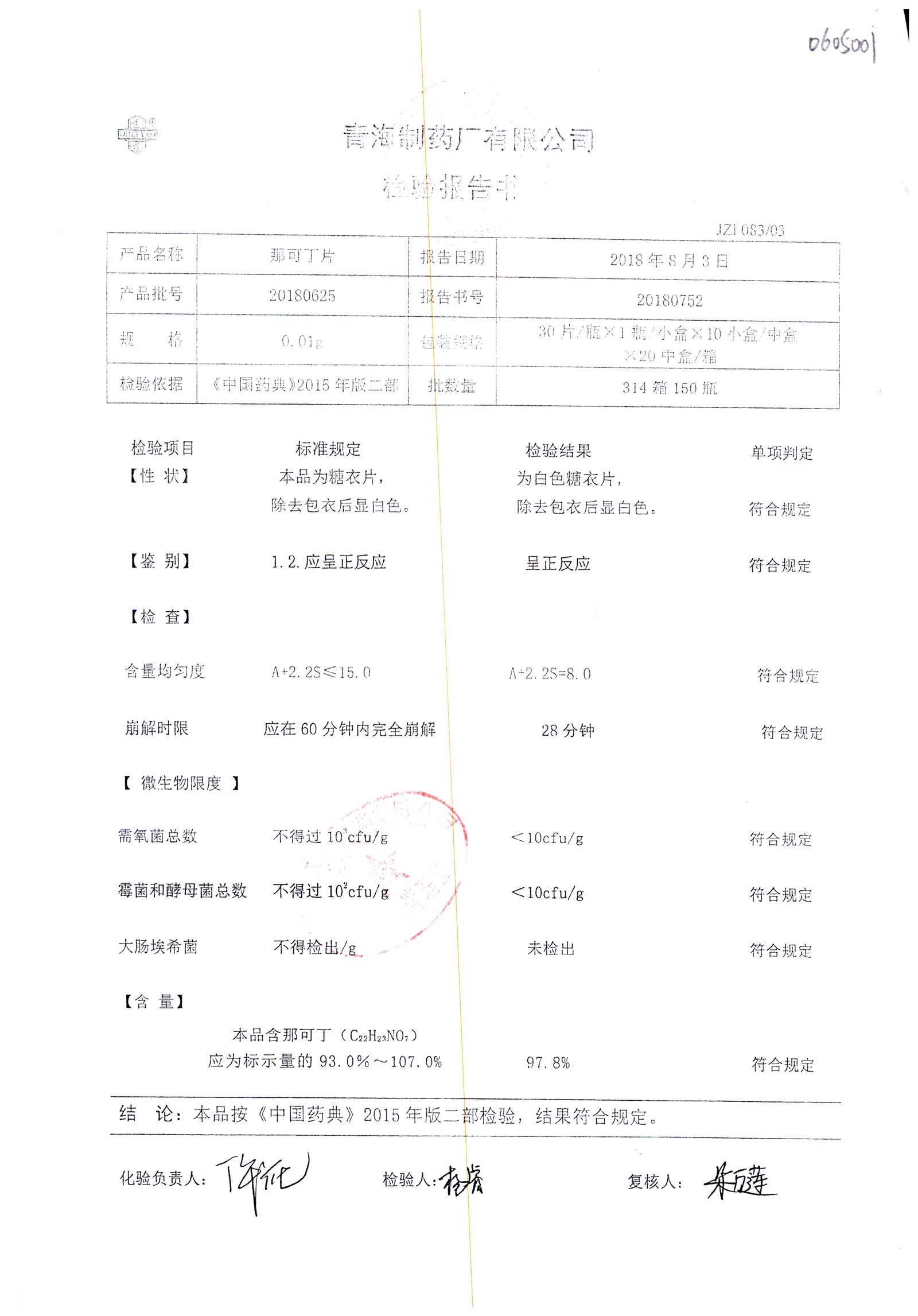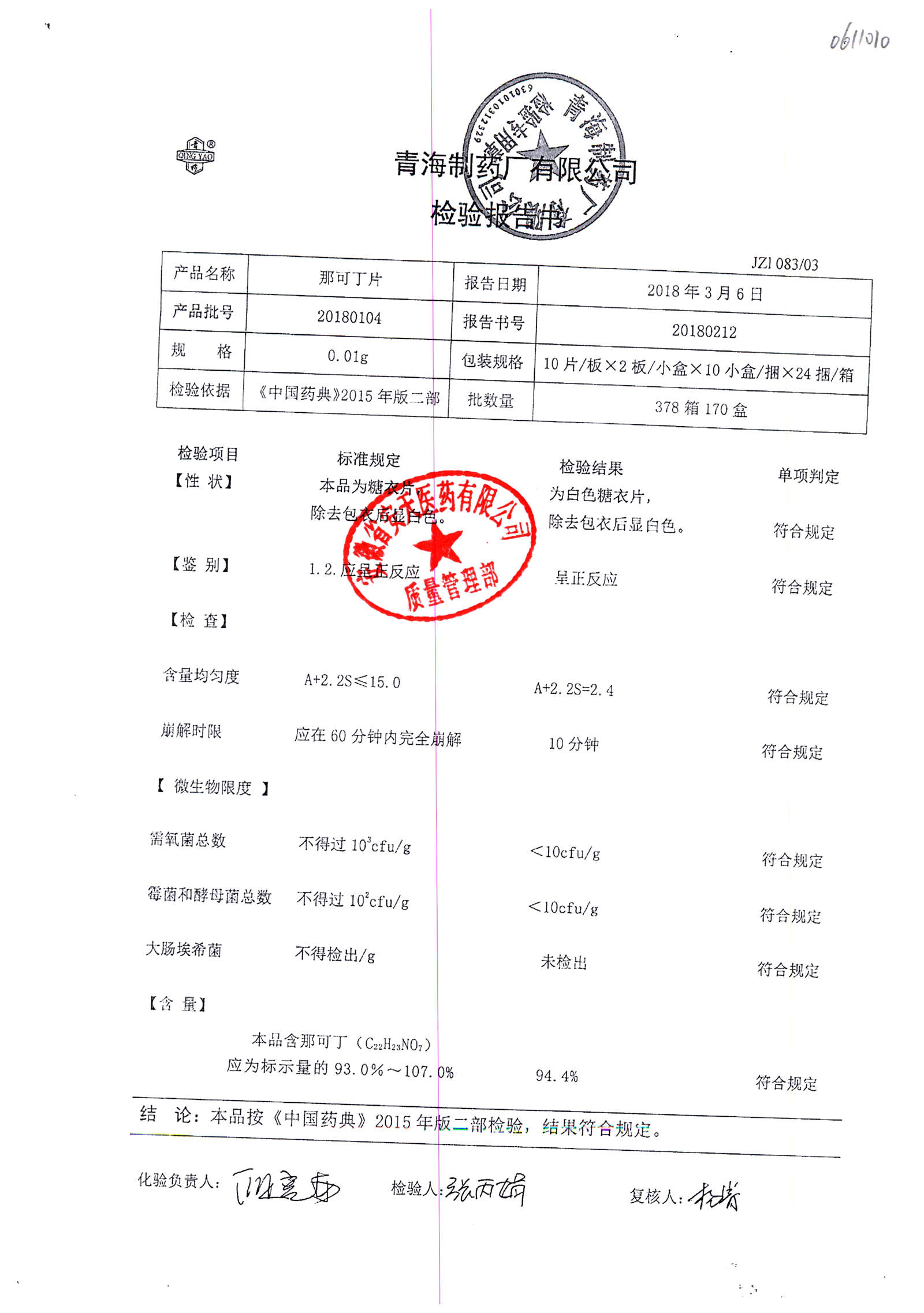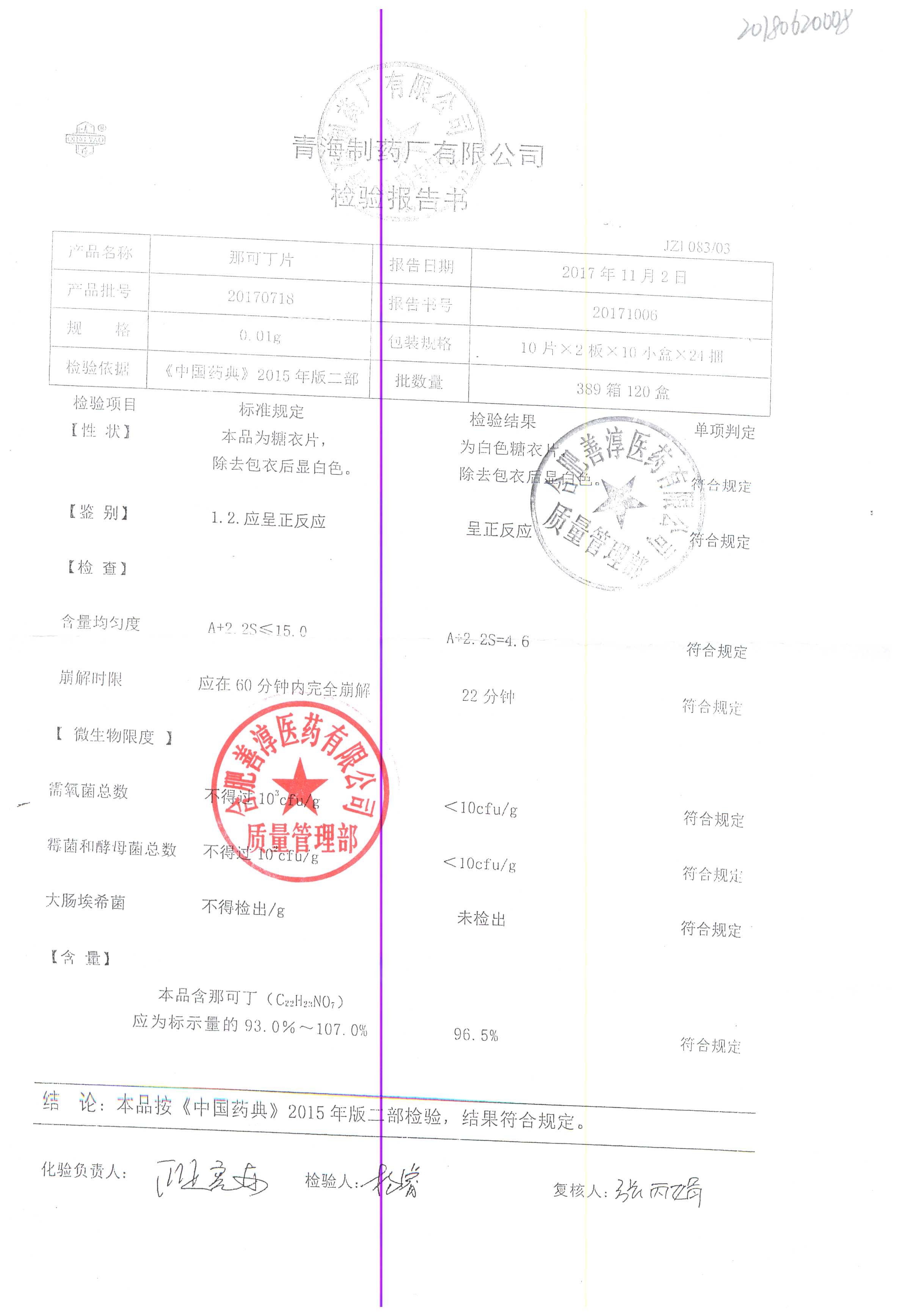 | 那可丁片 | 0.01g | 20180104 | 查看詳情 |