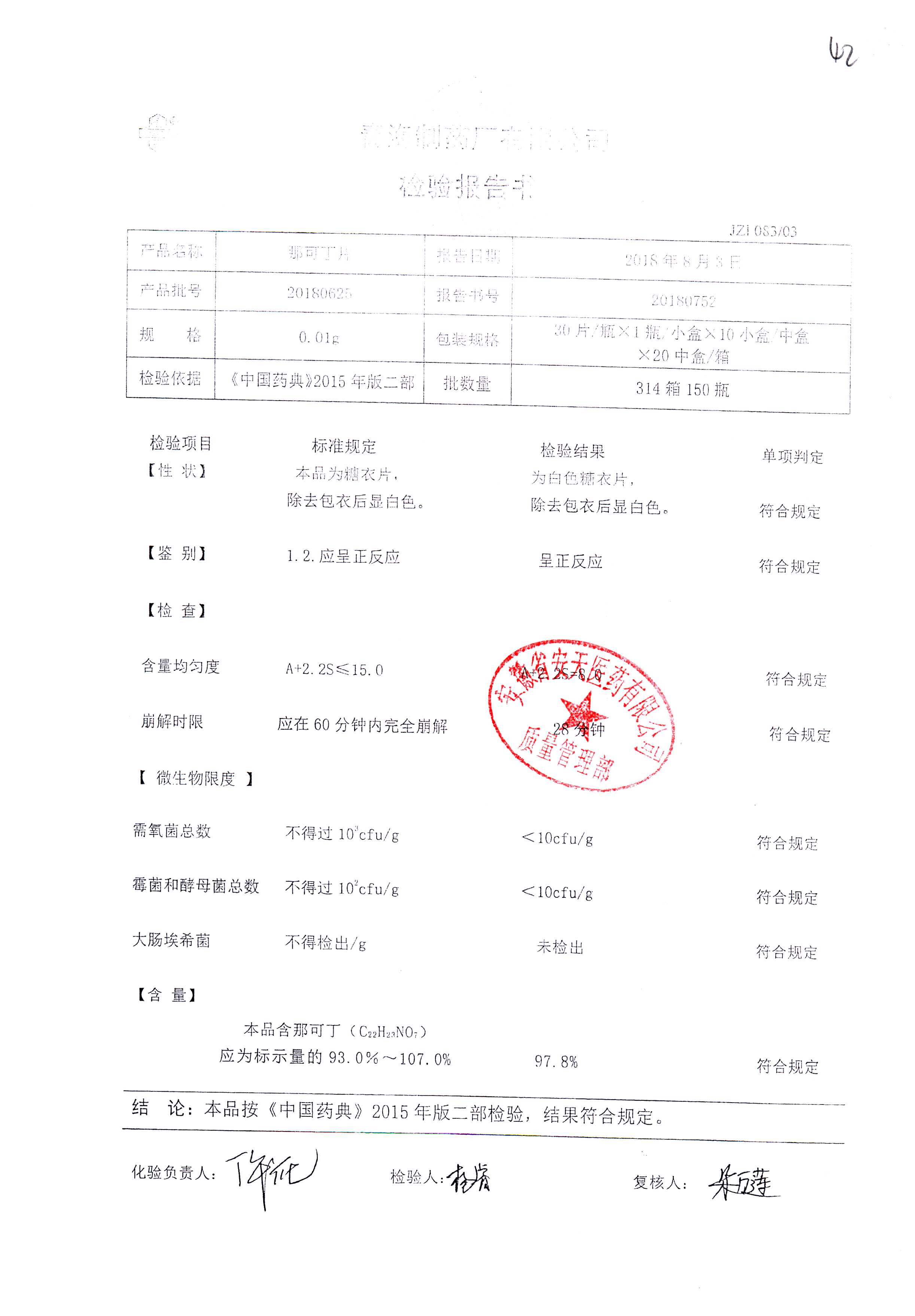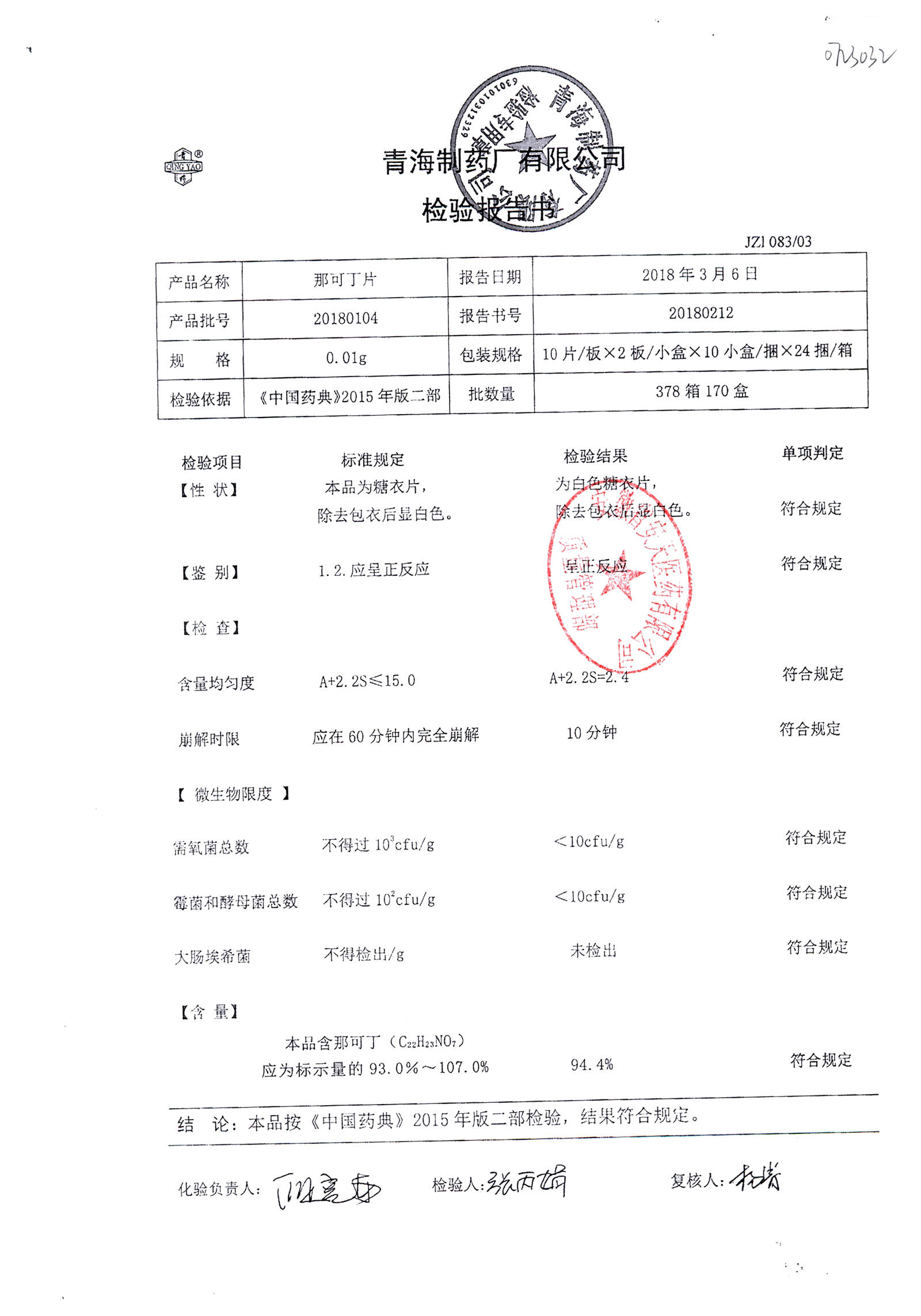 | 那可丁片 | 0.01g | 20180212 | 查看詳情 |