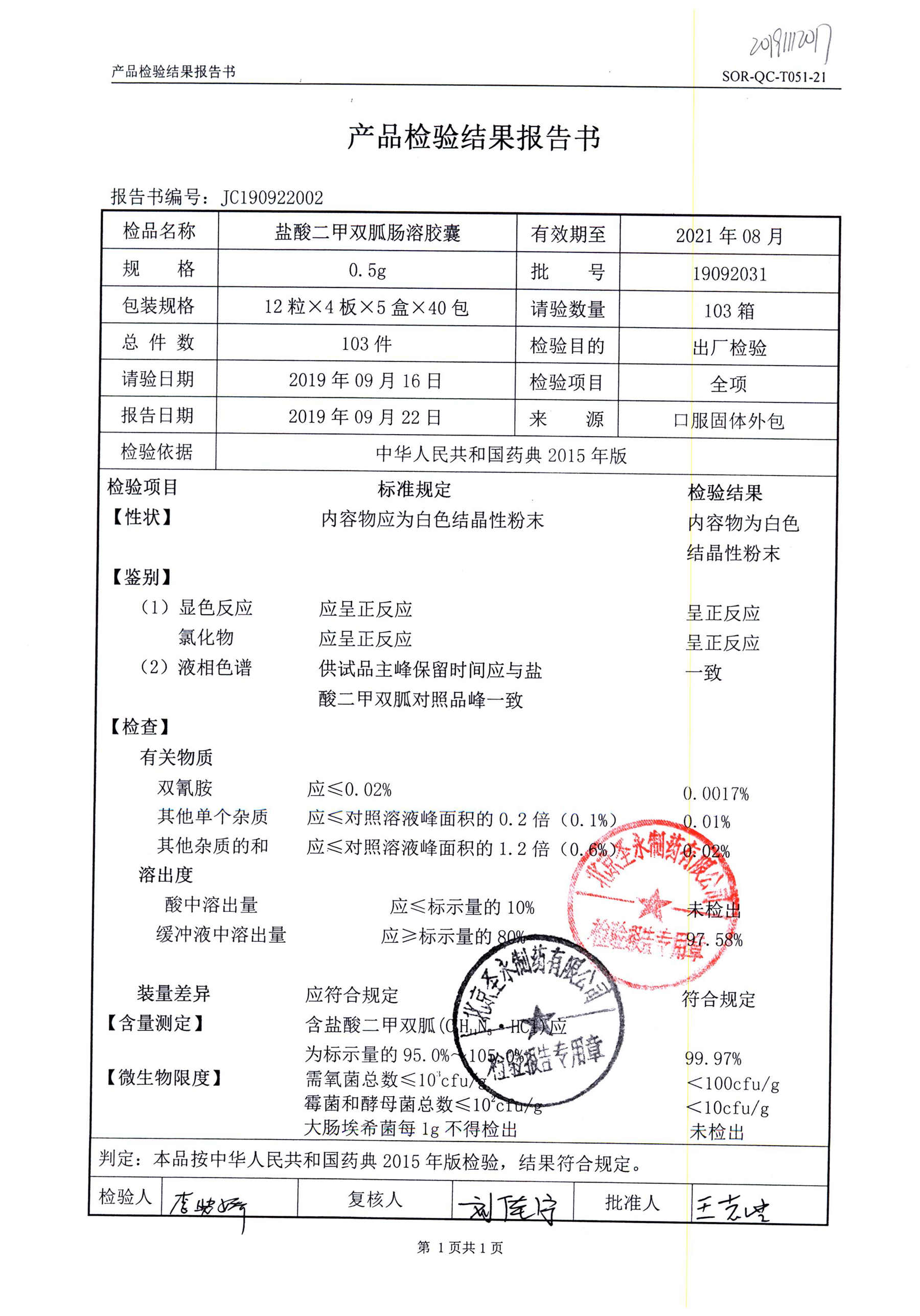 | 鹽酸二甲雙胍腸溶膠囊 | 0.5g*48s | 19092031(1/2) | 查看詳情 |