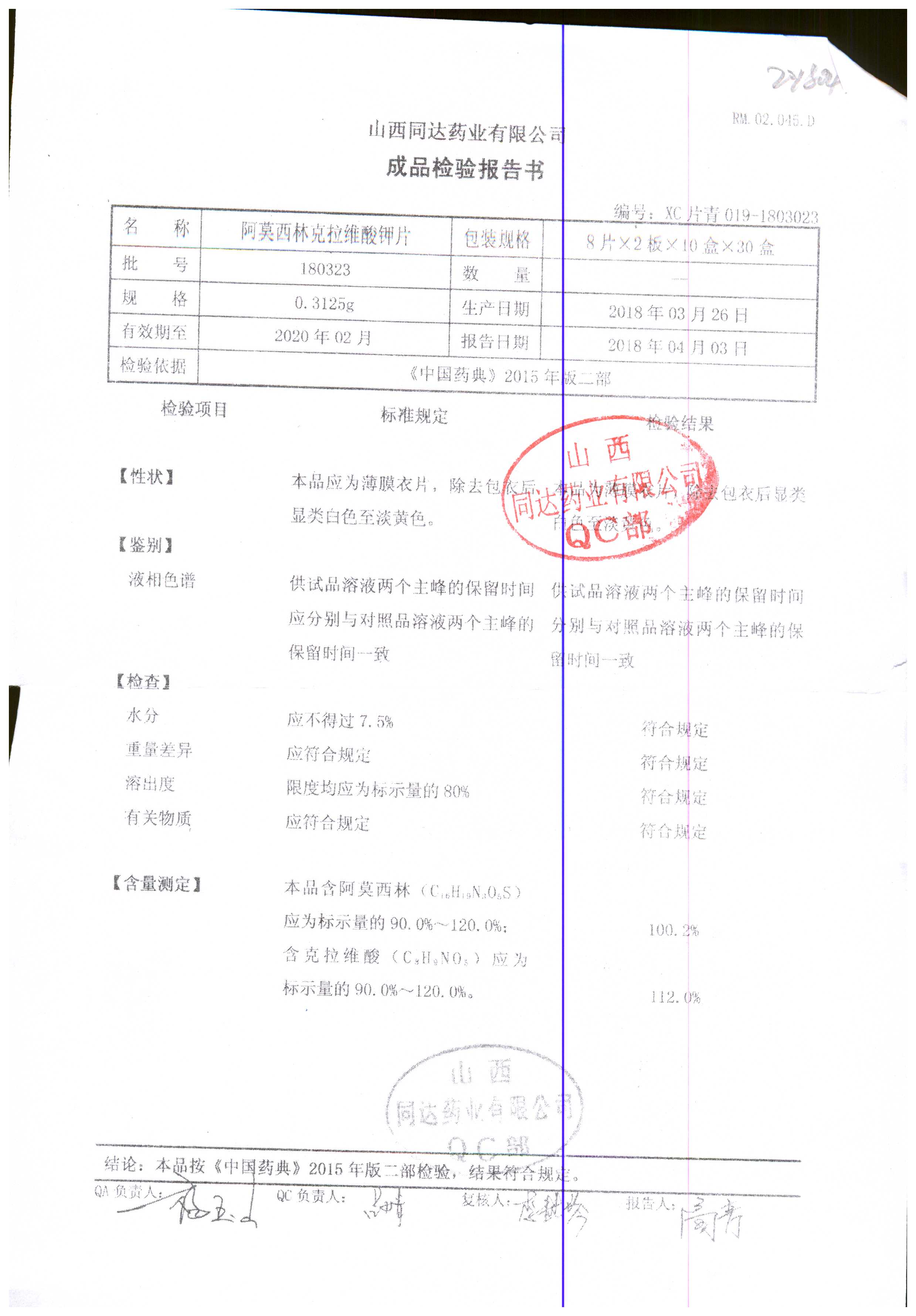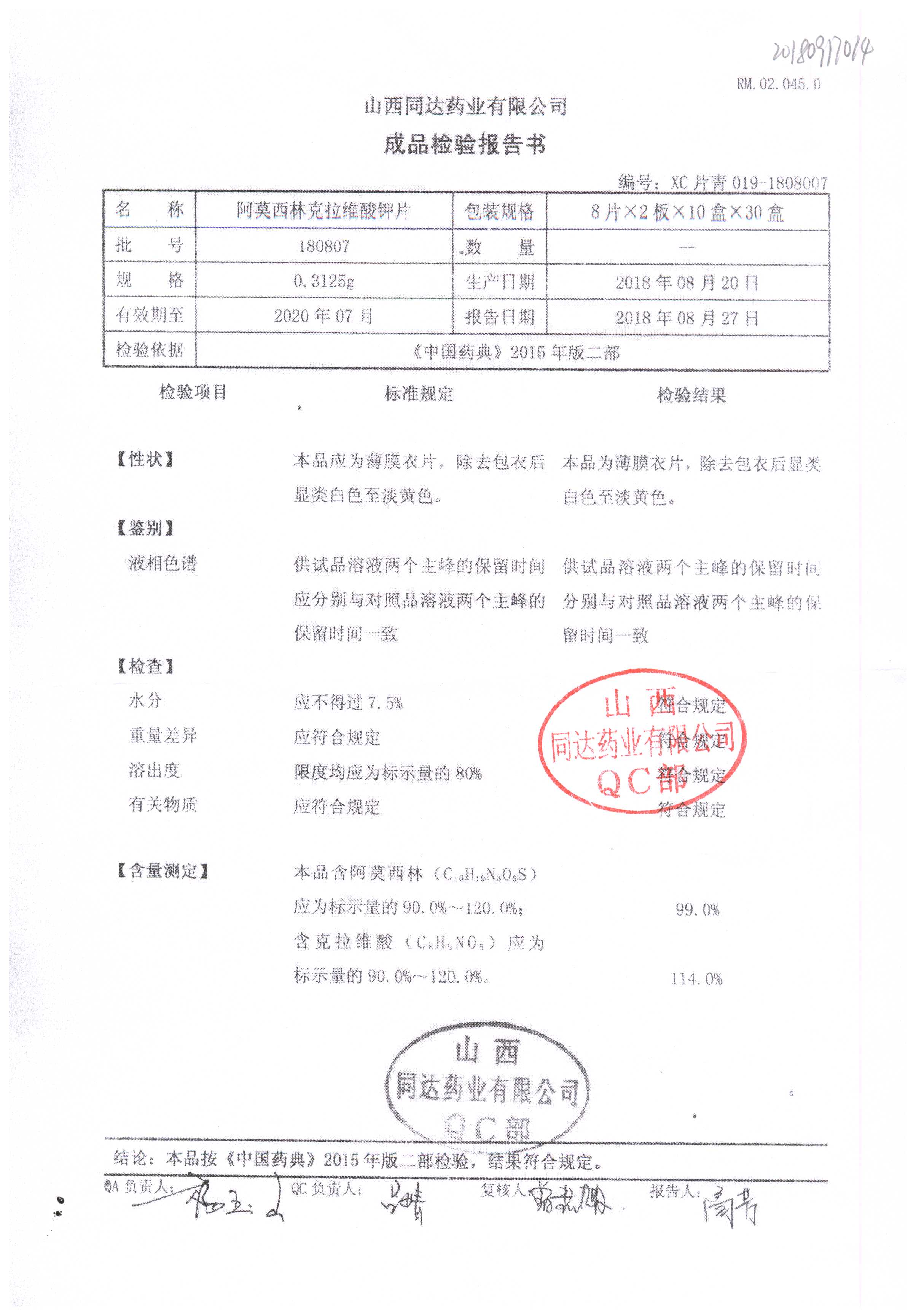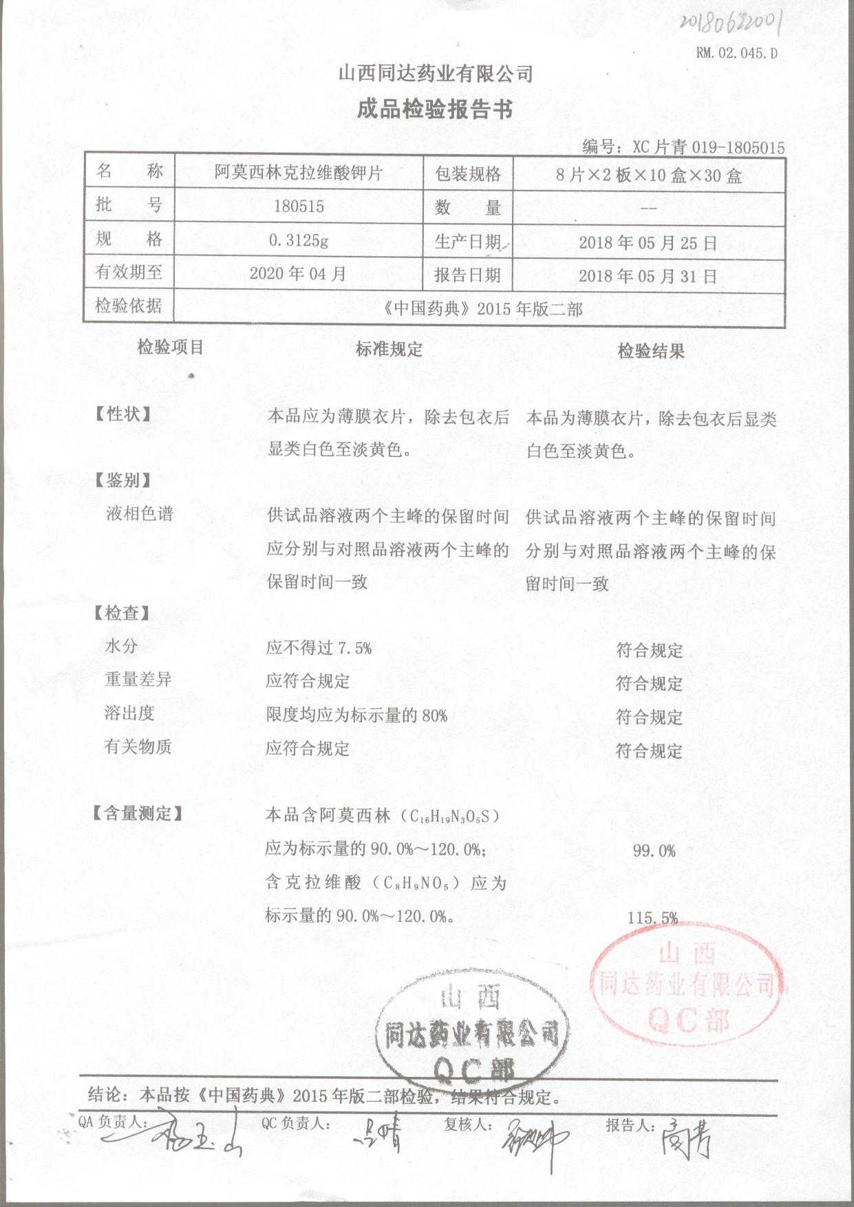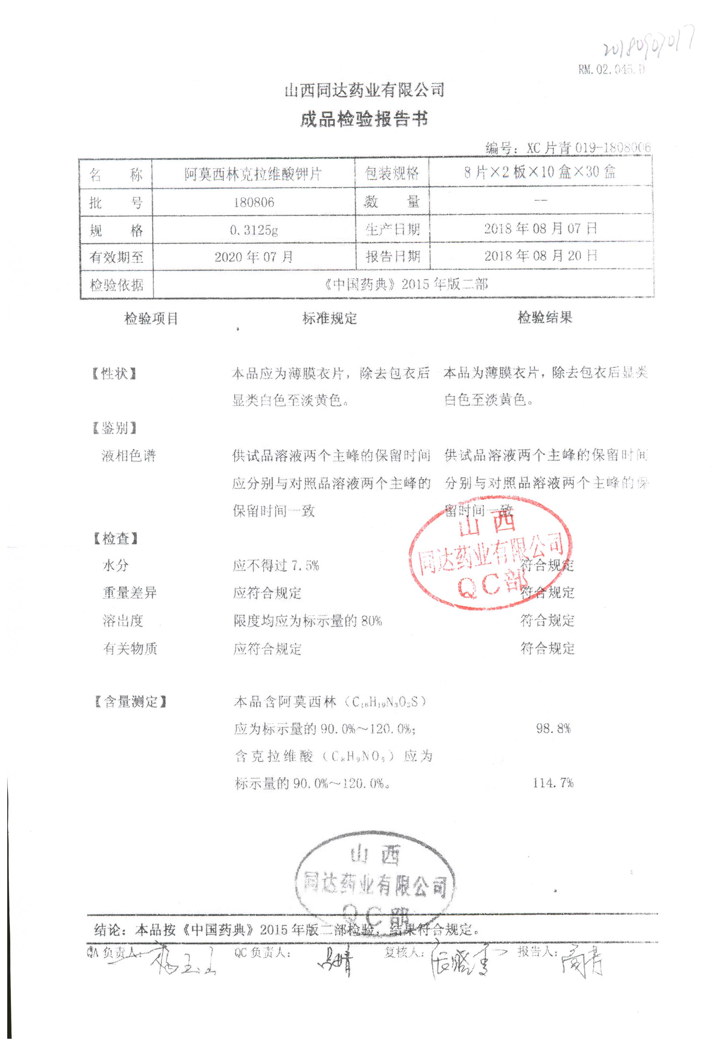 | 阿莫西林克拉維酸鉀片 | 0.3125g*16s | 180806 | 查看詳情 |