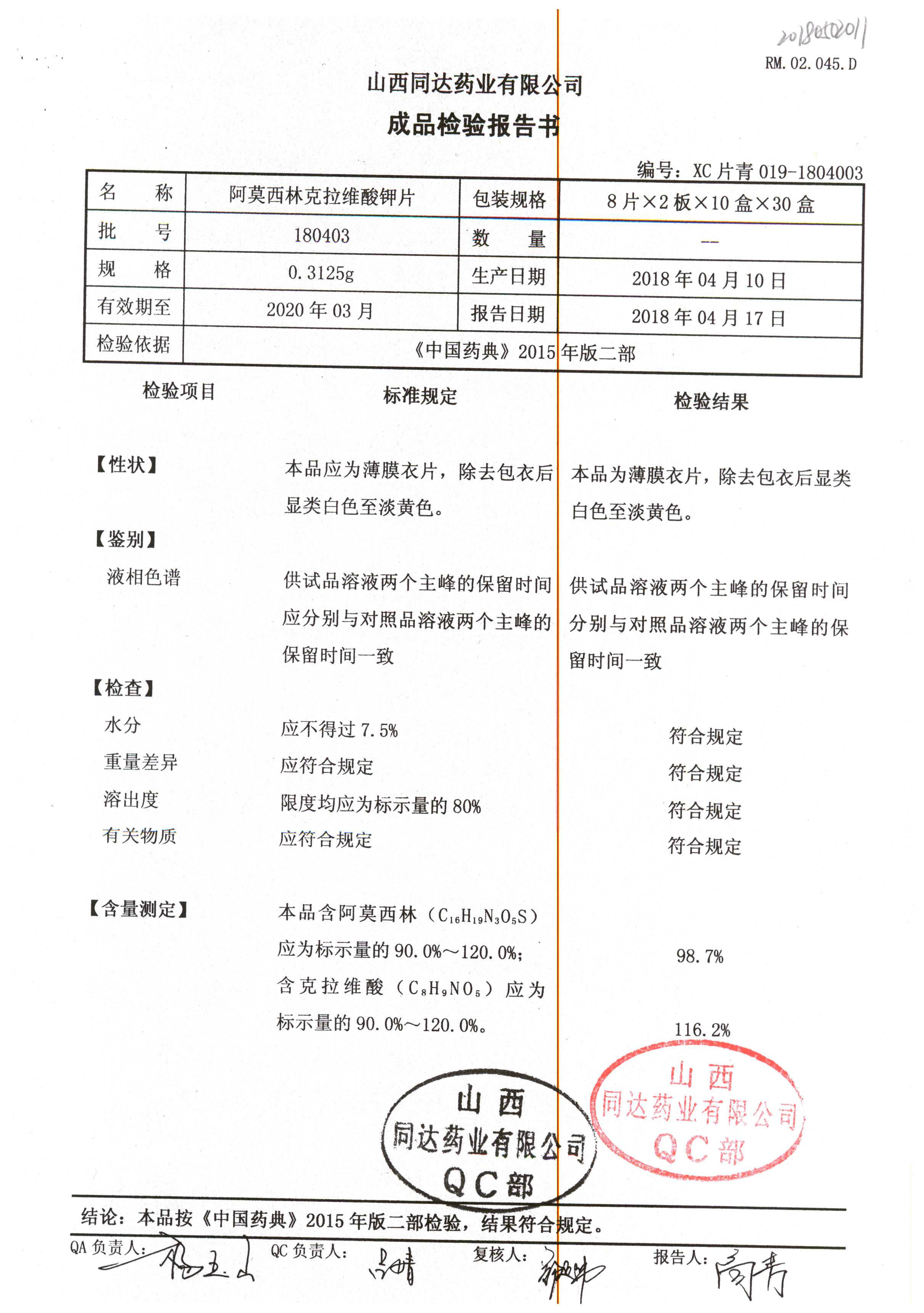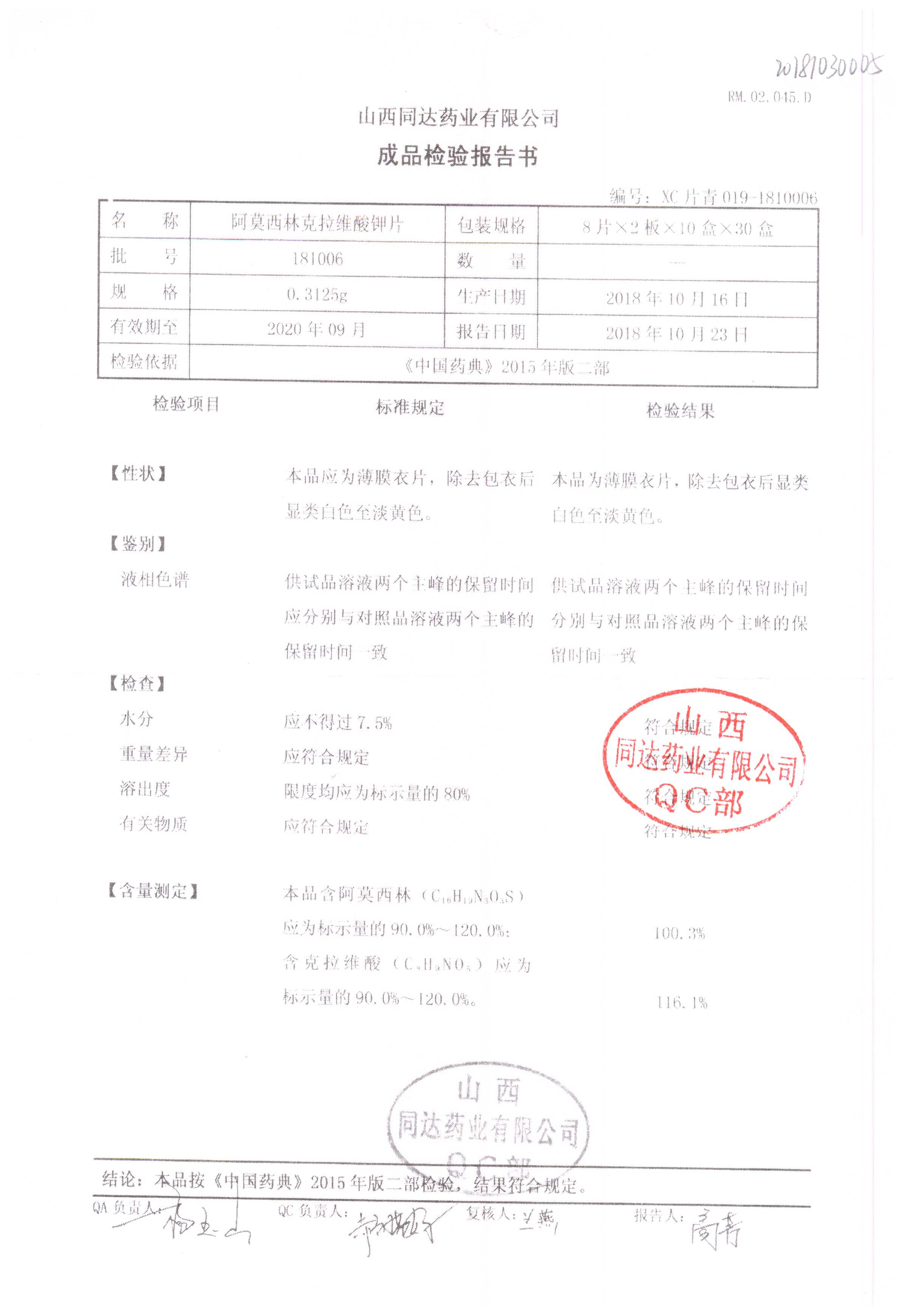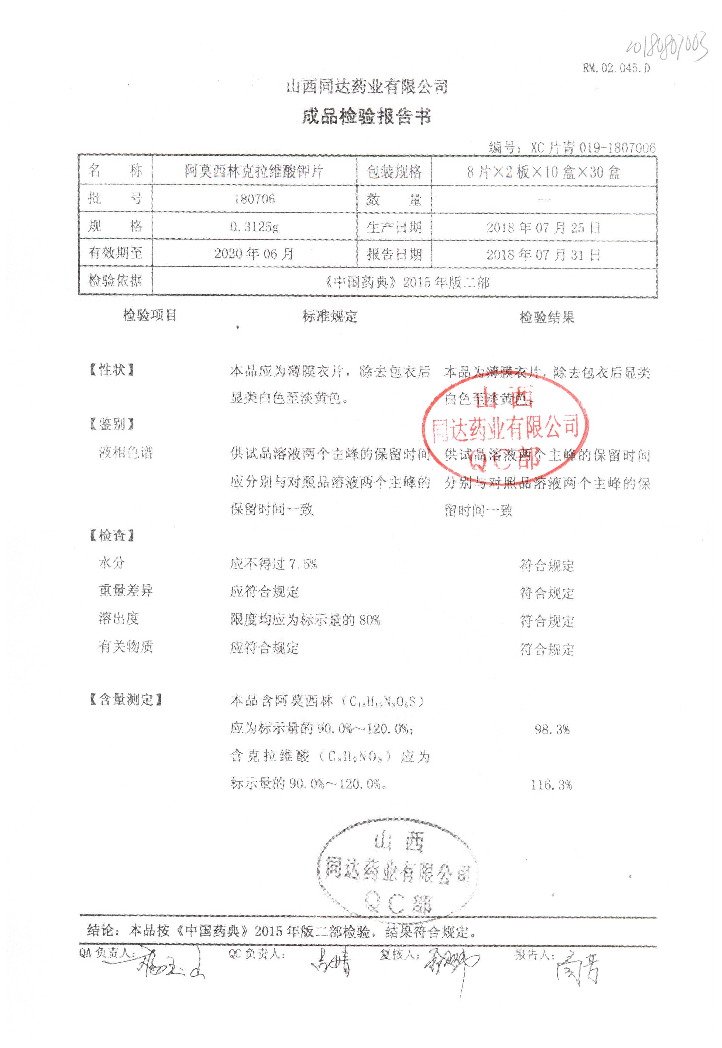 | 阿莫西林克拉維酸鉀片 | 0.3125g*16s | 180806 | 查看詳情 |