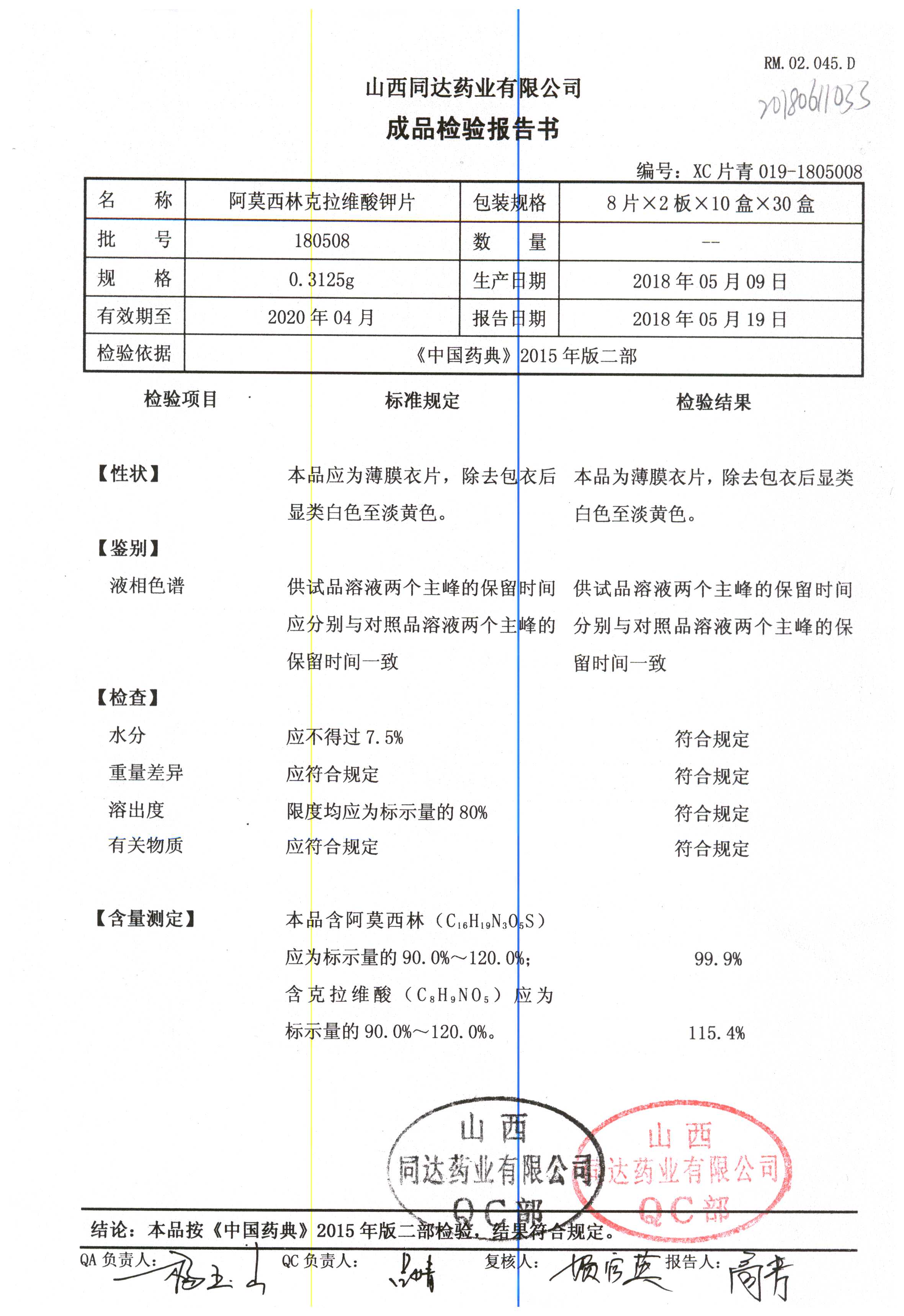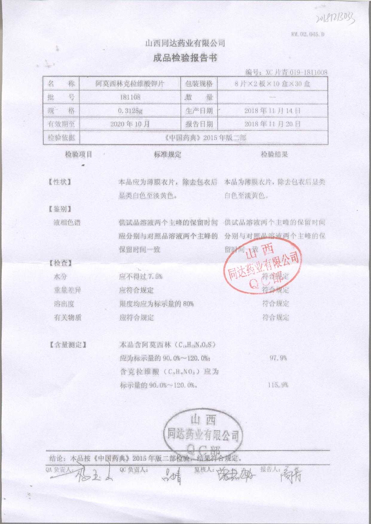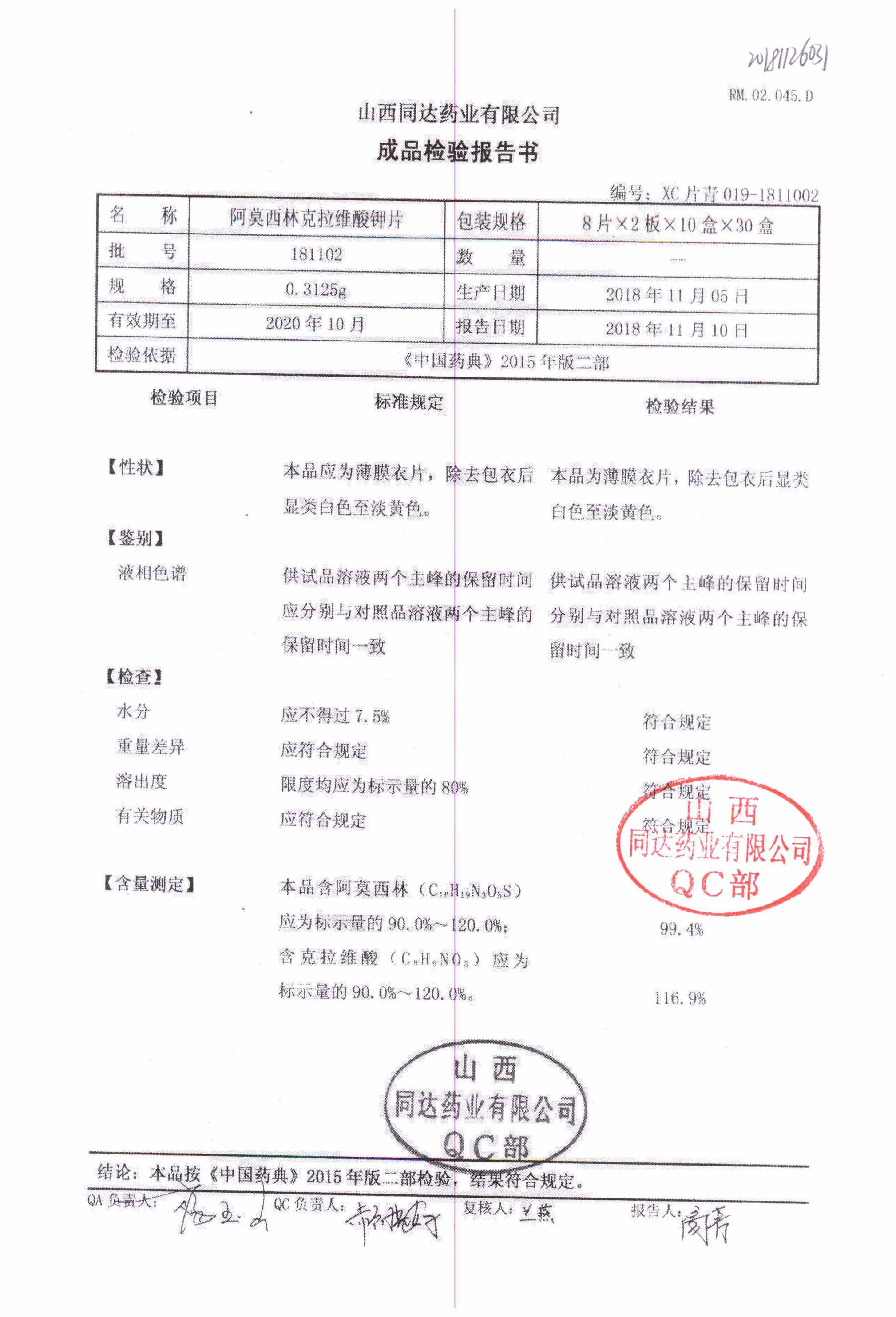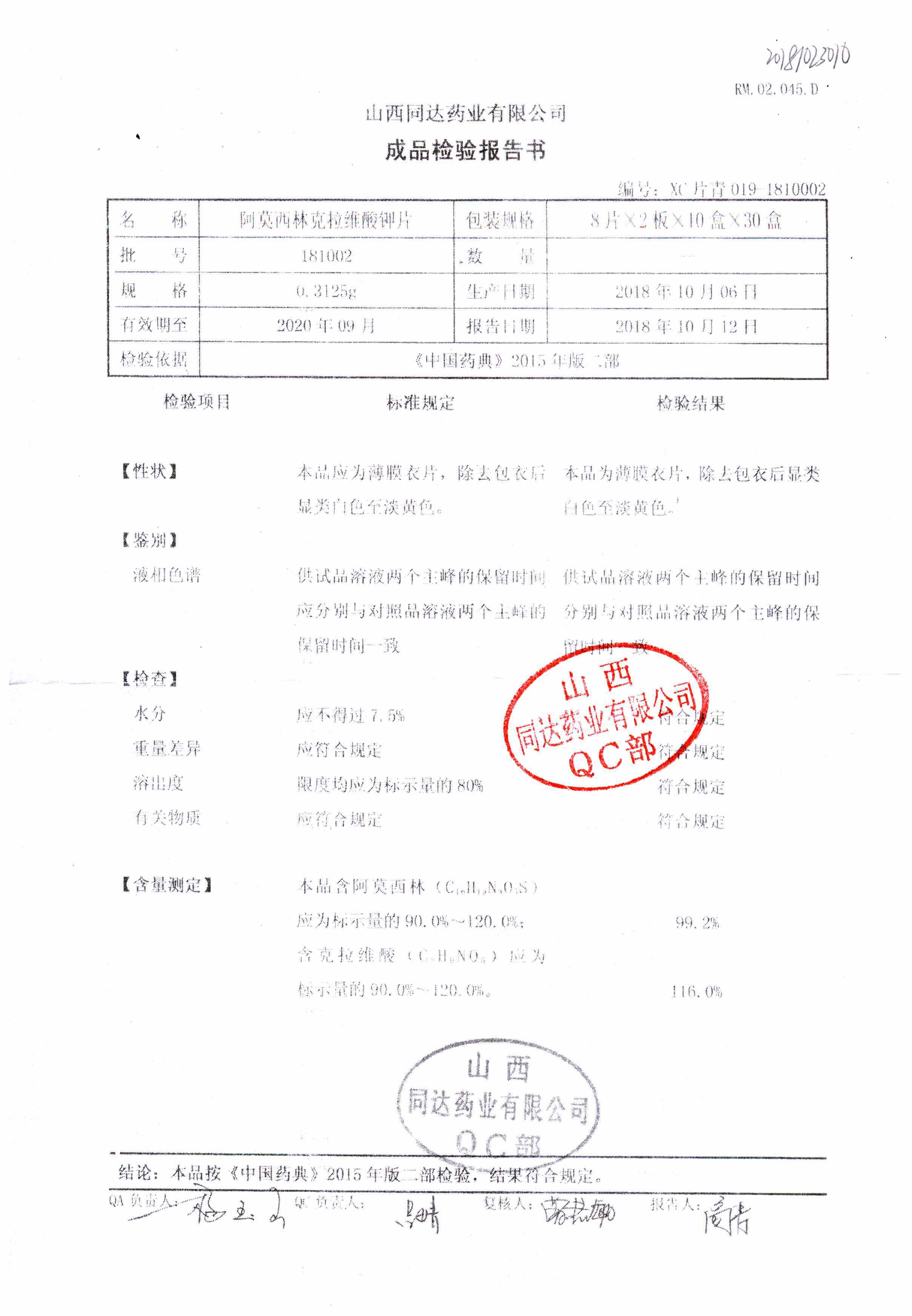 | 阿莫西林克拉維酸鉀片 | 0.3125g*16s | 180806 | 查看詳情 |