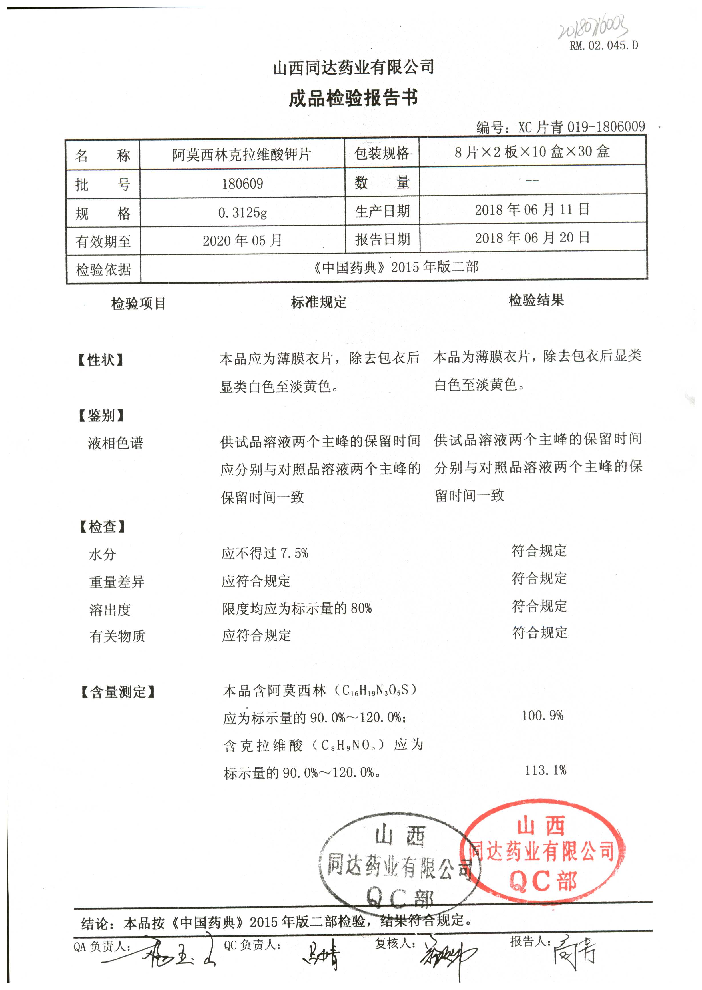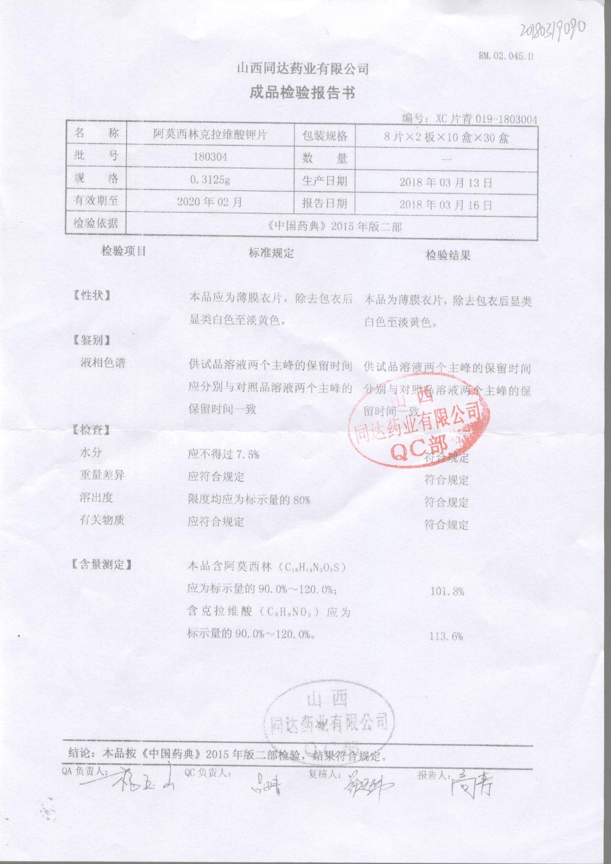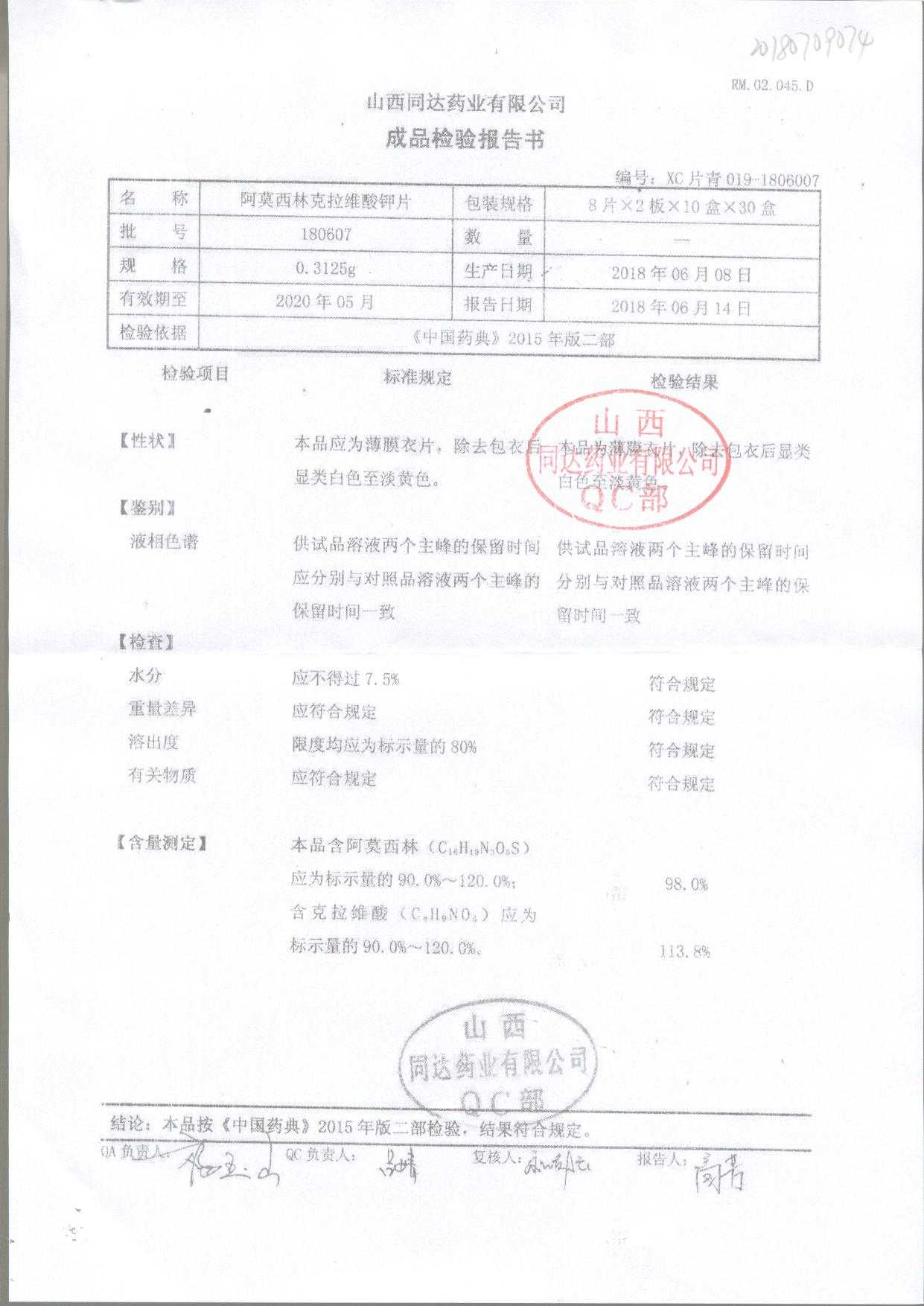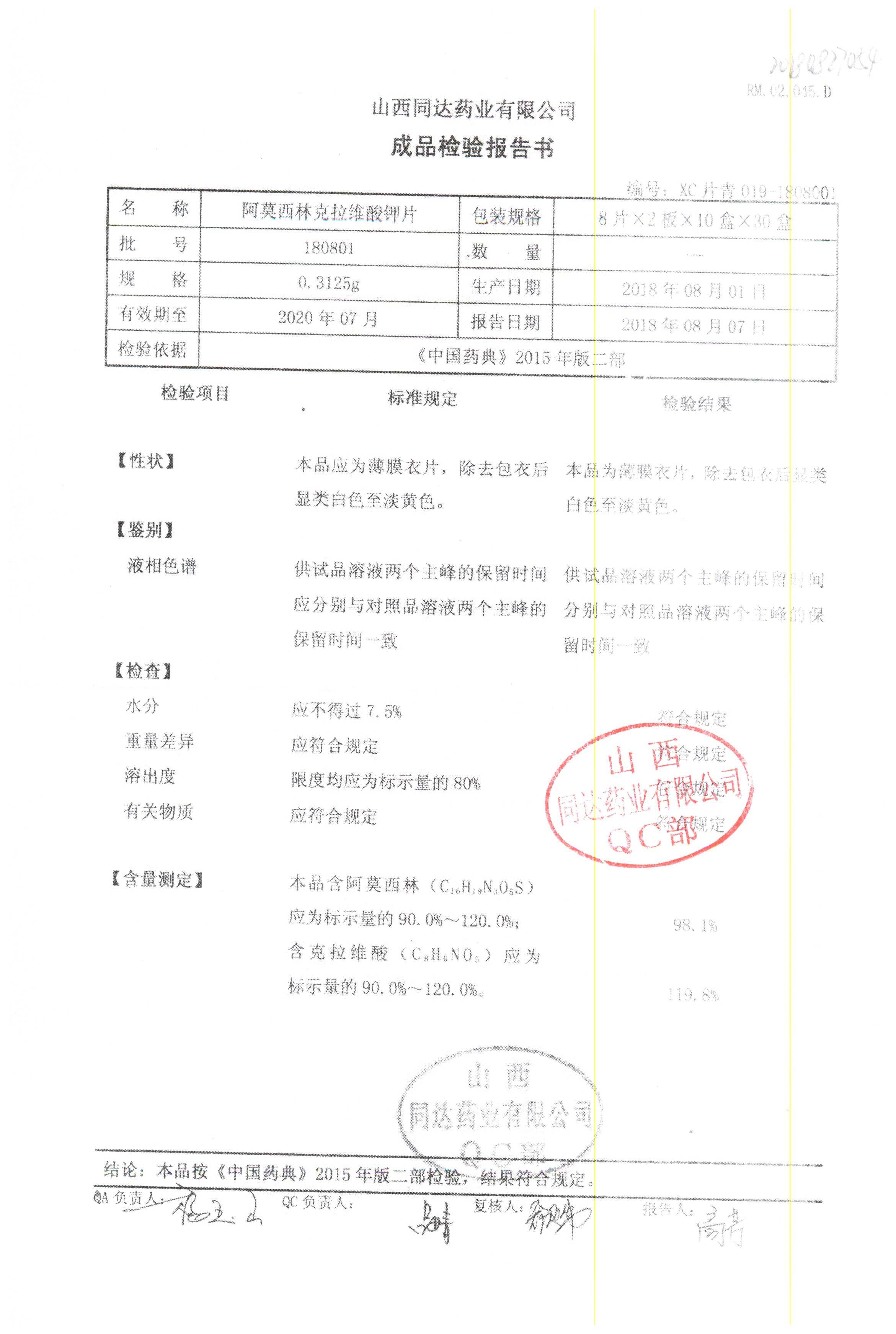 | 阿莫西林克拉維酸鉀片 | 0.3125g*16s | 180801 | 查看詳情 |