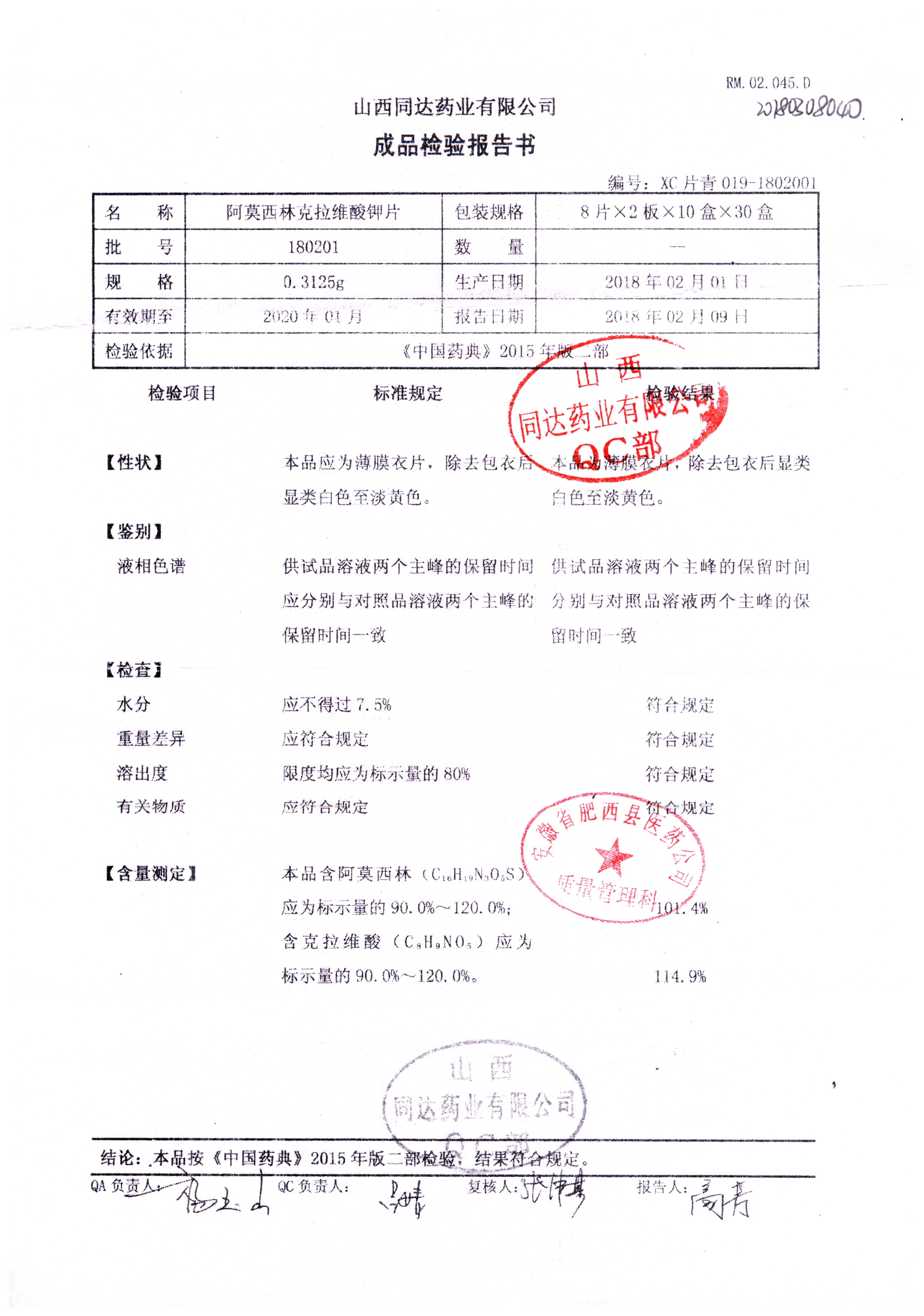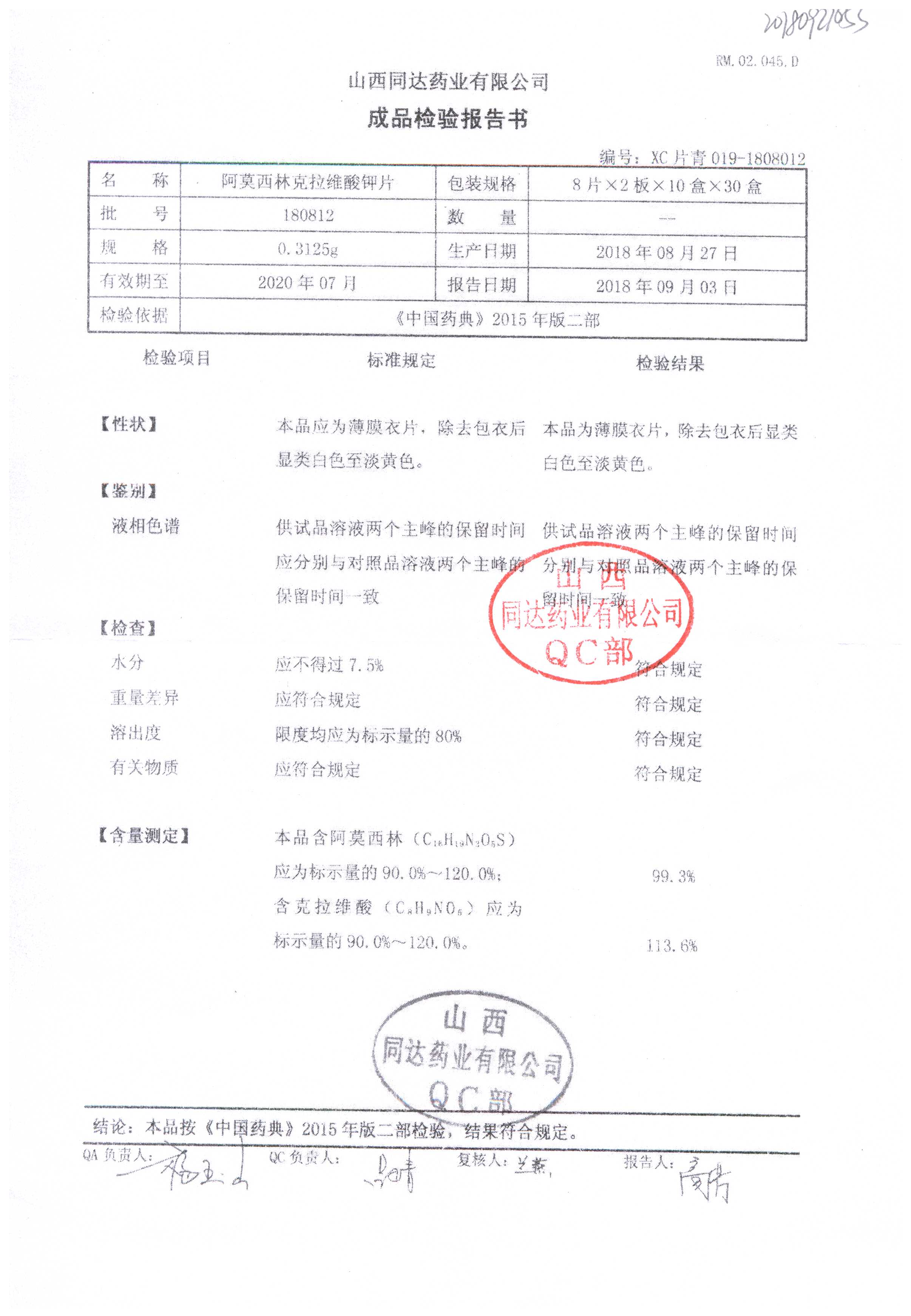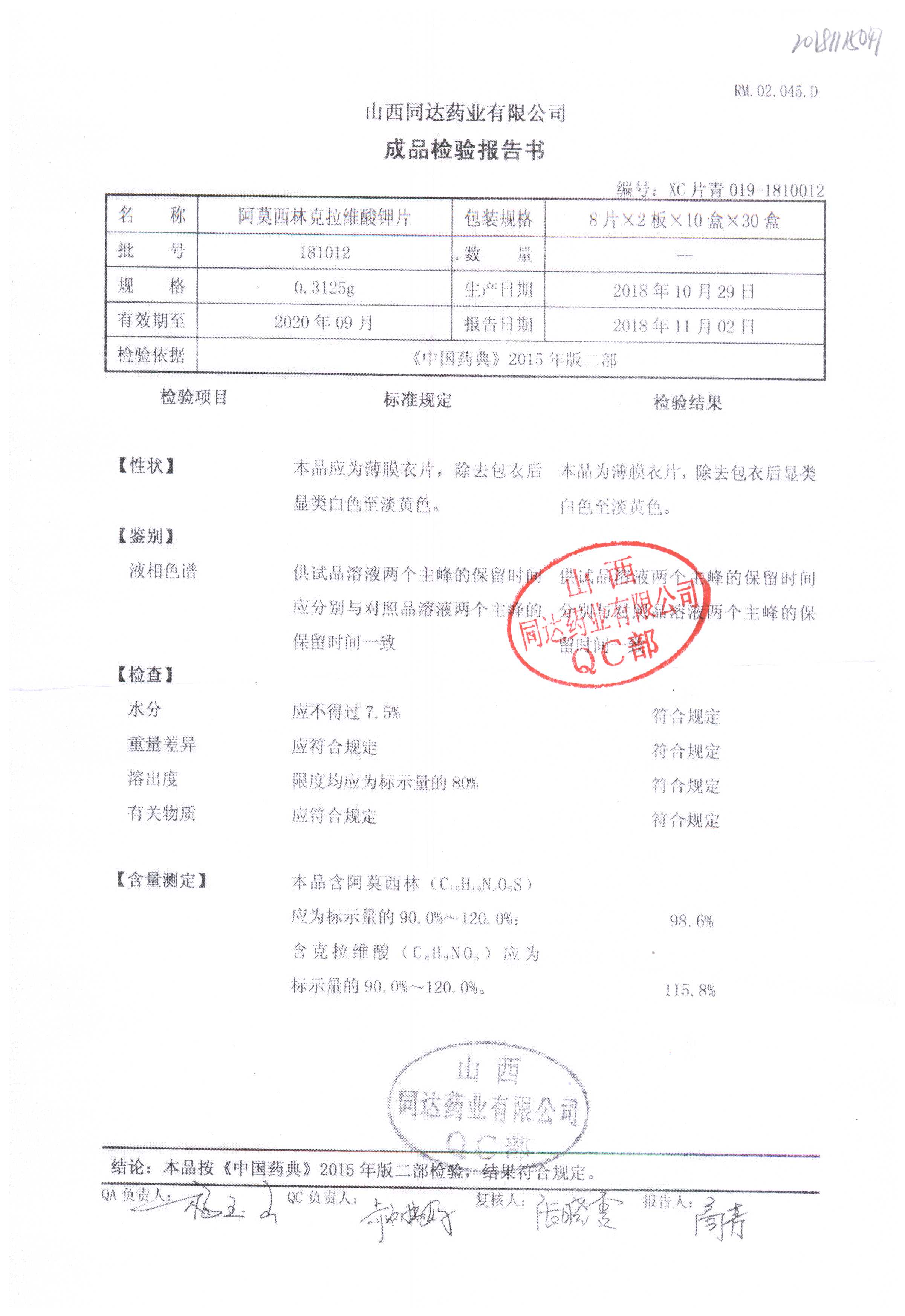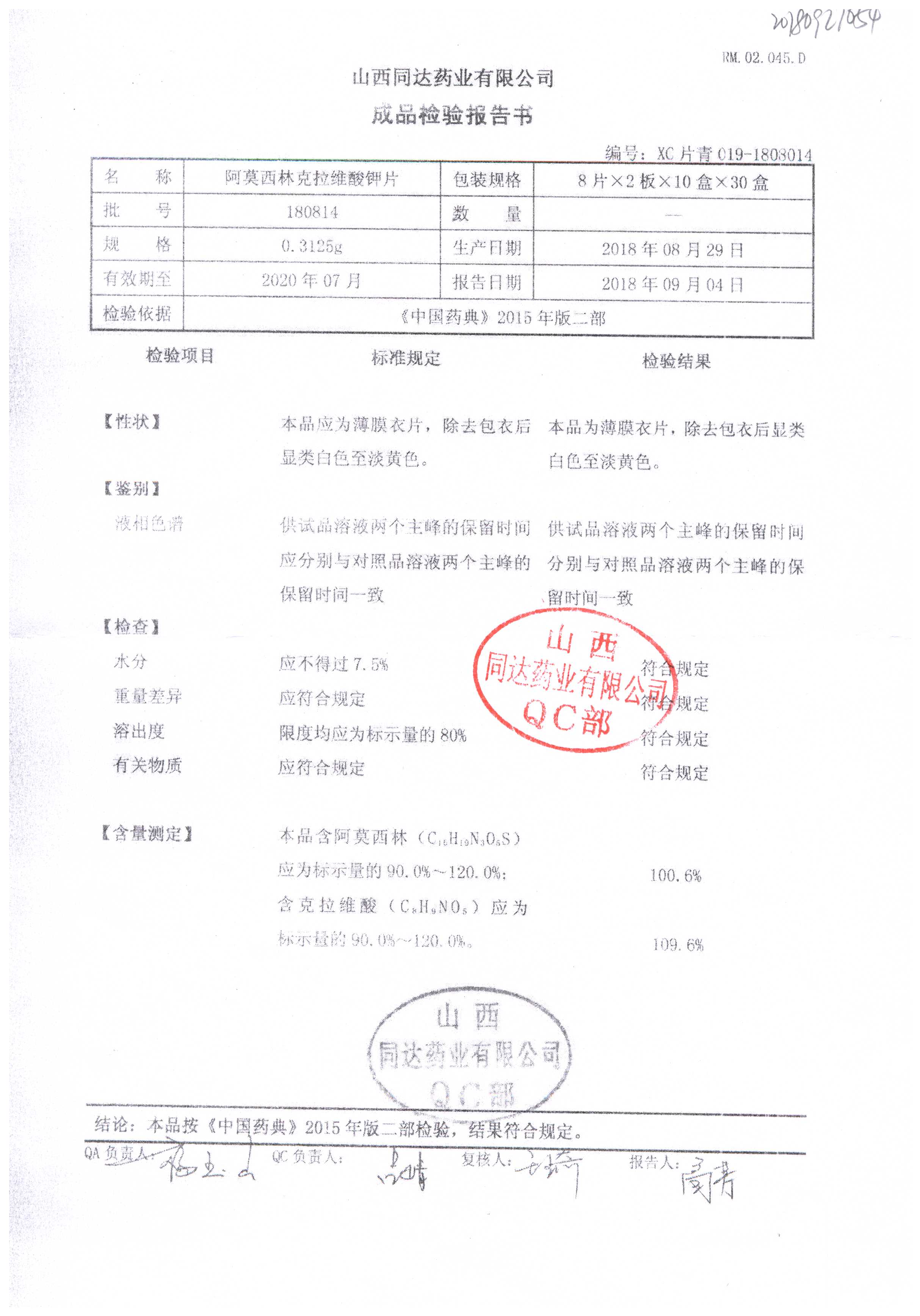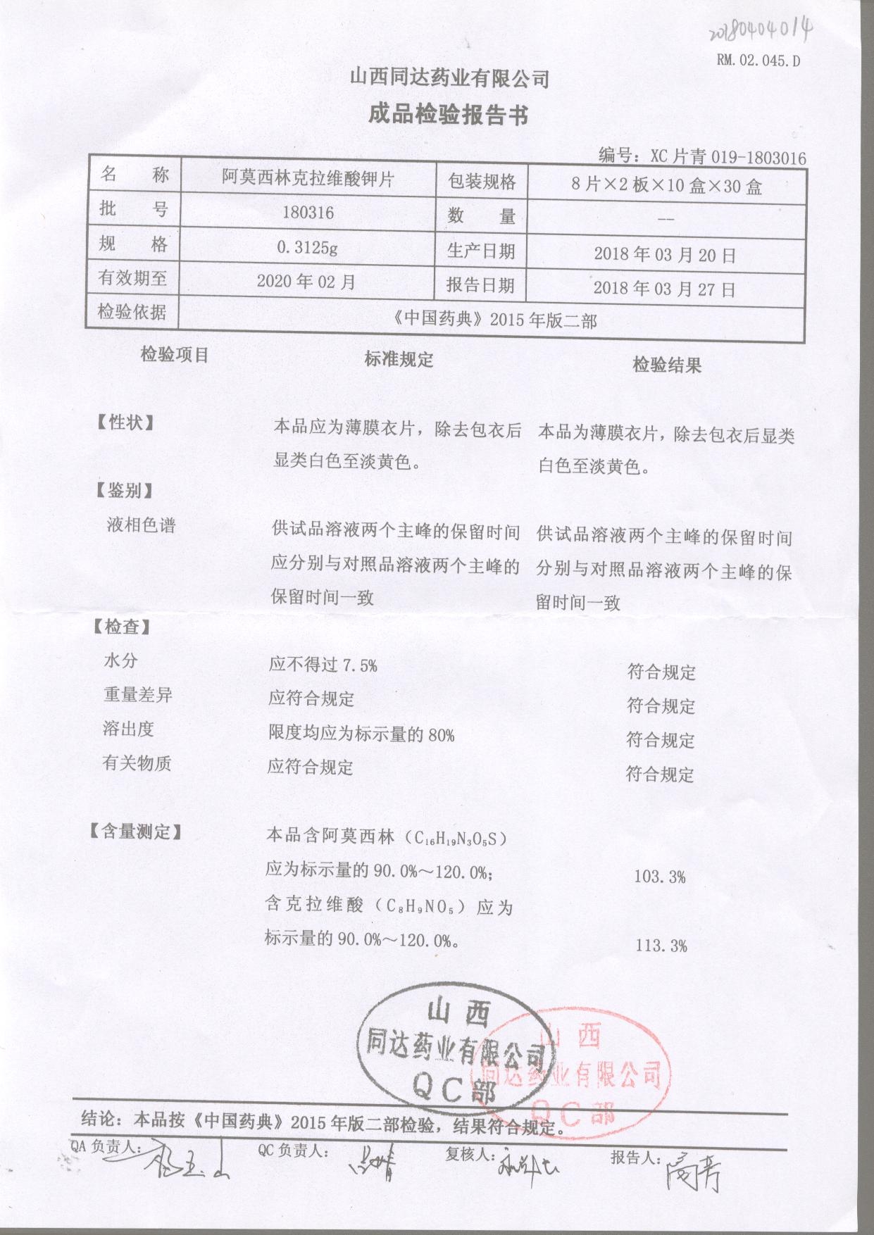 | 阿莫西林克拉維酸鉀片 | 0.3125g*16s | 180801 | 查看詳情 |