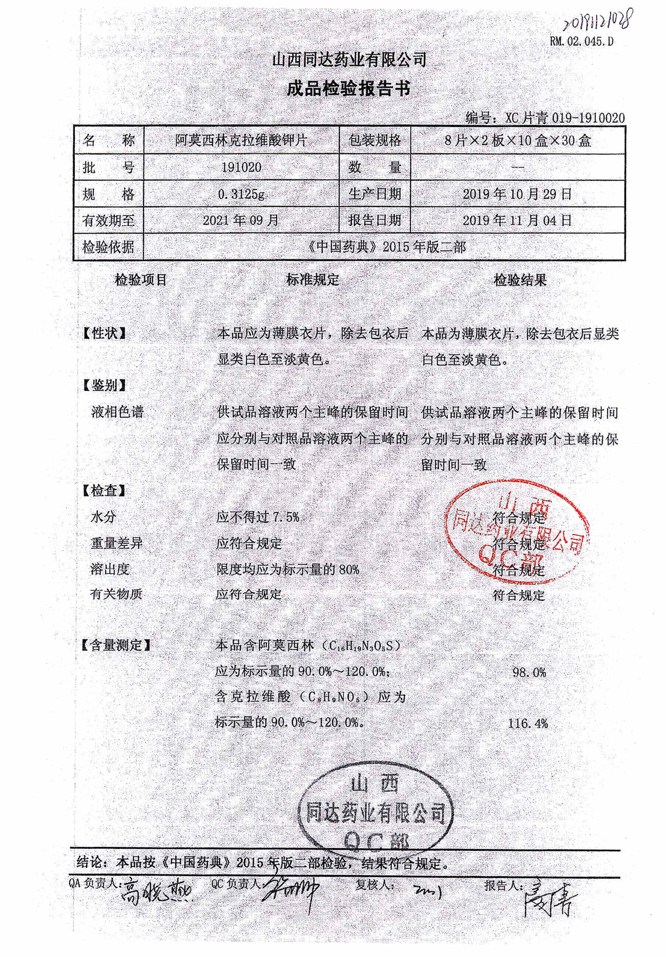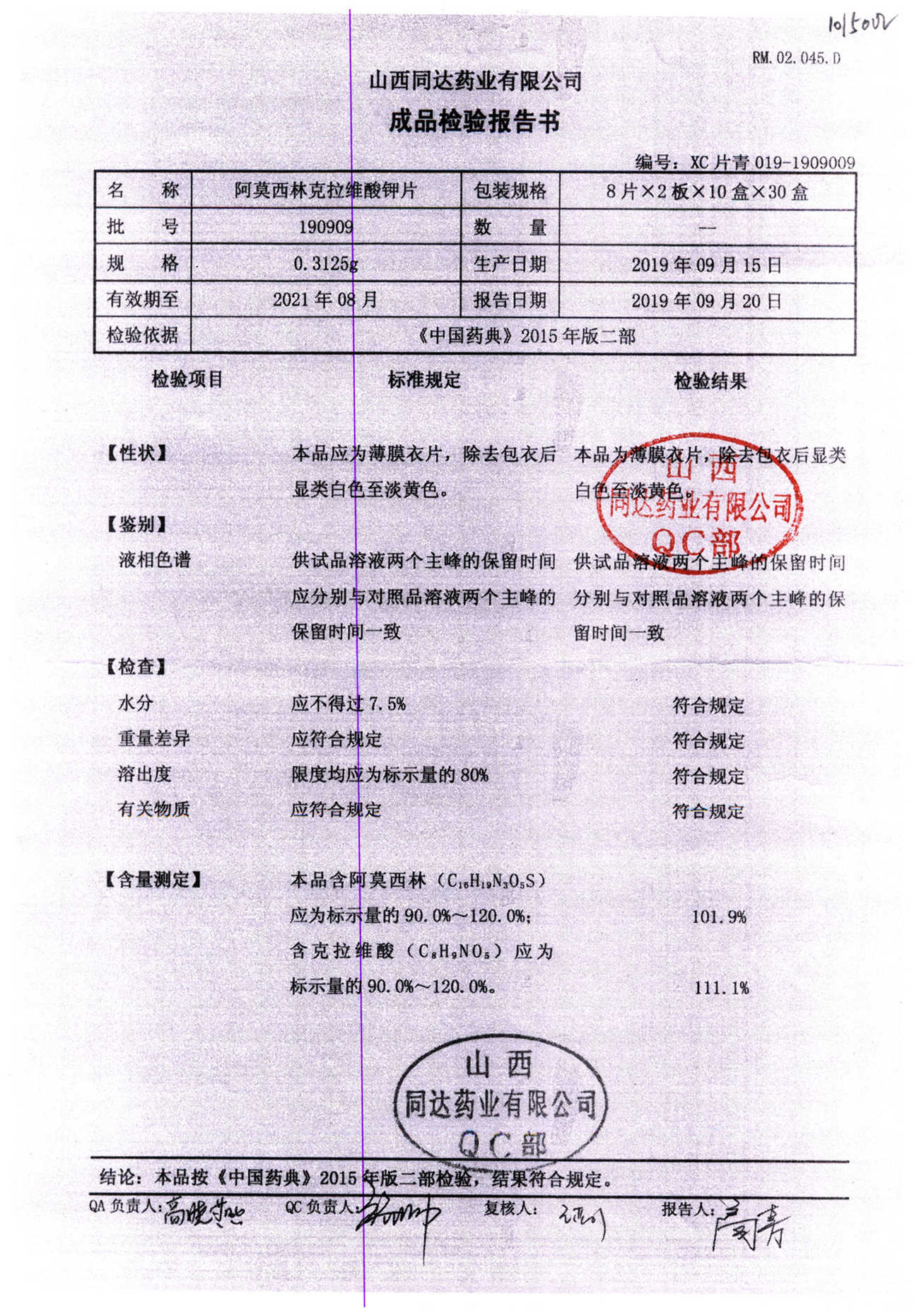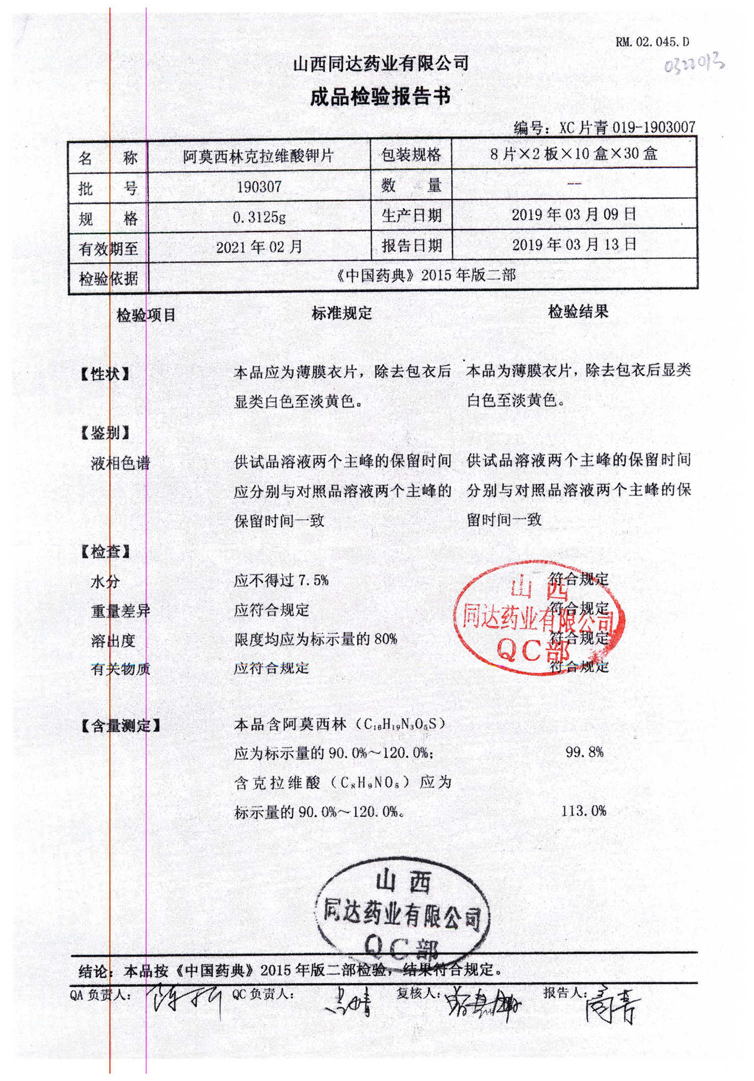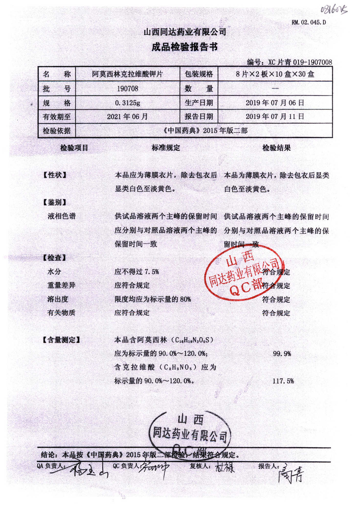 | 阿莫西林克拉維酸鉀片 | 0.3125g*16s | 190326 | 查看詳情 |