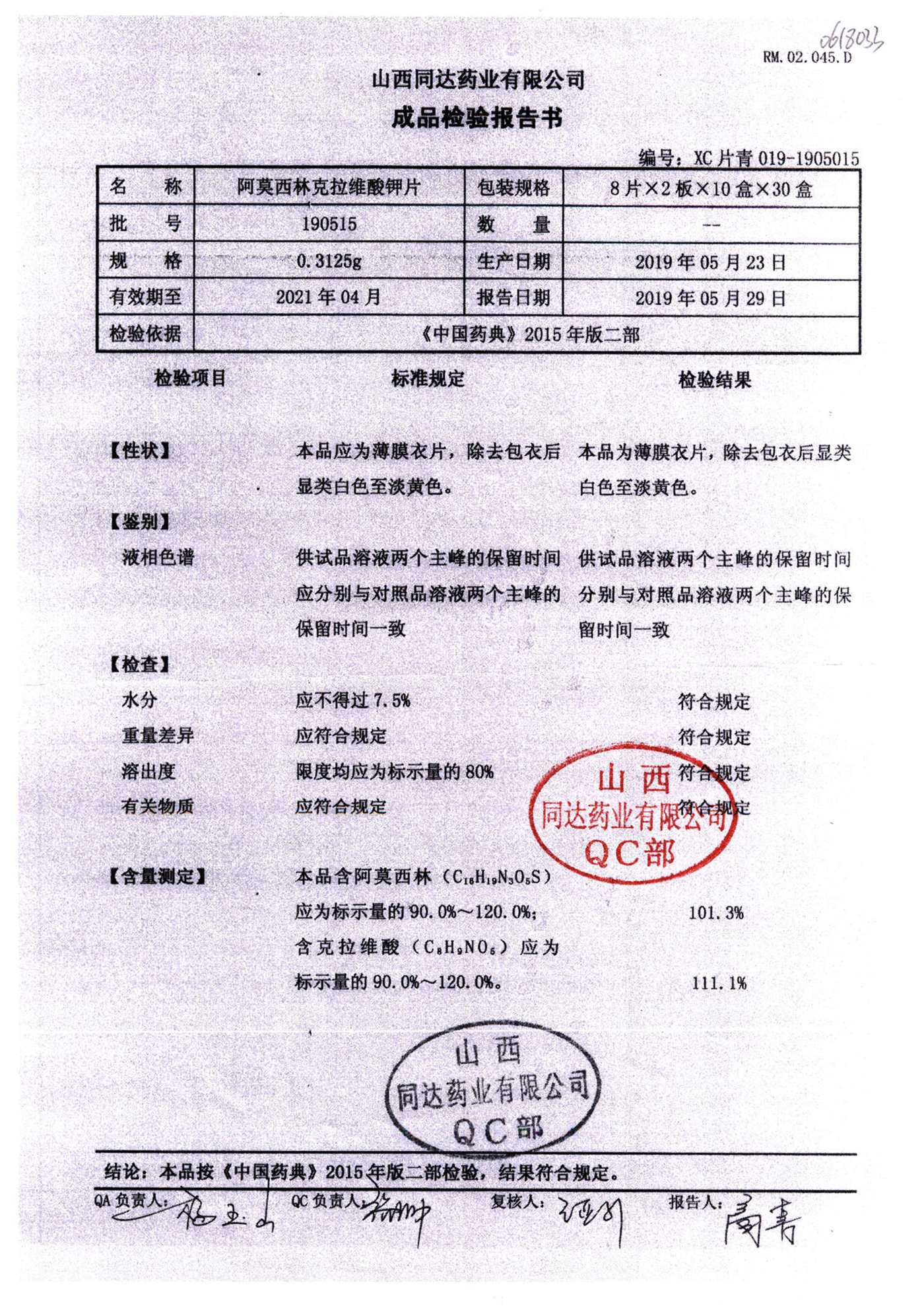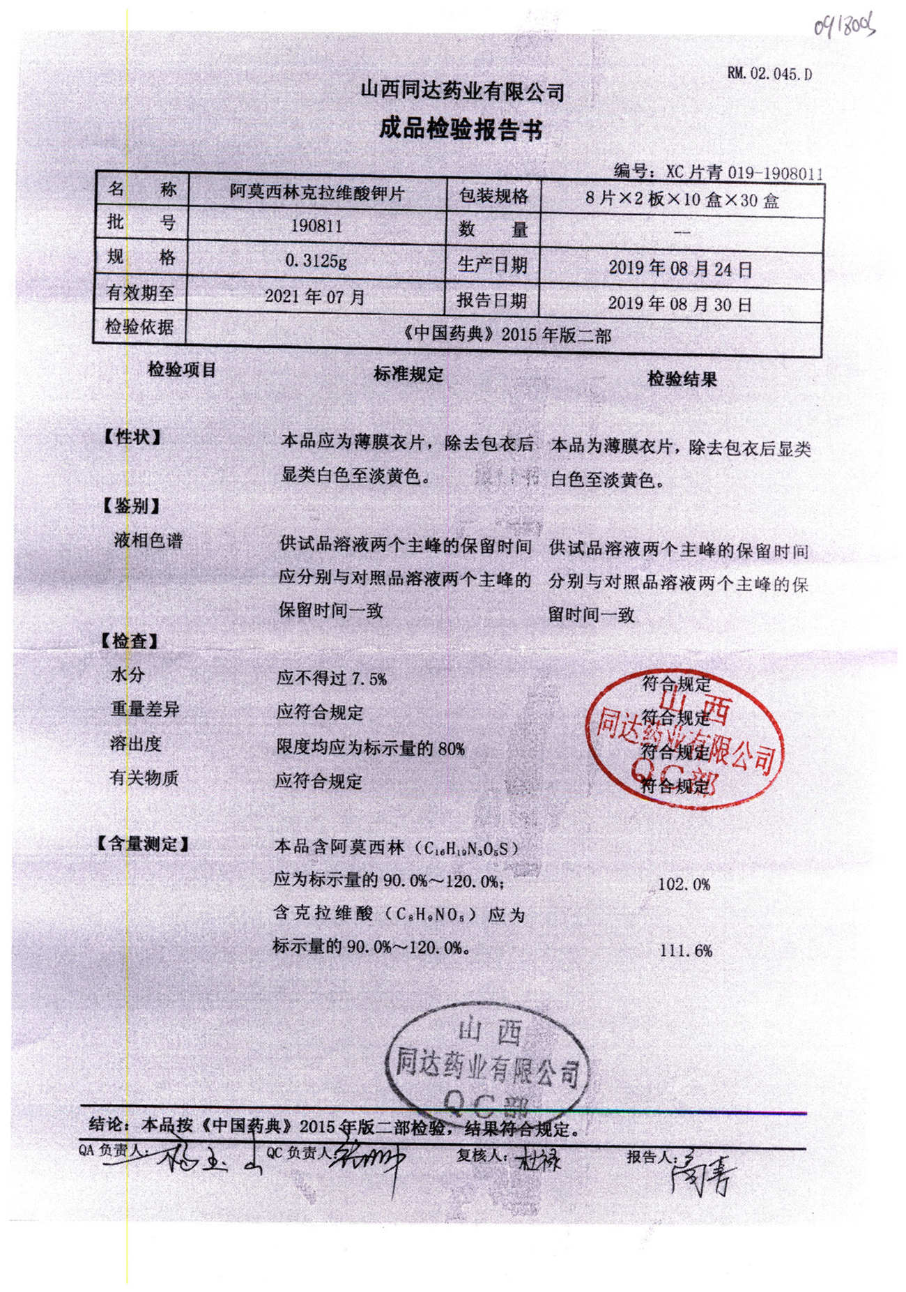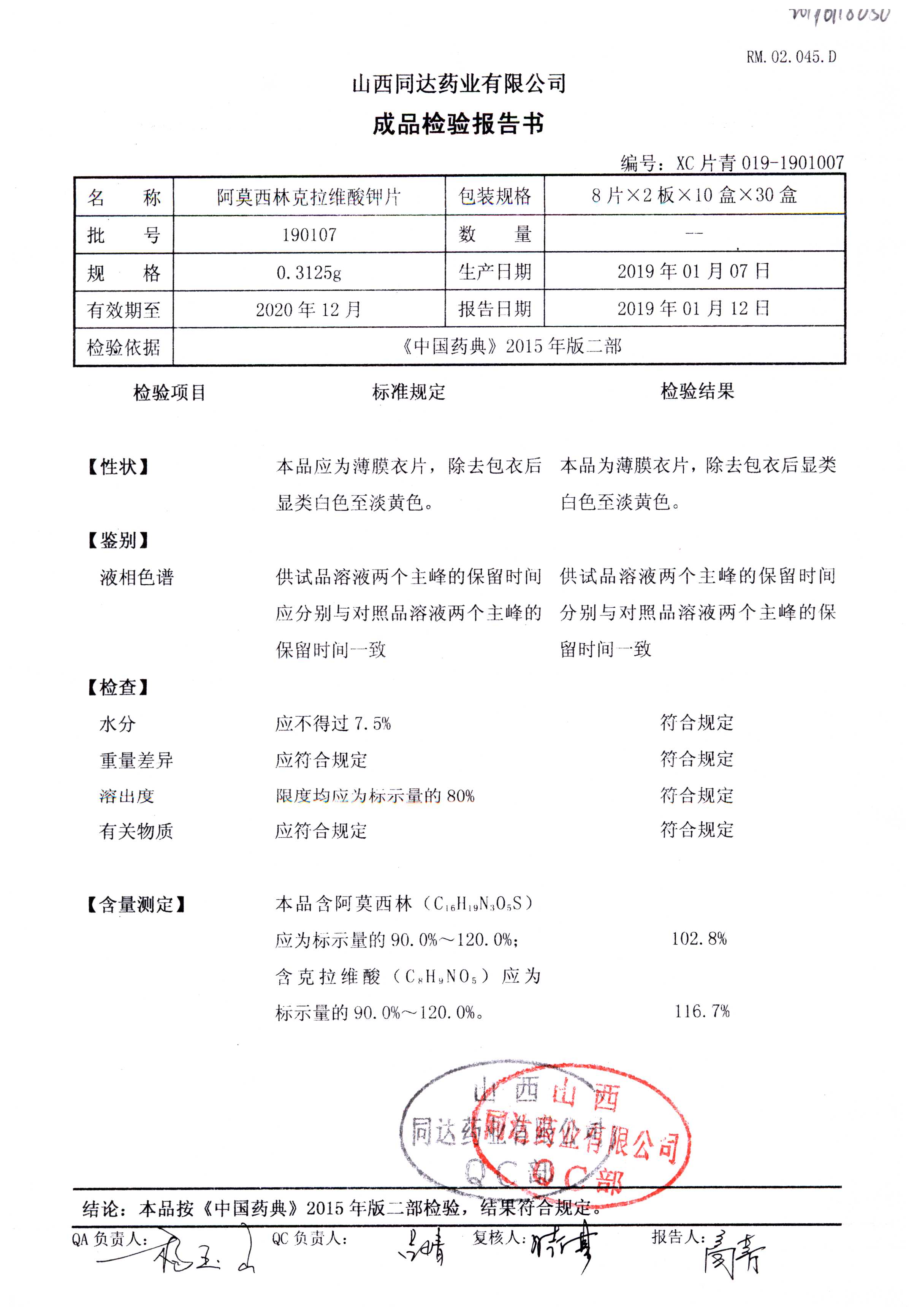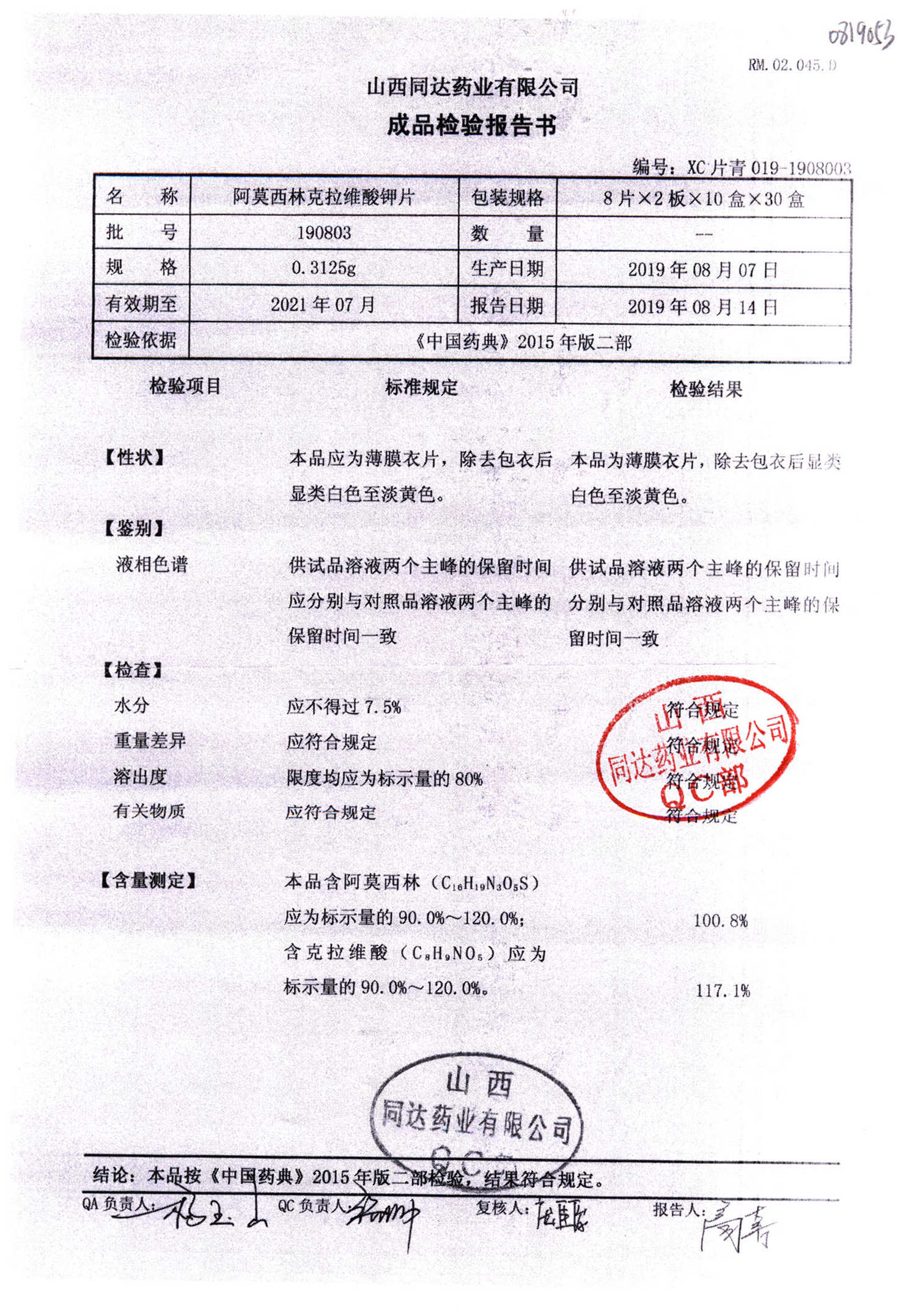 | 阿莫西林克拉維酸鉀片 | 0.3125g*16s | 190326 | 查看詳情 |