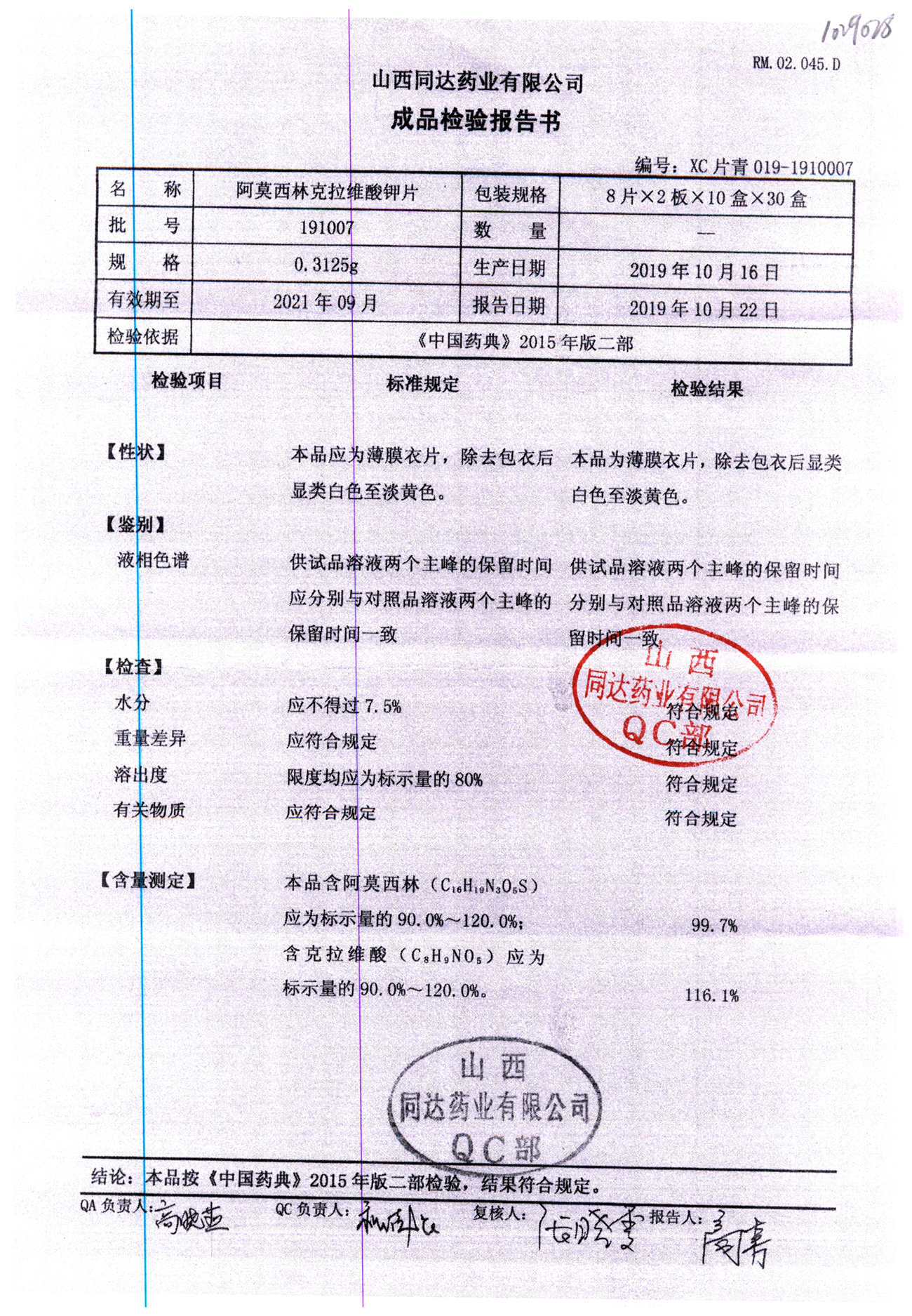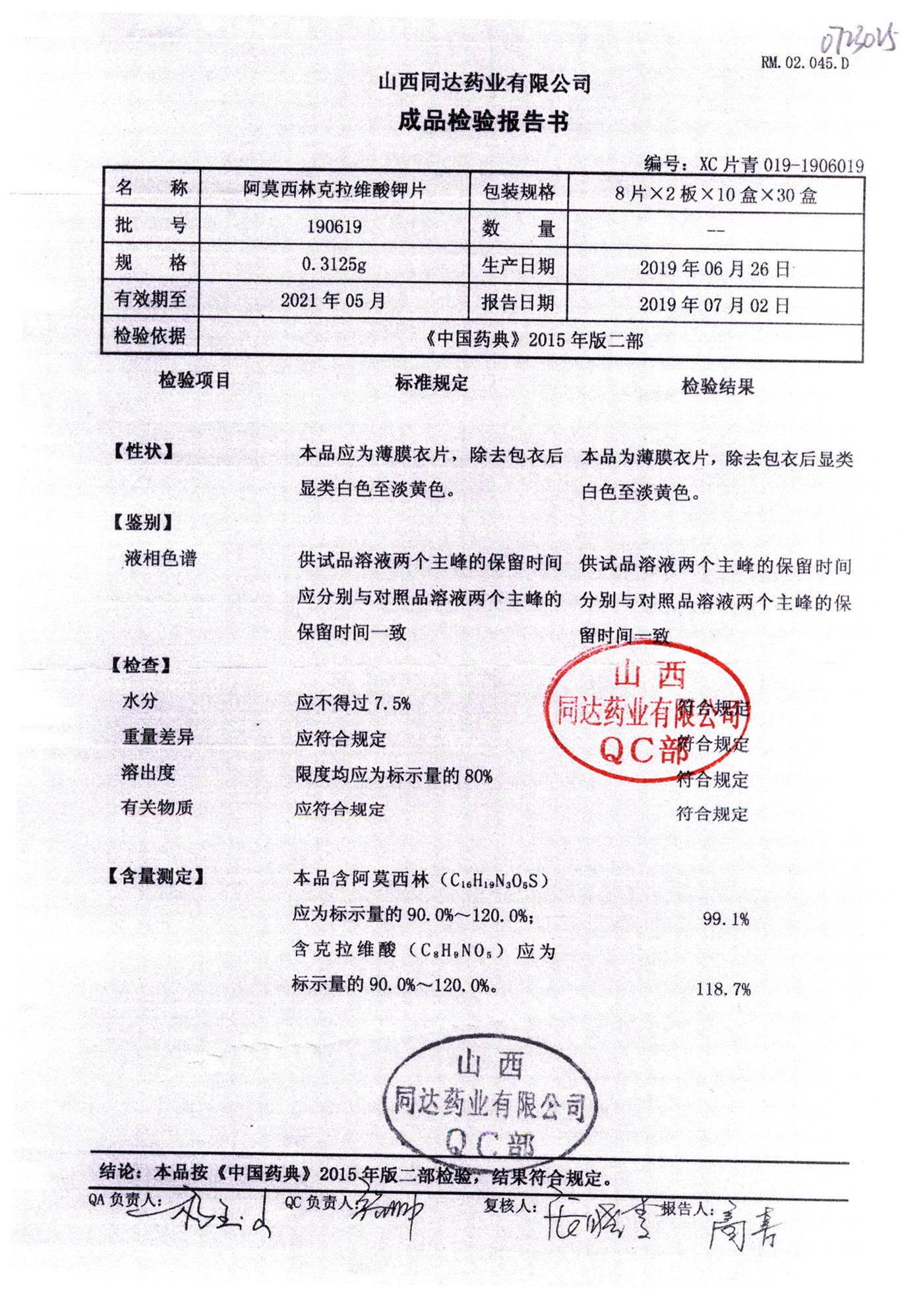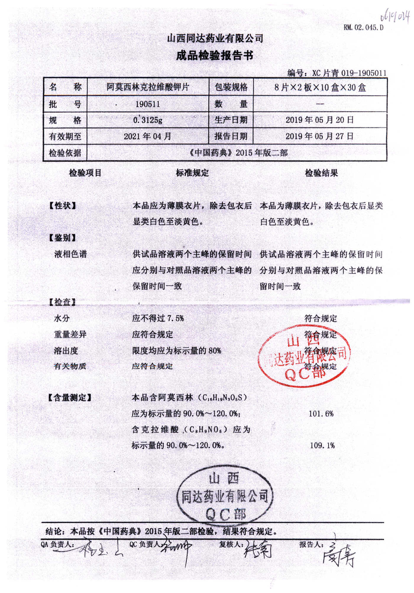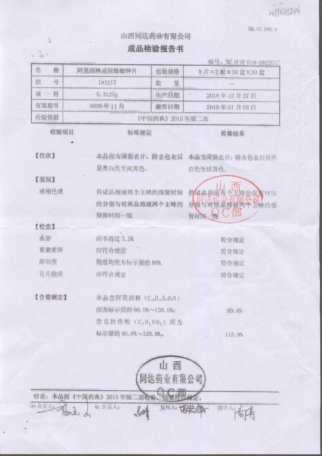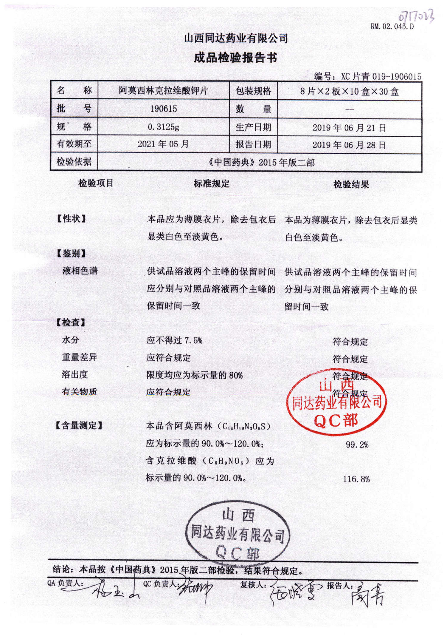 | 阿莫西林克拉維酸鉀片 | 0.3125g*16s | 190326 | 查看詳情 |