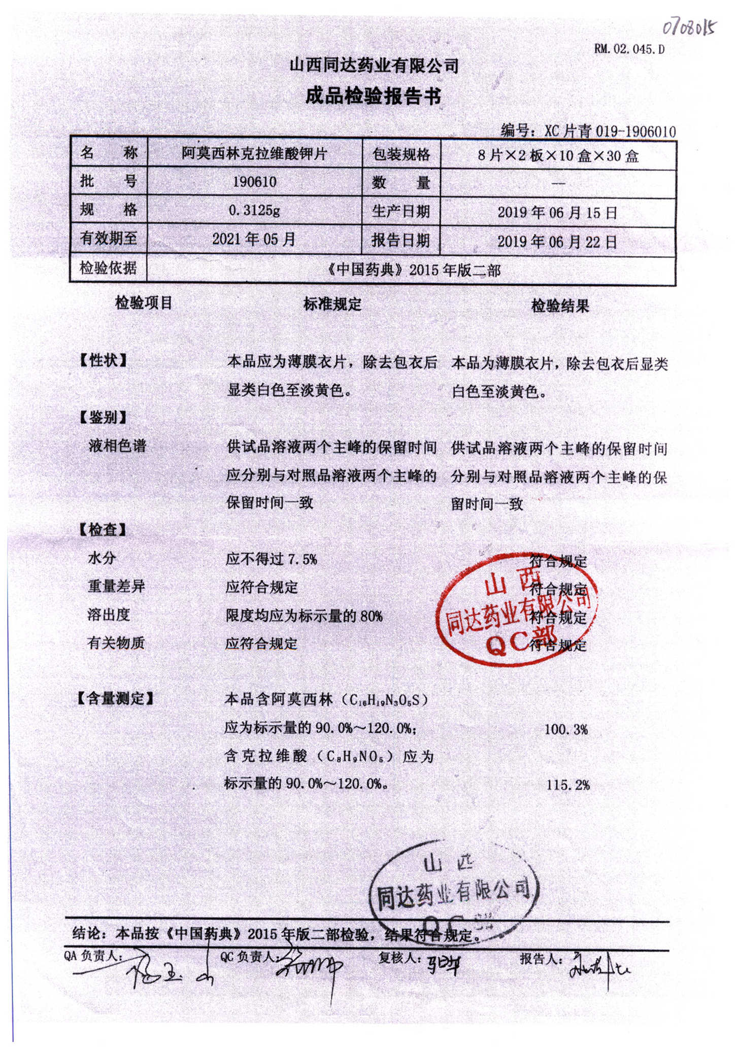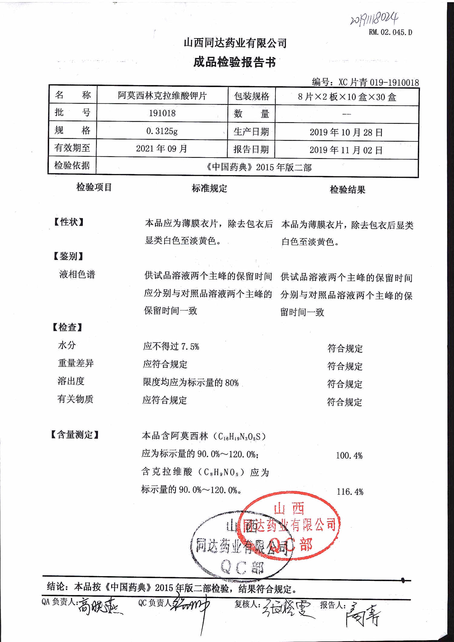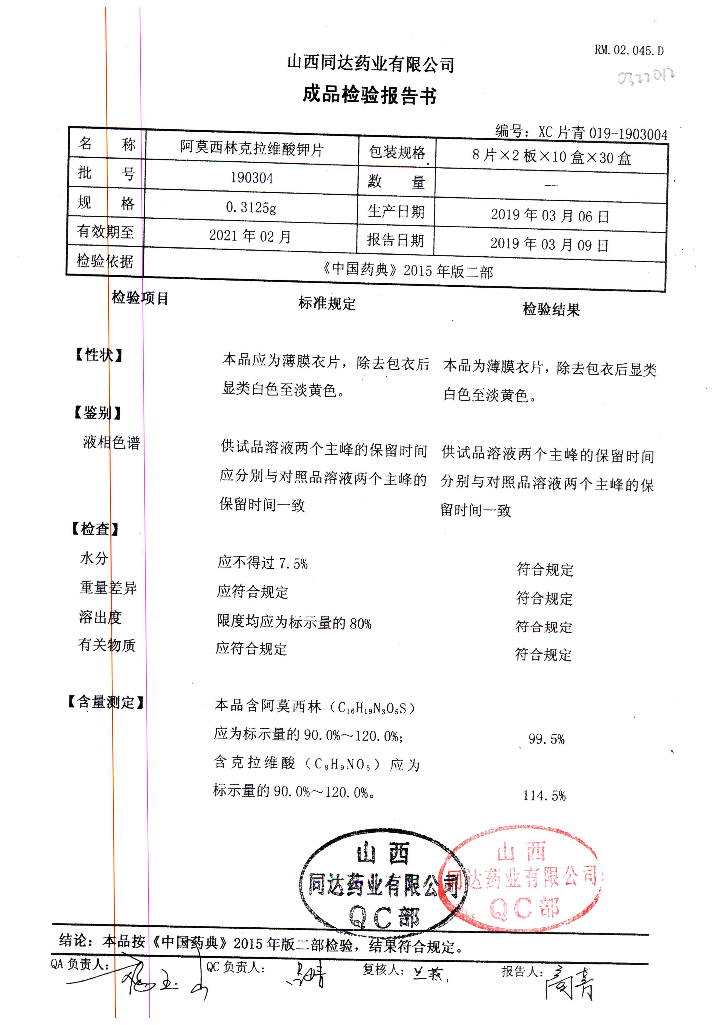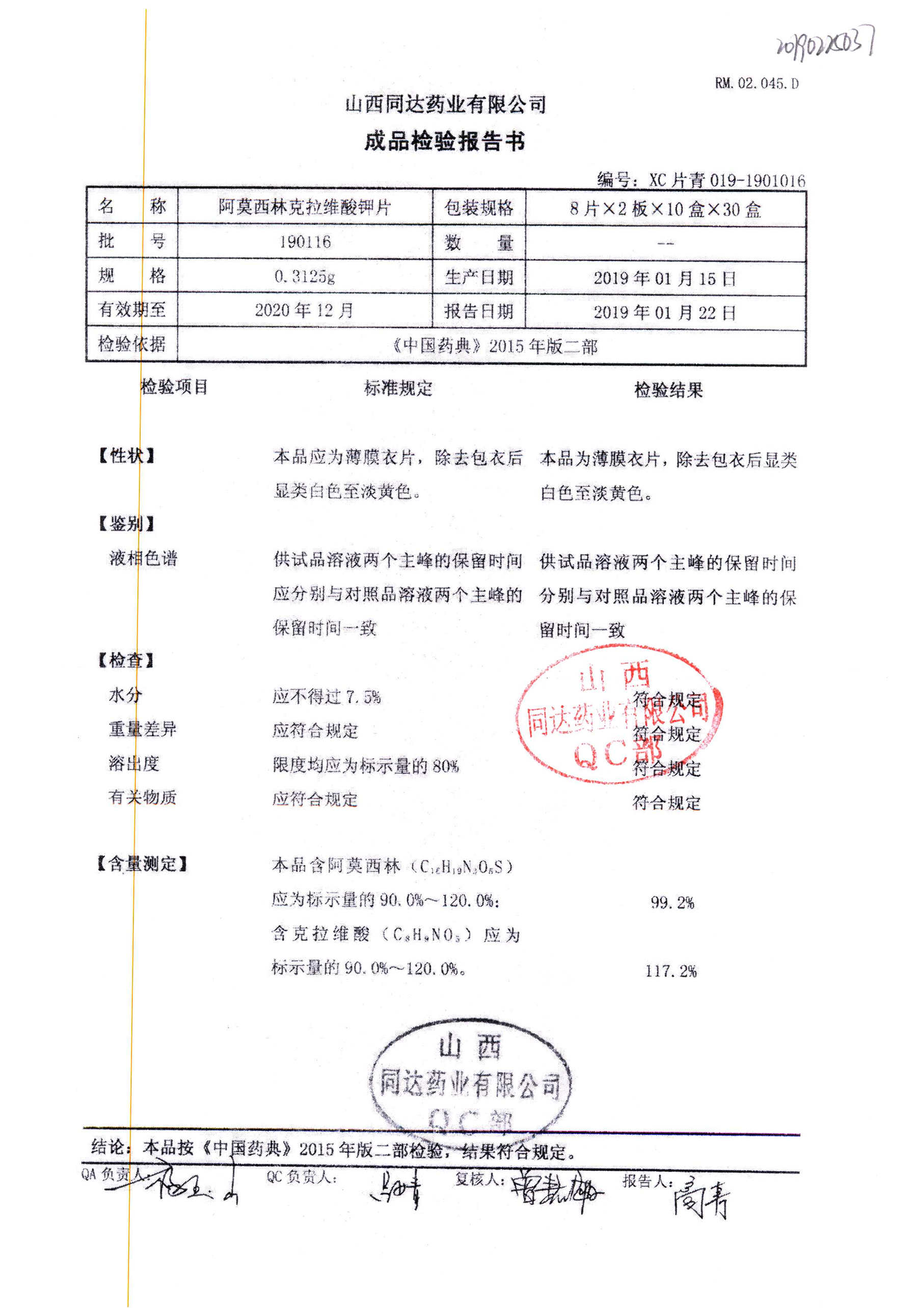 | 阿莫西林克拉維酸鉀片 | 0.3125g*16s | 190326 | 查看詳情 |