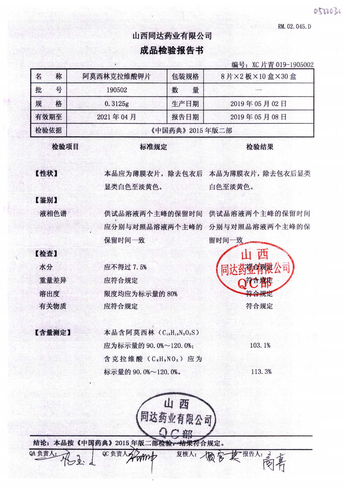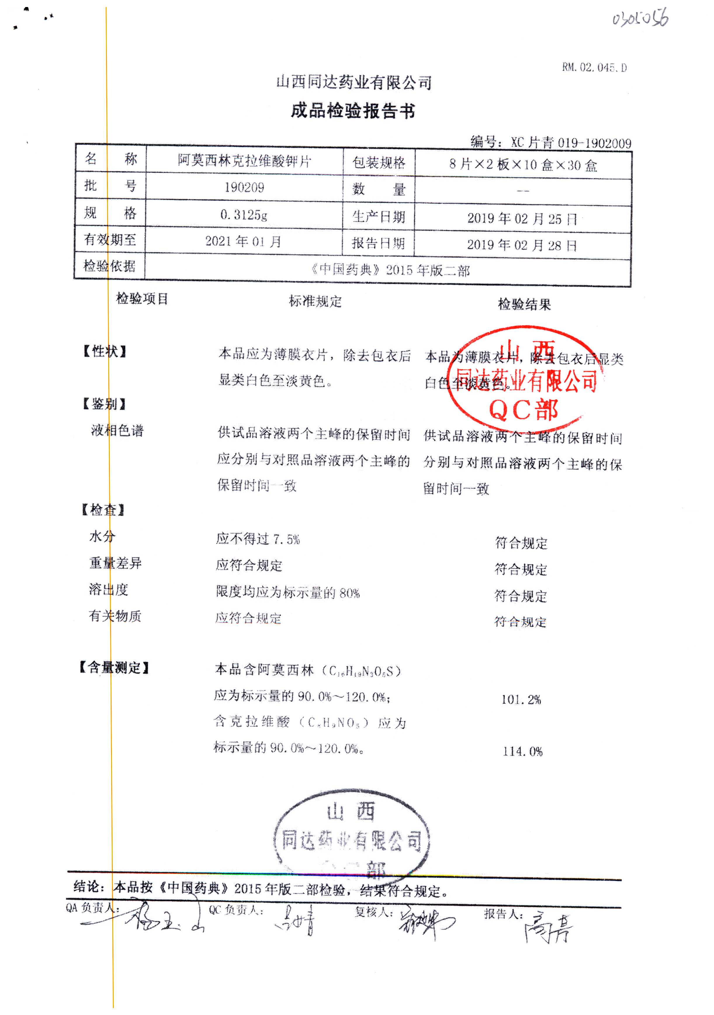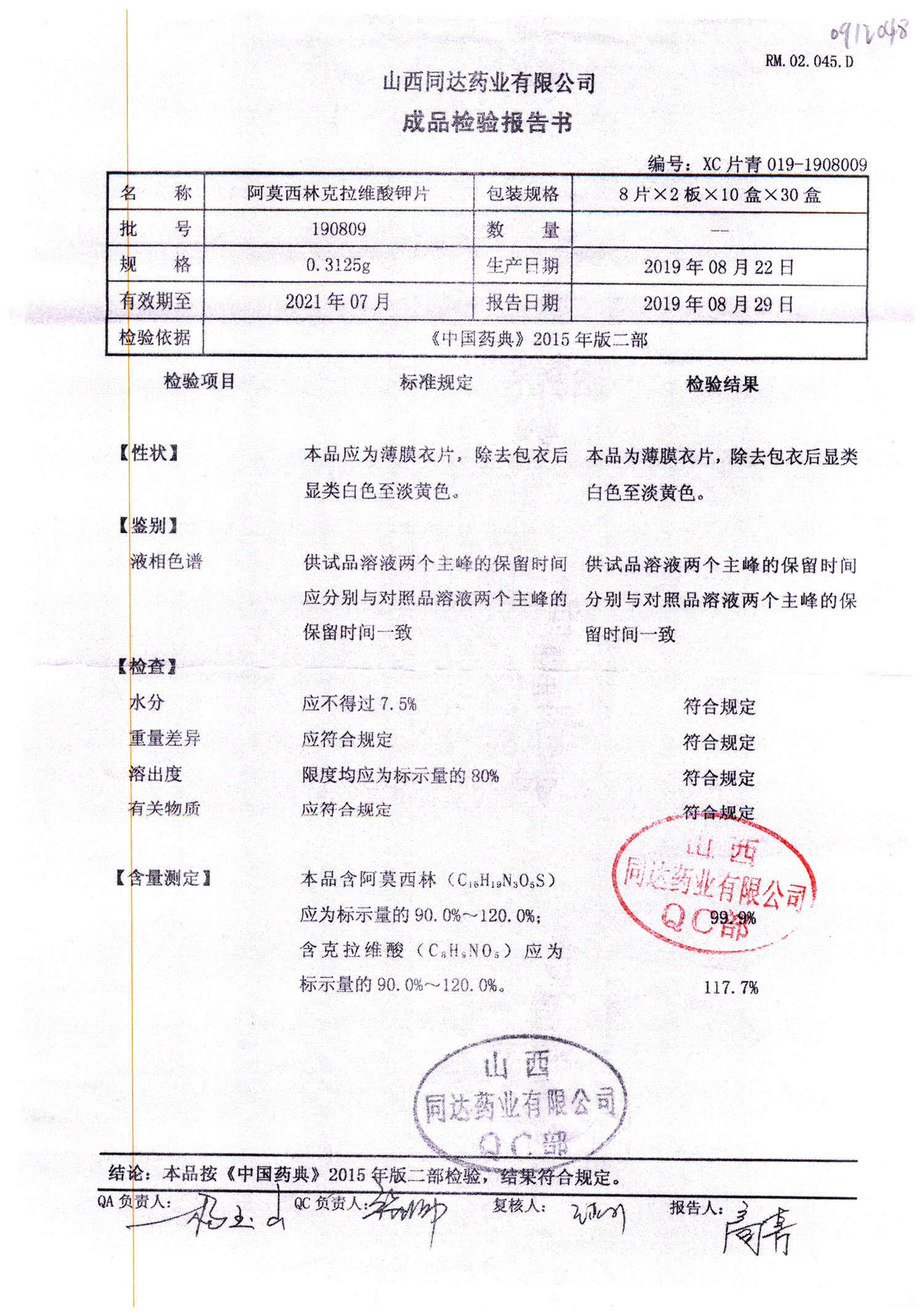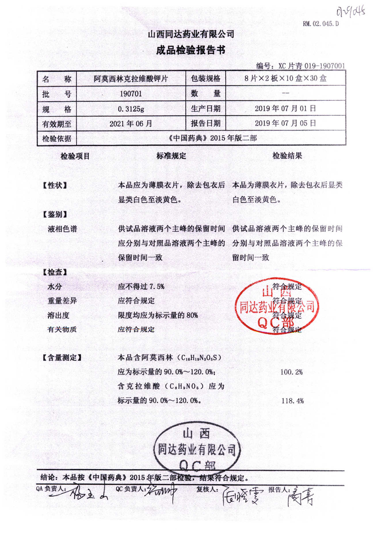 | 阿莫西林克拉維酸鉀片 | 0.3125g*16s | 190326 | 查看詳情 |