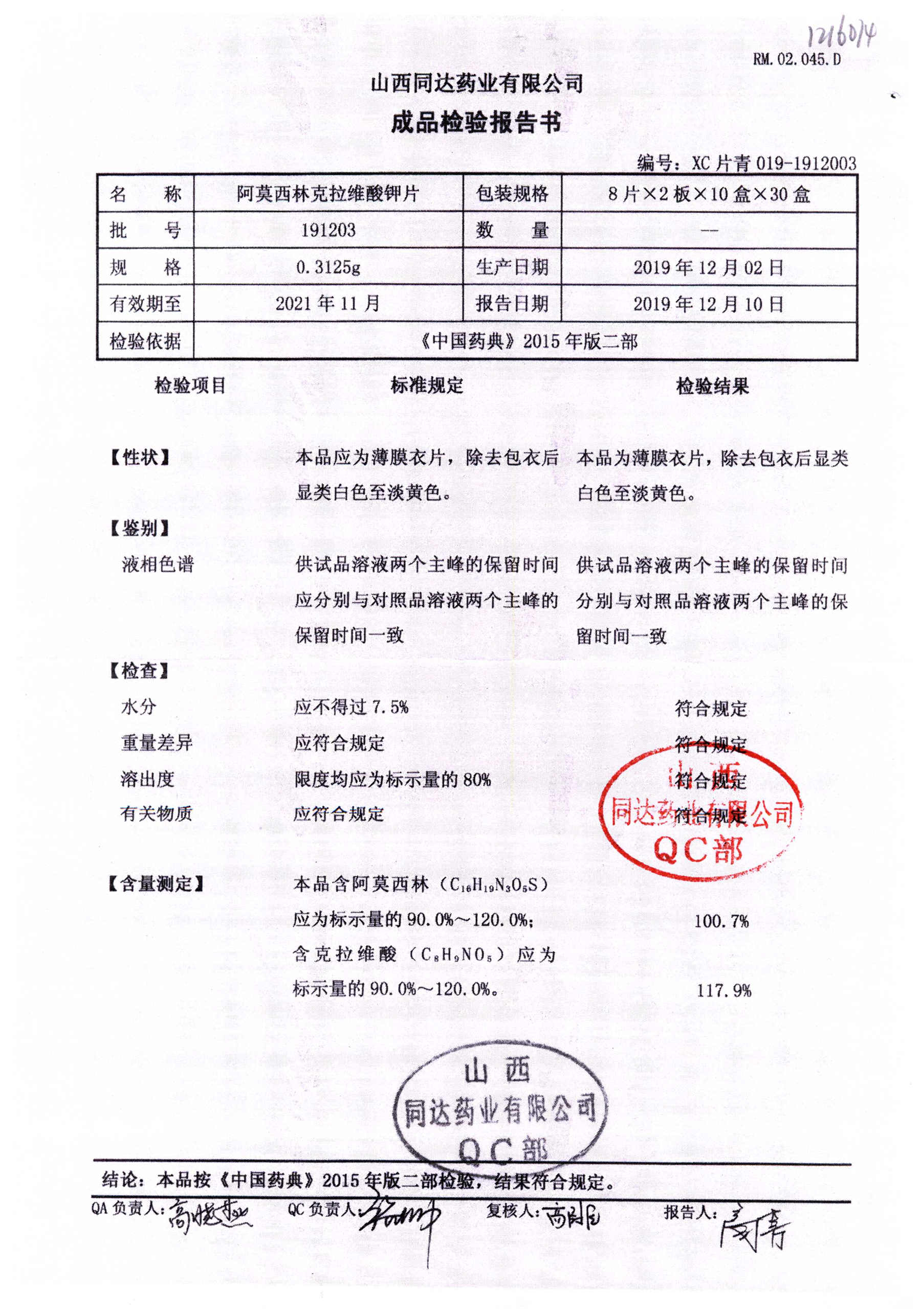 | 阿莫西林克拉維酸鉀片 | 0.3125g*16s | 191203 | 查看詳情 |