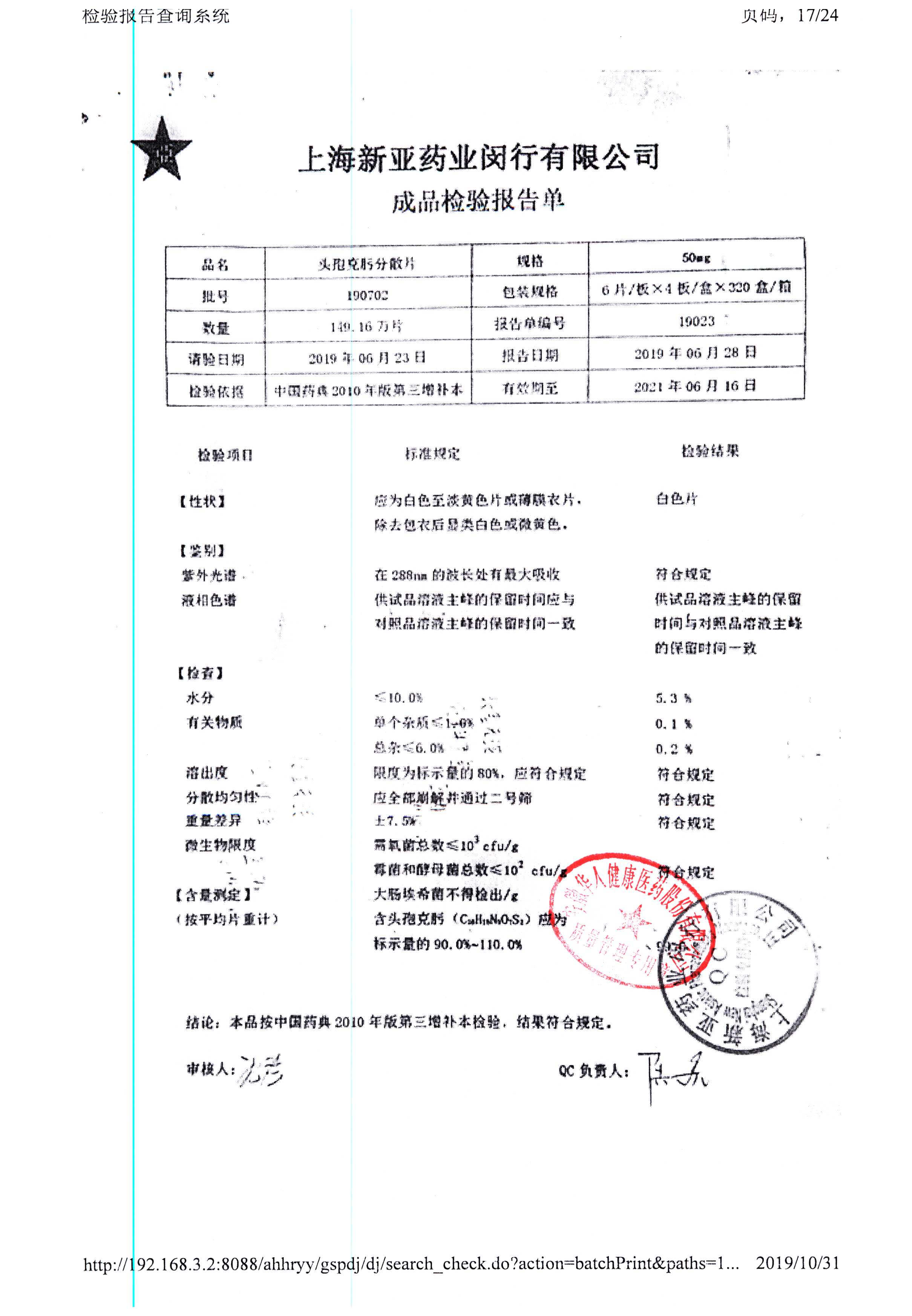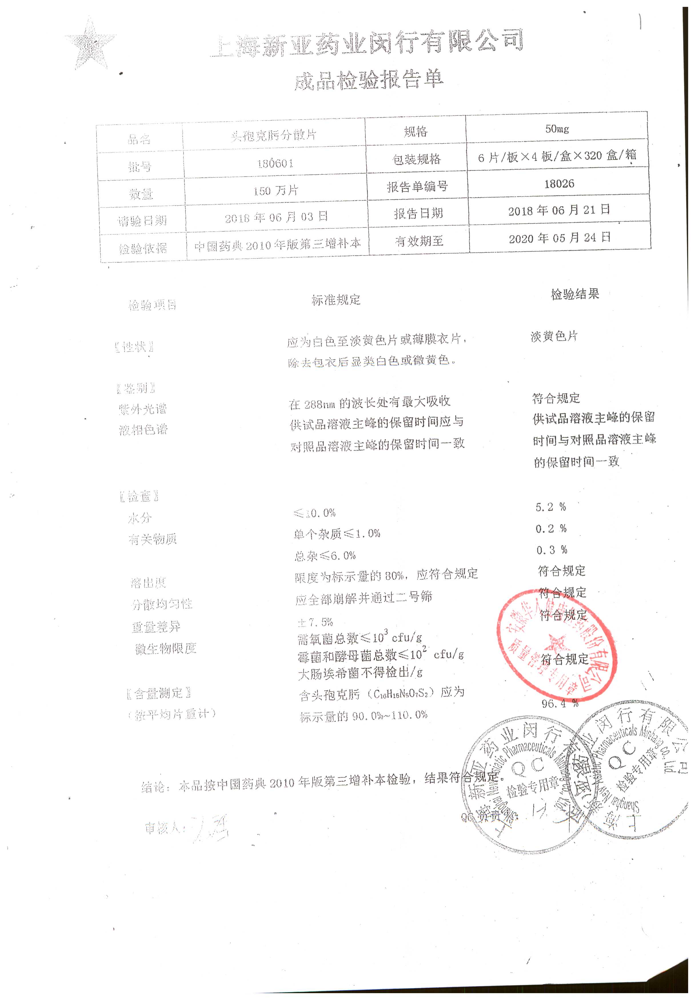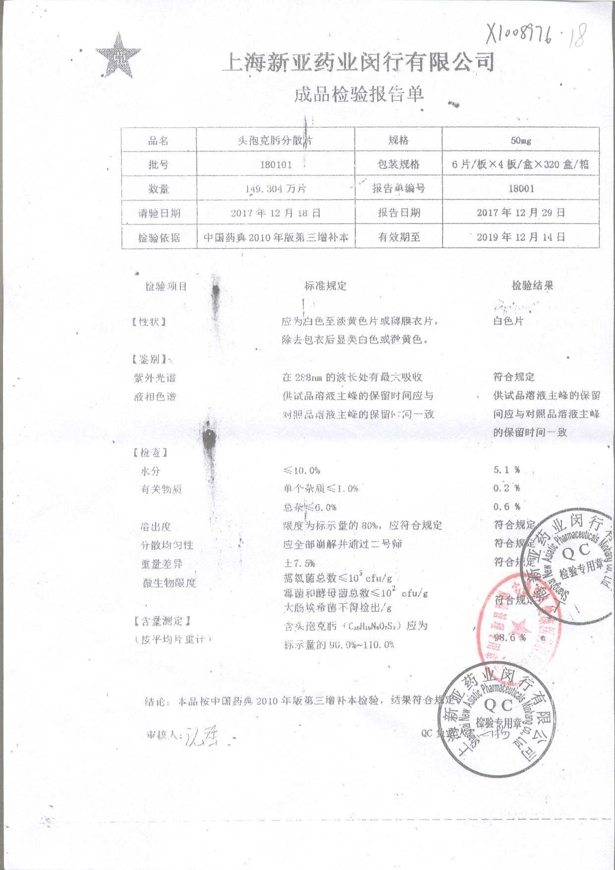 | 頭孢克肟分散片 | 50mg*24s | 190701 | 查看詳情 |