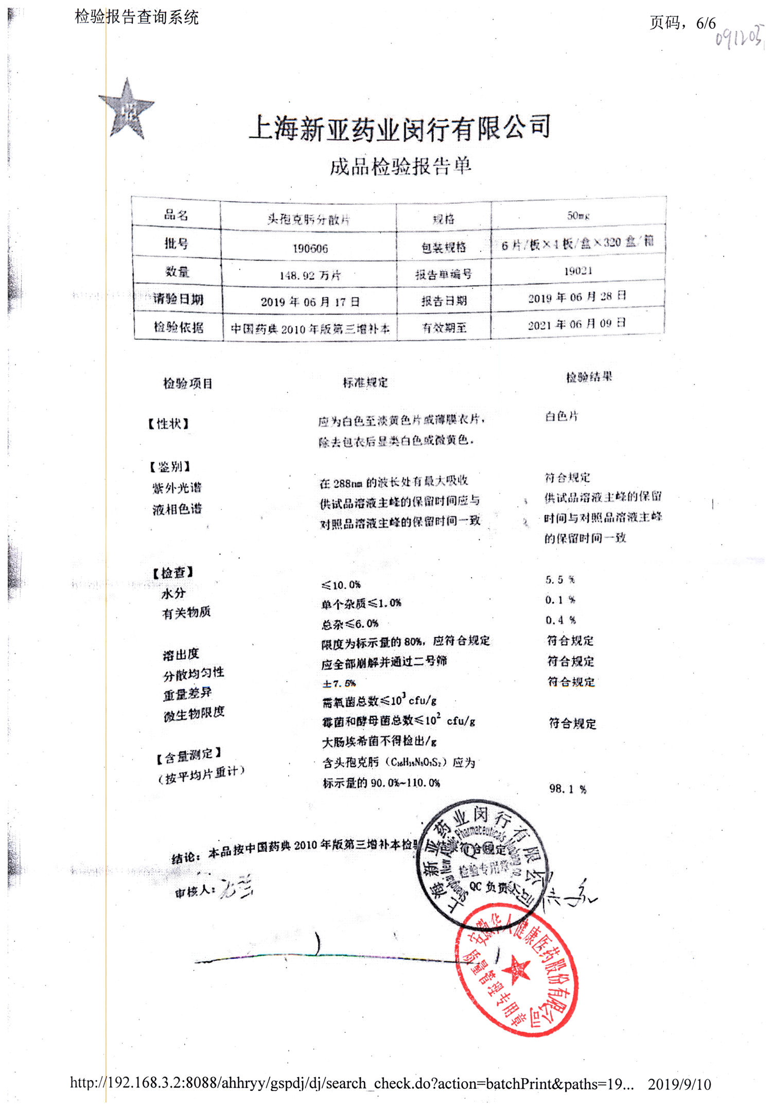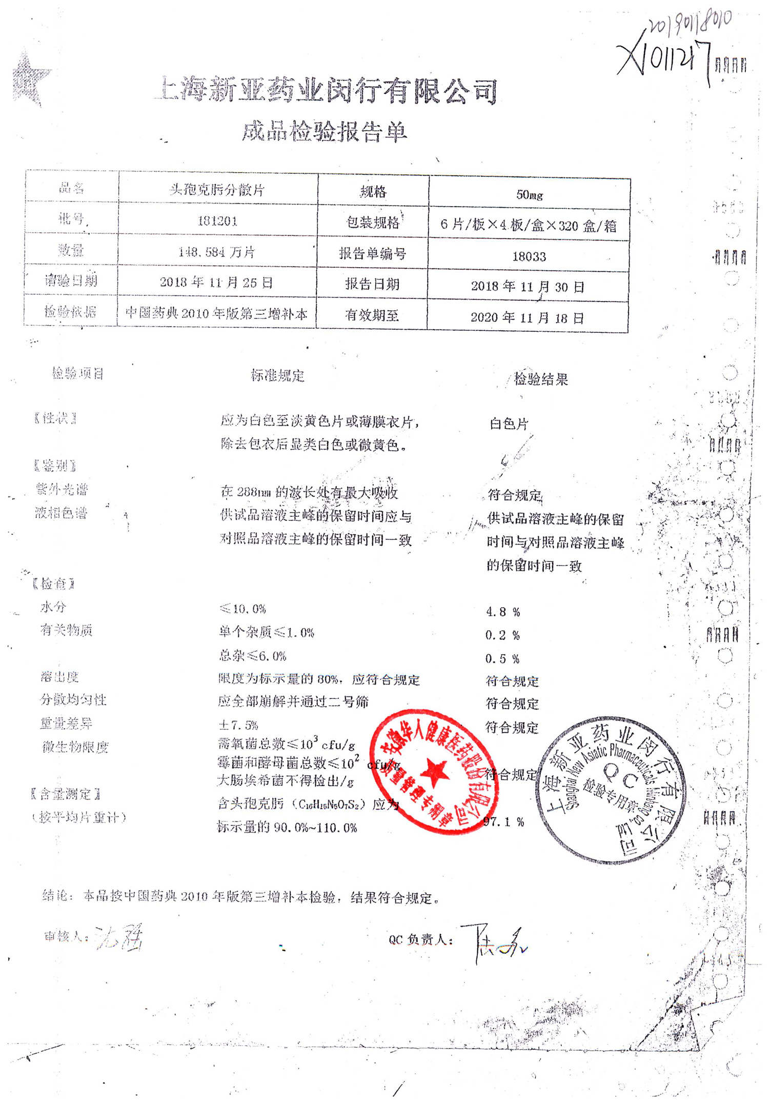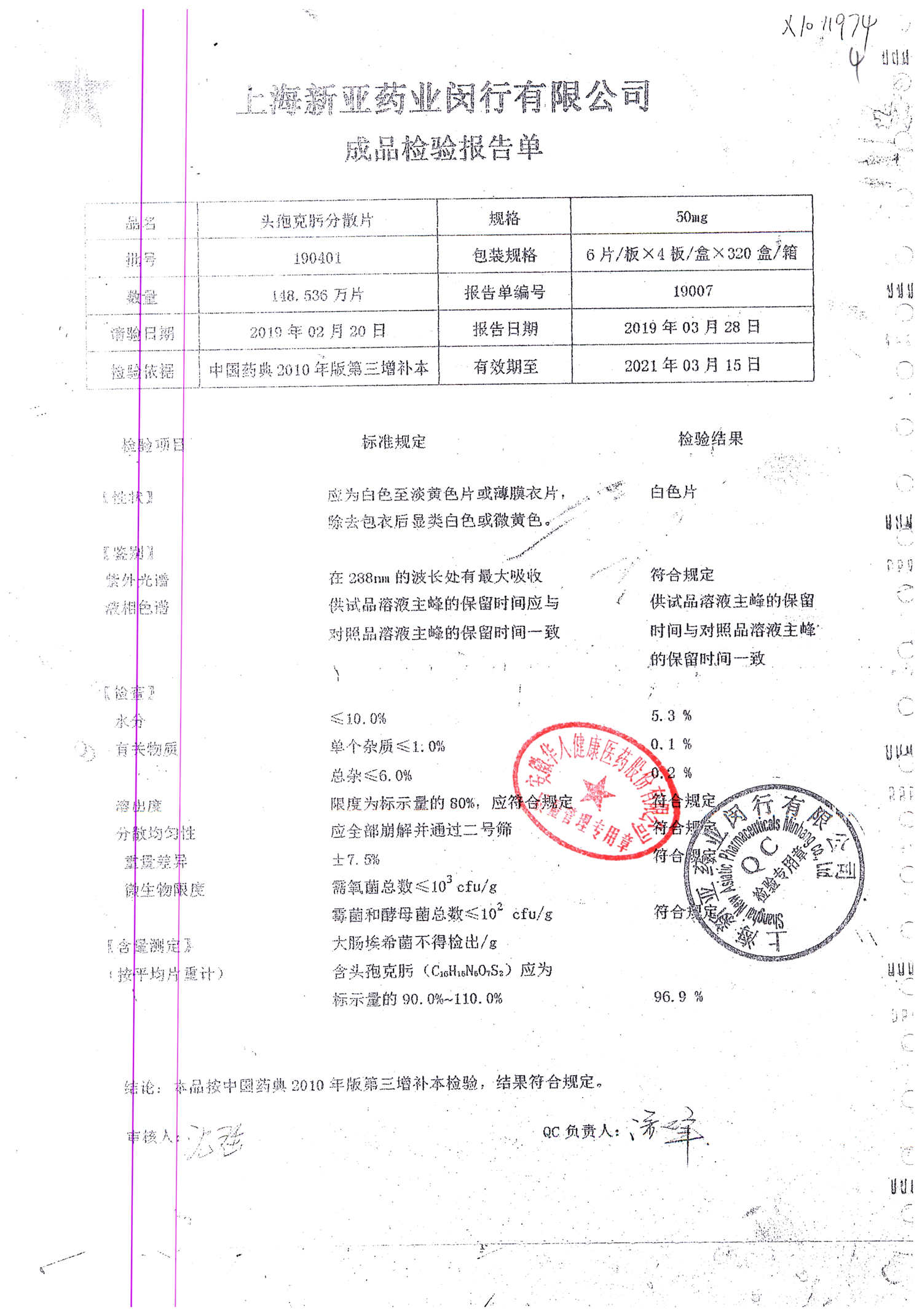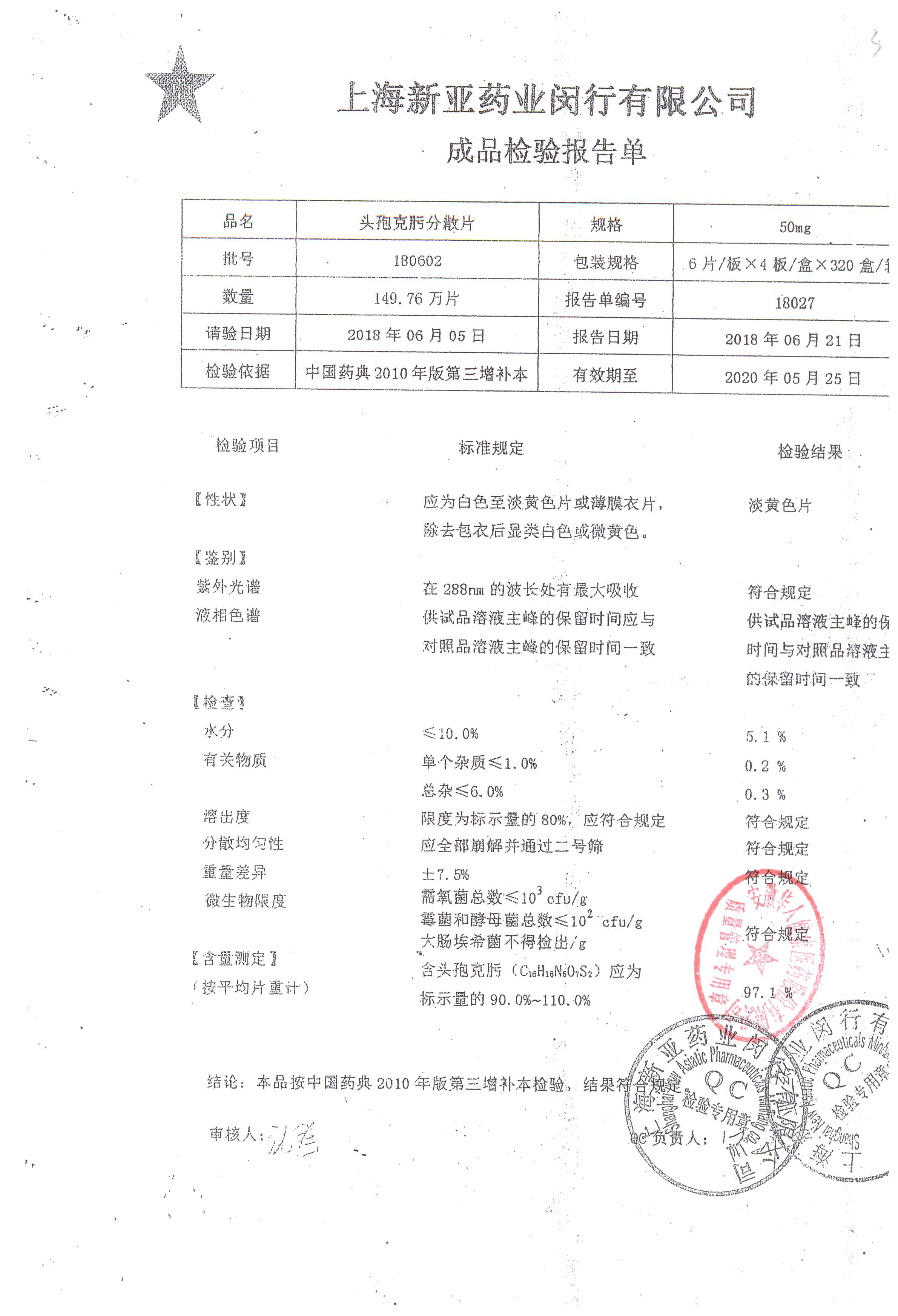 | 頭孢克肟分散片 | 50mg*24s | 190701 | 查看詳情 |