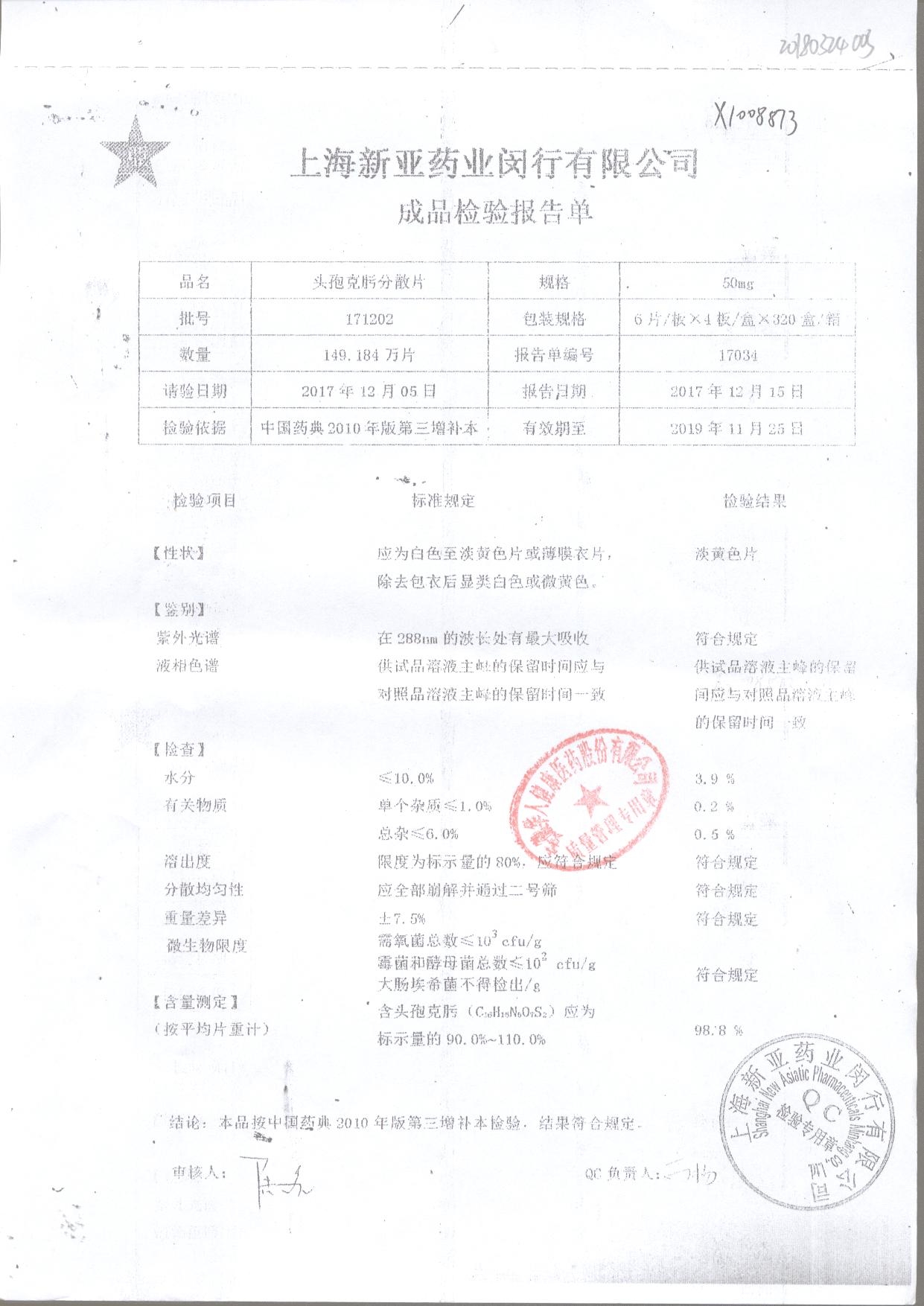 | 頭孢克肟分散片 | 50mg*24s | 180401 | 查看詳情 |