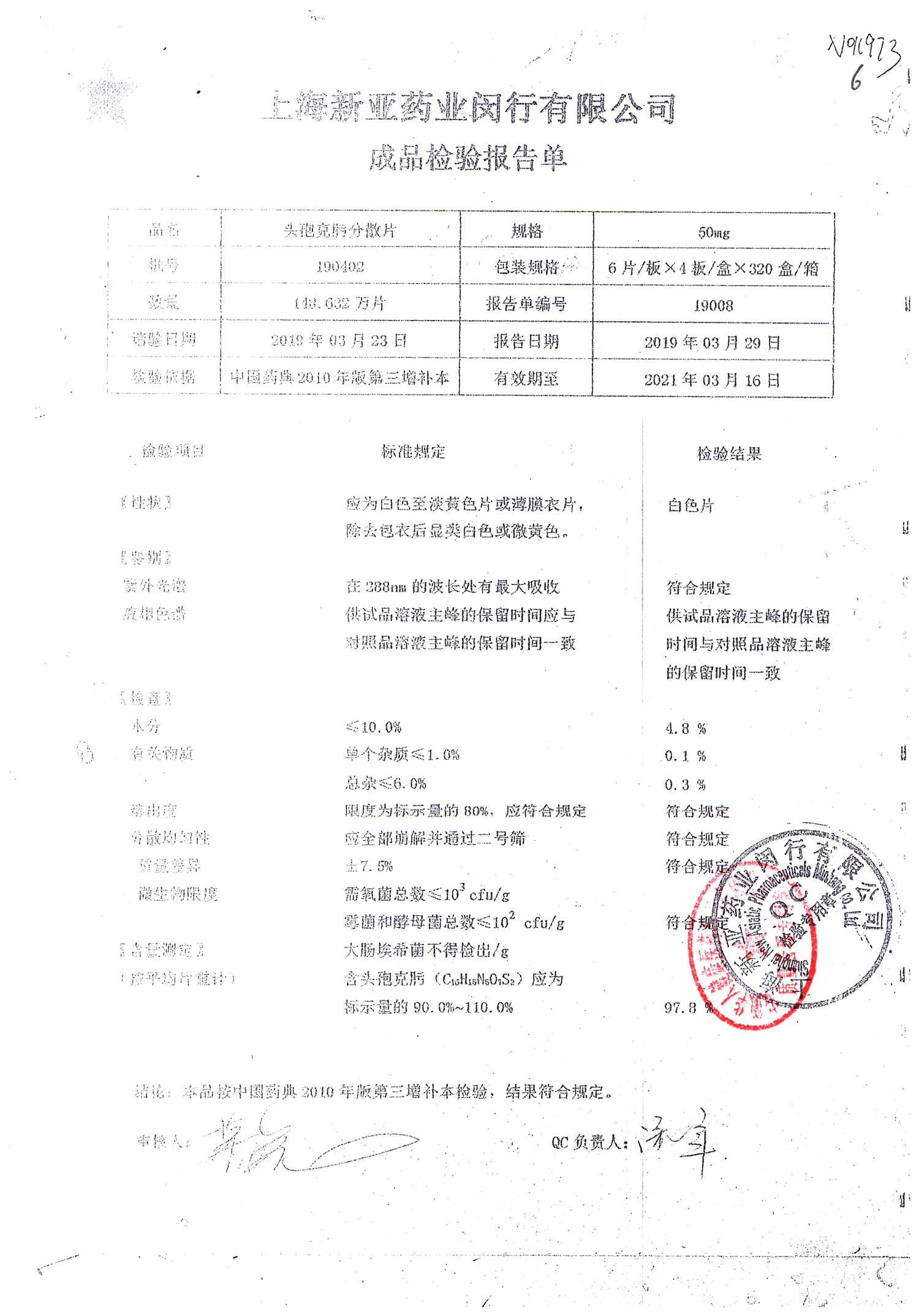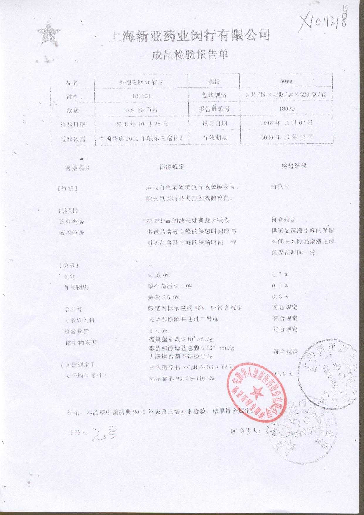 | 頭孢克肟分散片 | 50mg*24s | 190401 | 查看詳情 |