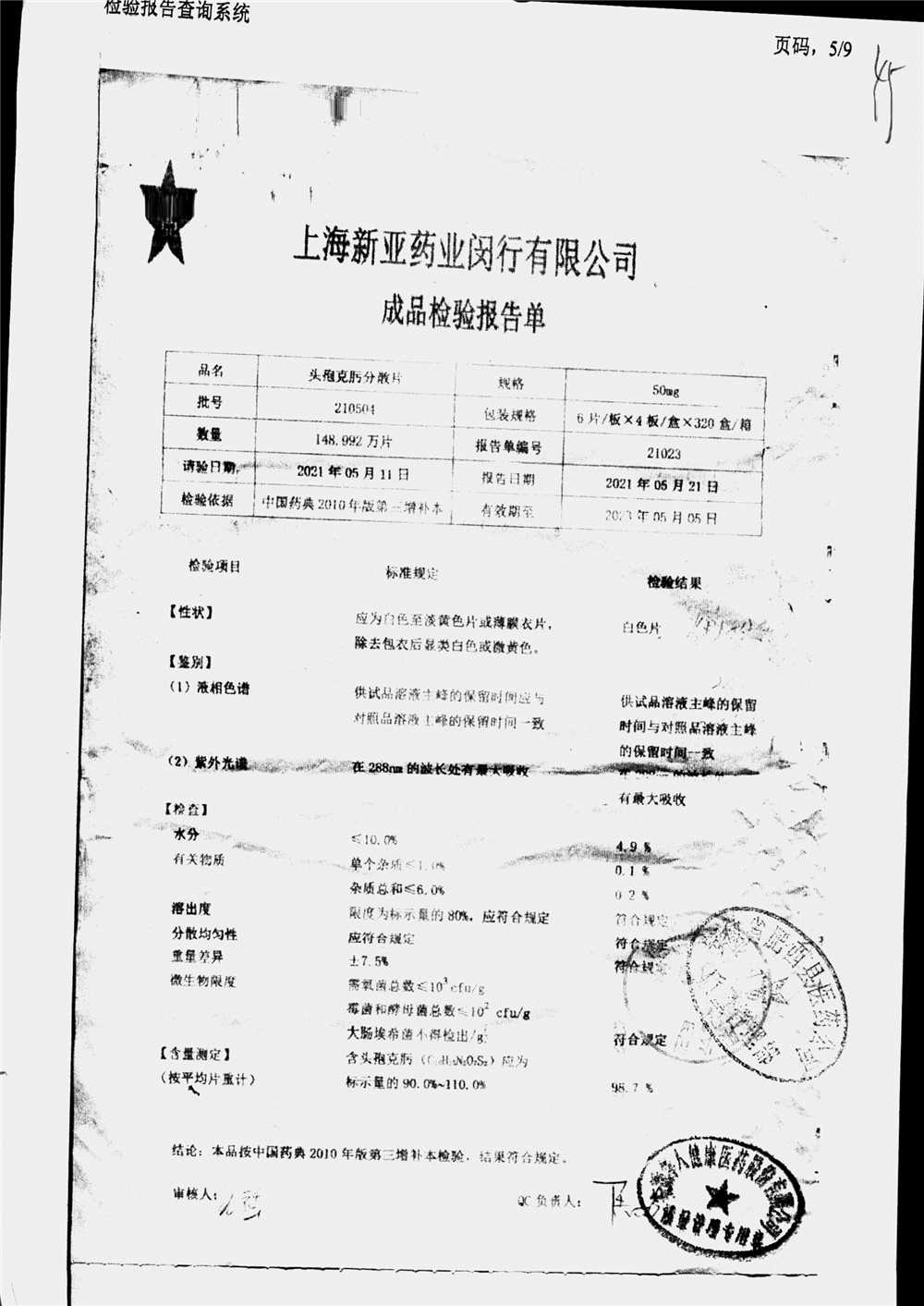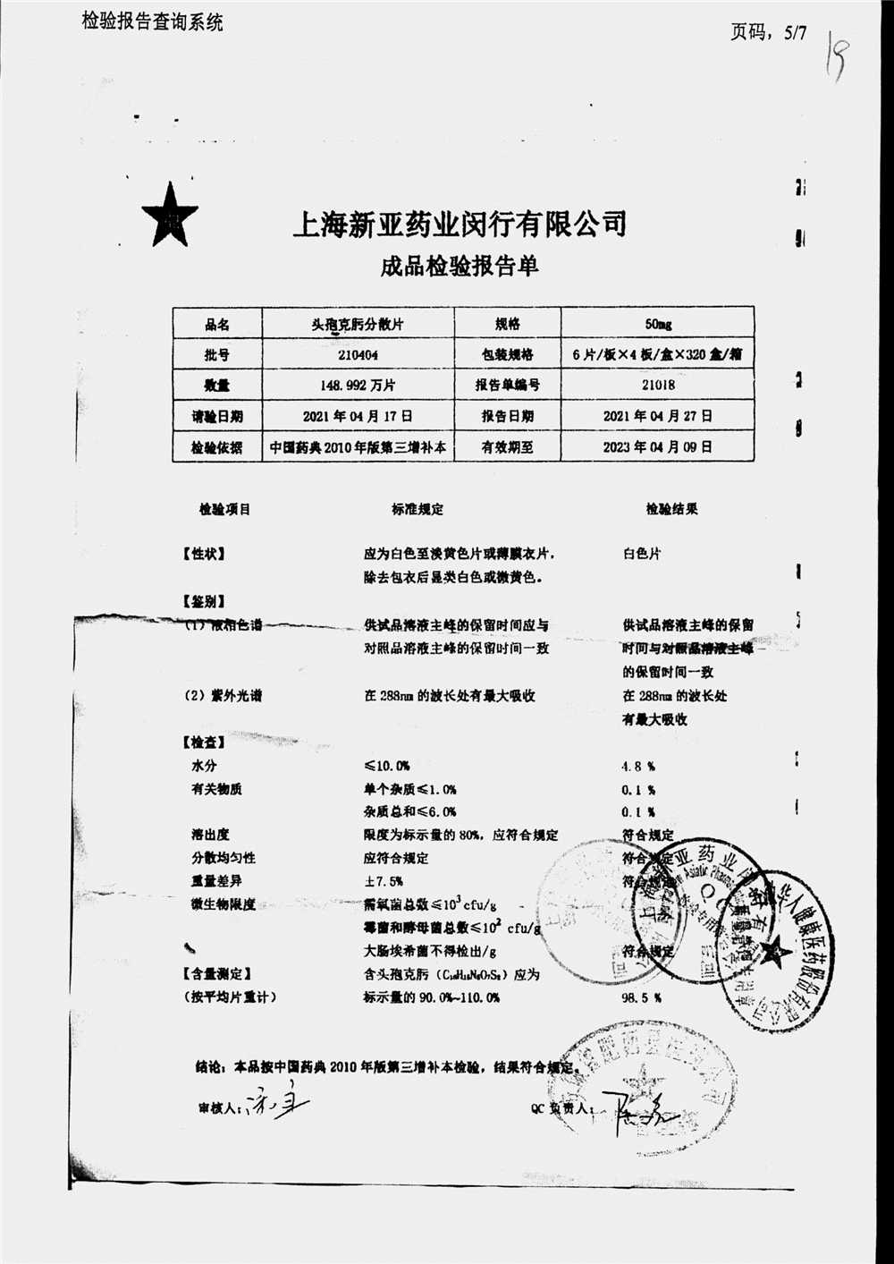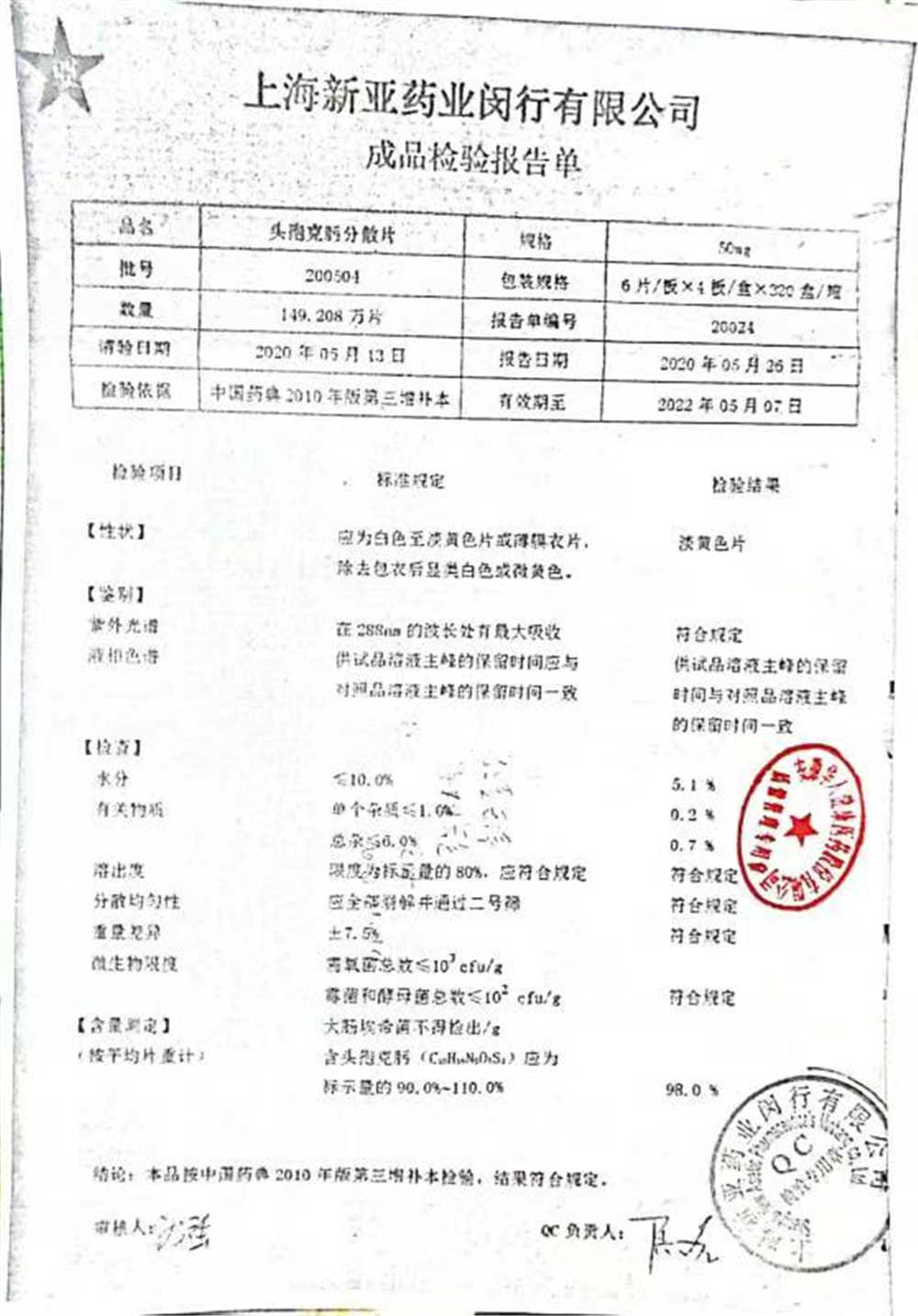 | 頭孢克肟分散片 | 50mg*24s | 210503 | 查看詳情 |
