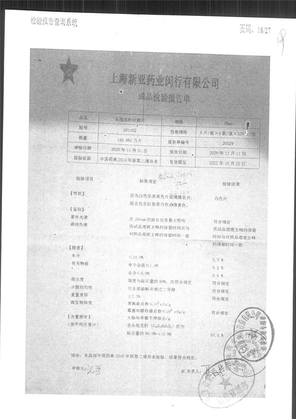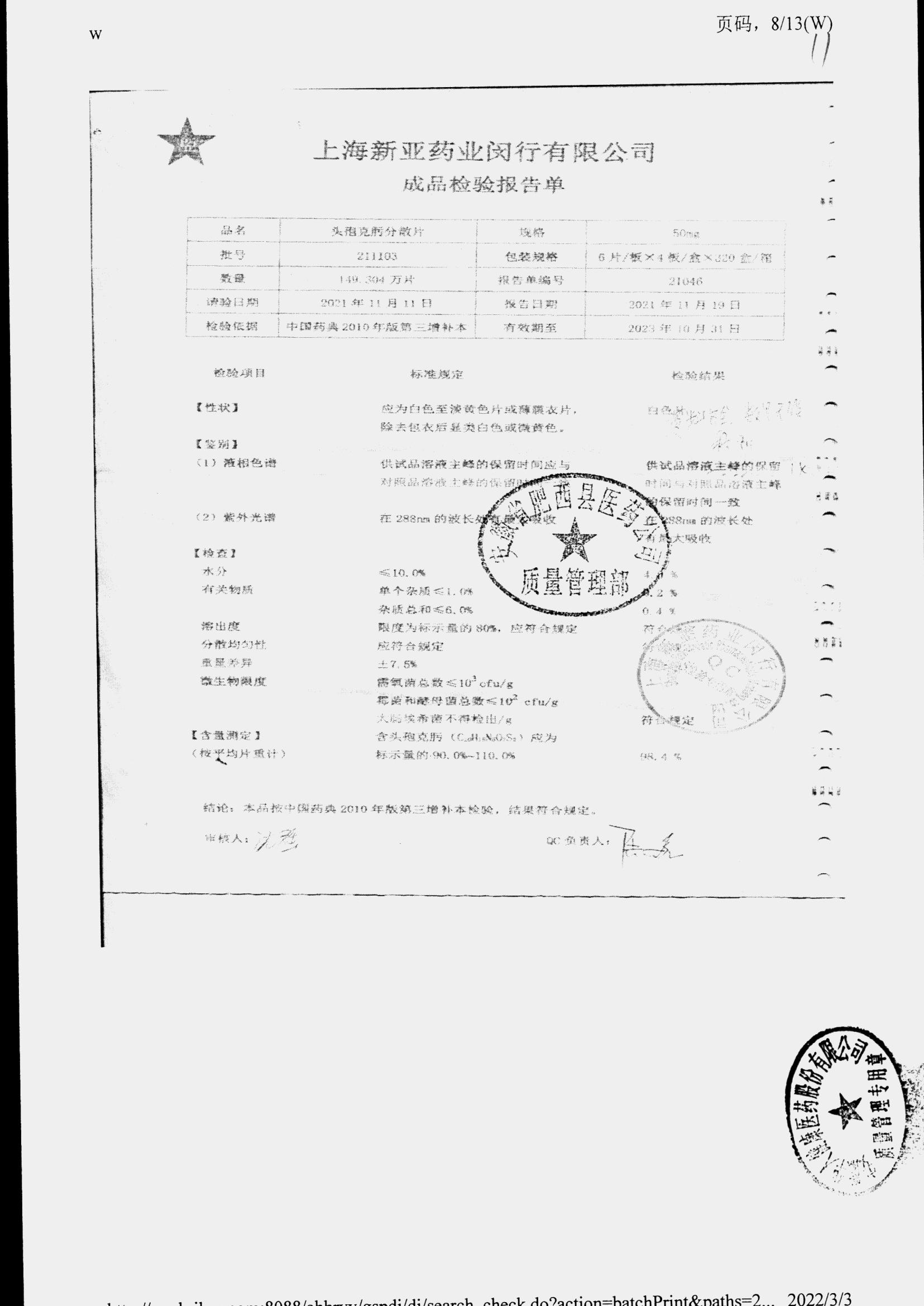 | 頭孢克肟分散片 | 50mg*24s | 210303 | 查看詳情 |