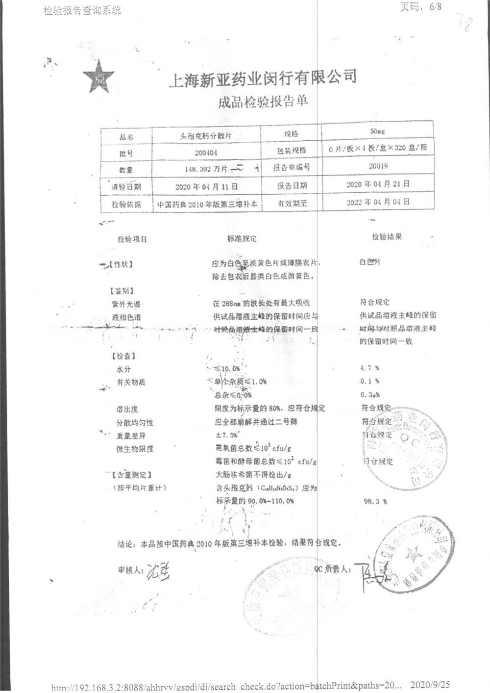 | 頭孢克肟分散片 | 50mg*24s | 210302 | 查看詳情 |