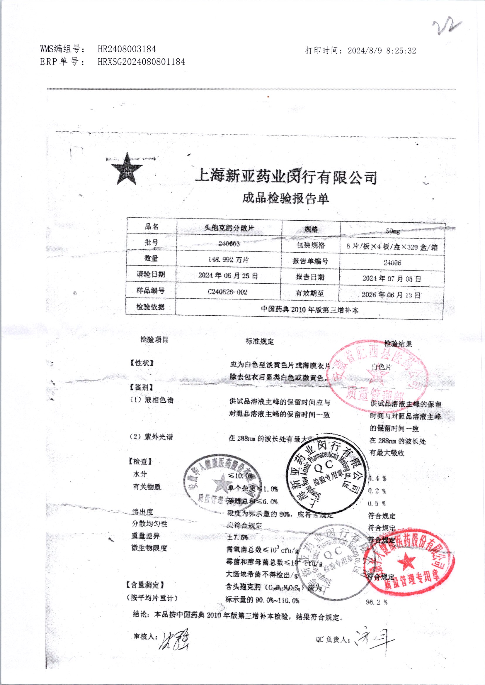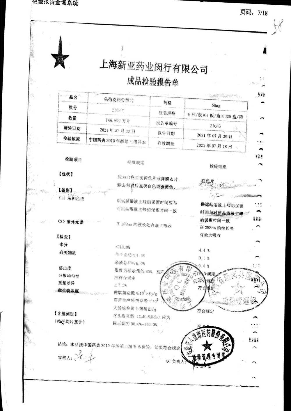 | 頭孢克肟分散片 | 50mg*24s | 210801 | 查看詳情 |