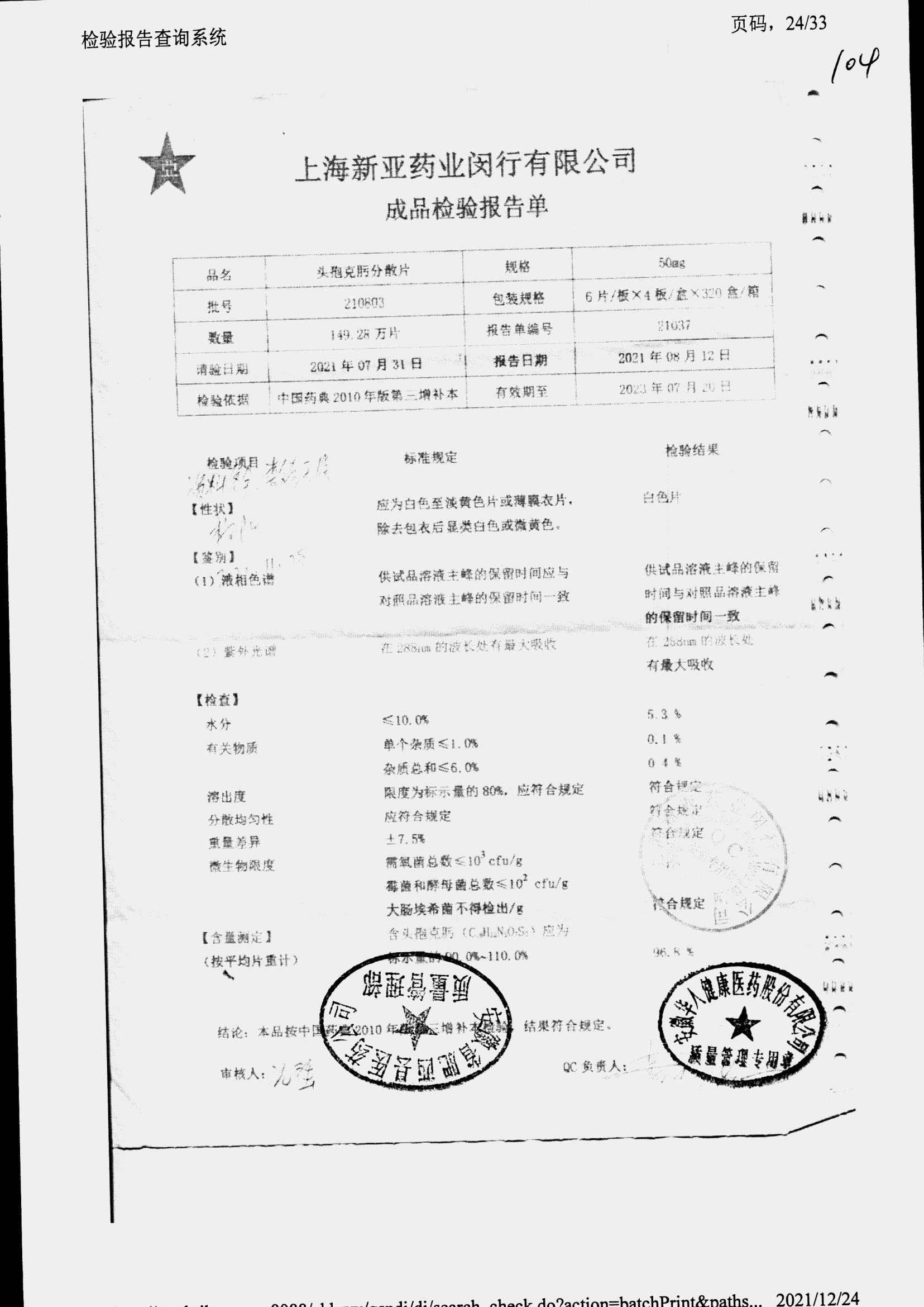 | 頭孢克肟分散片 | 50mg*24s | 211104 | 查看詳情 |