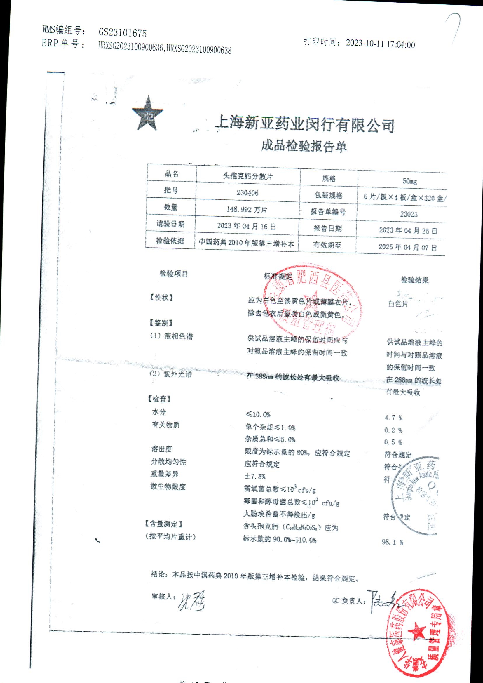 | 頭孢克肟分散片 | 50mg*24s | 230404 | 查看詳情 |