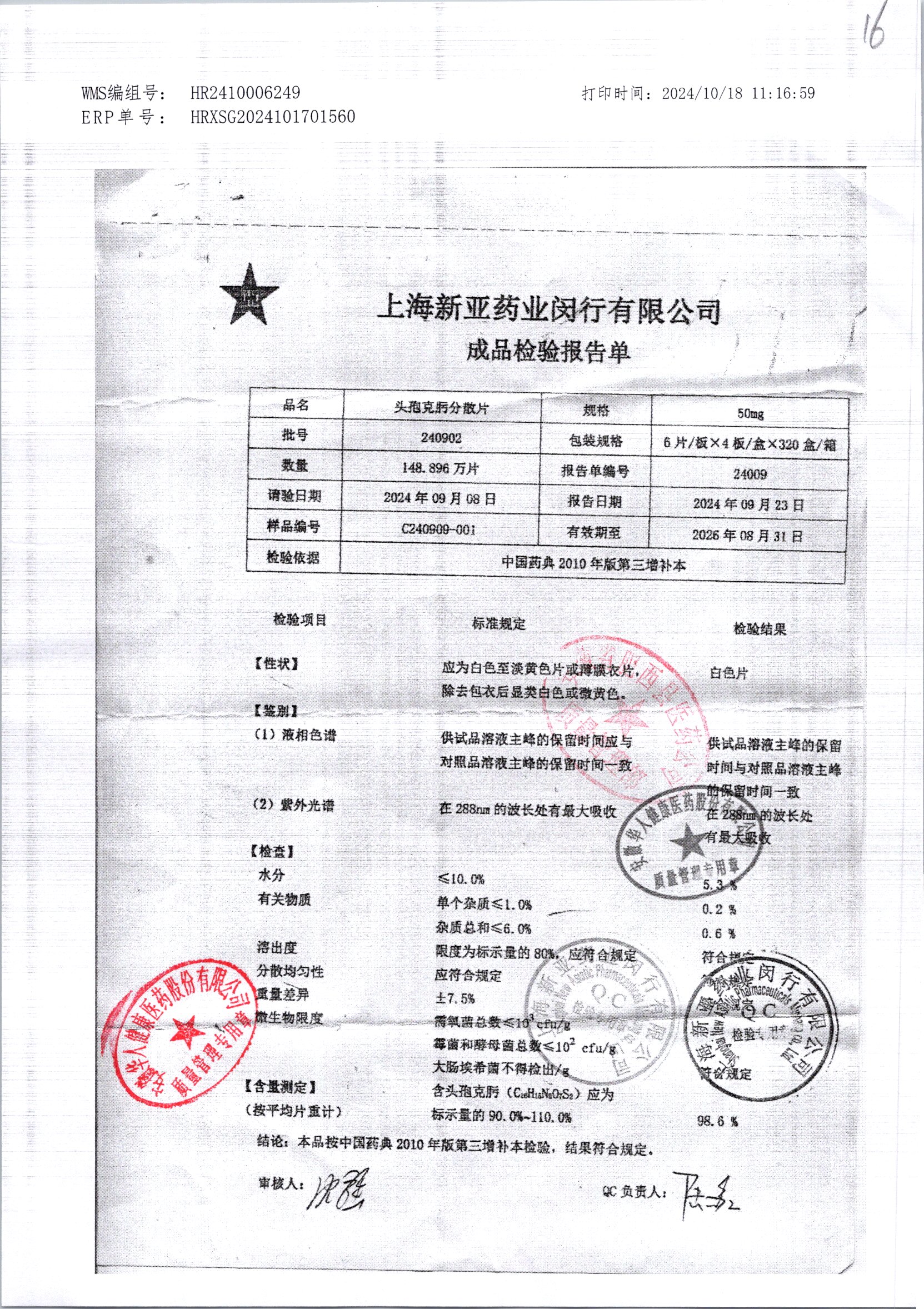 | 頭孢克肟分散片 | 50mg*24s | 240903 | 查看詳情 |