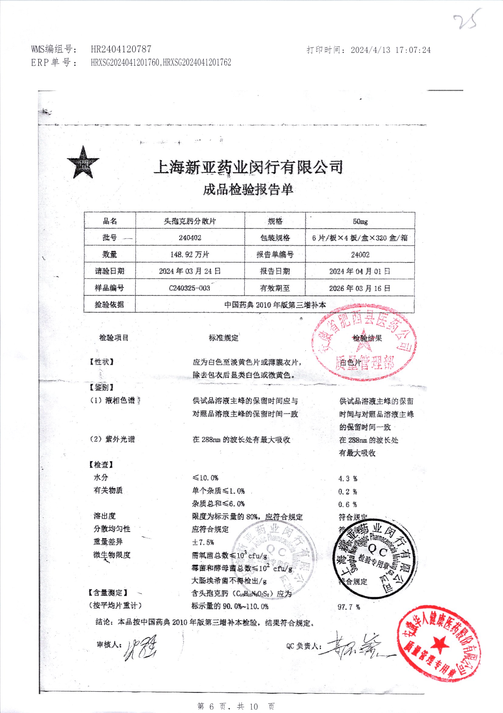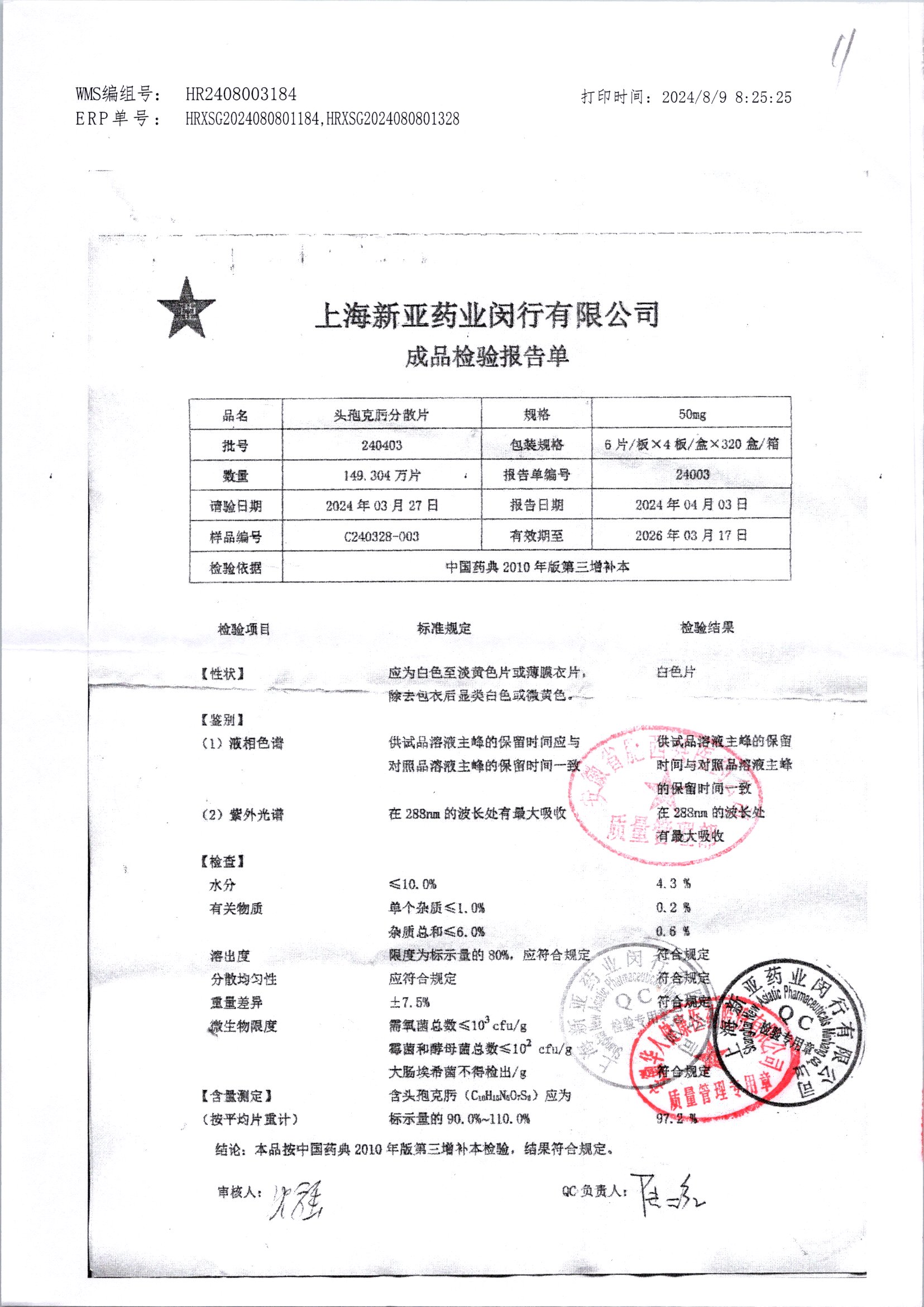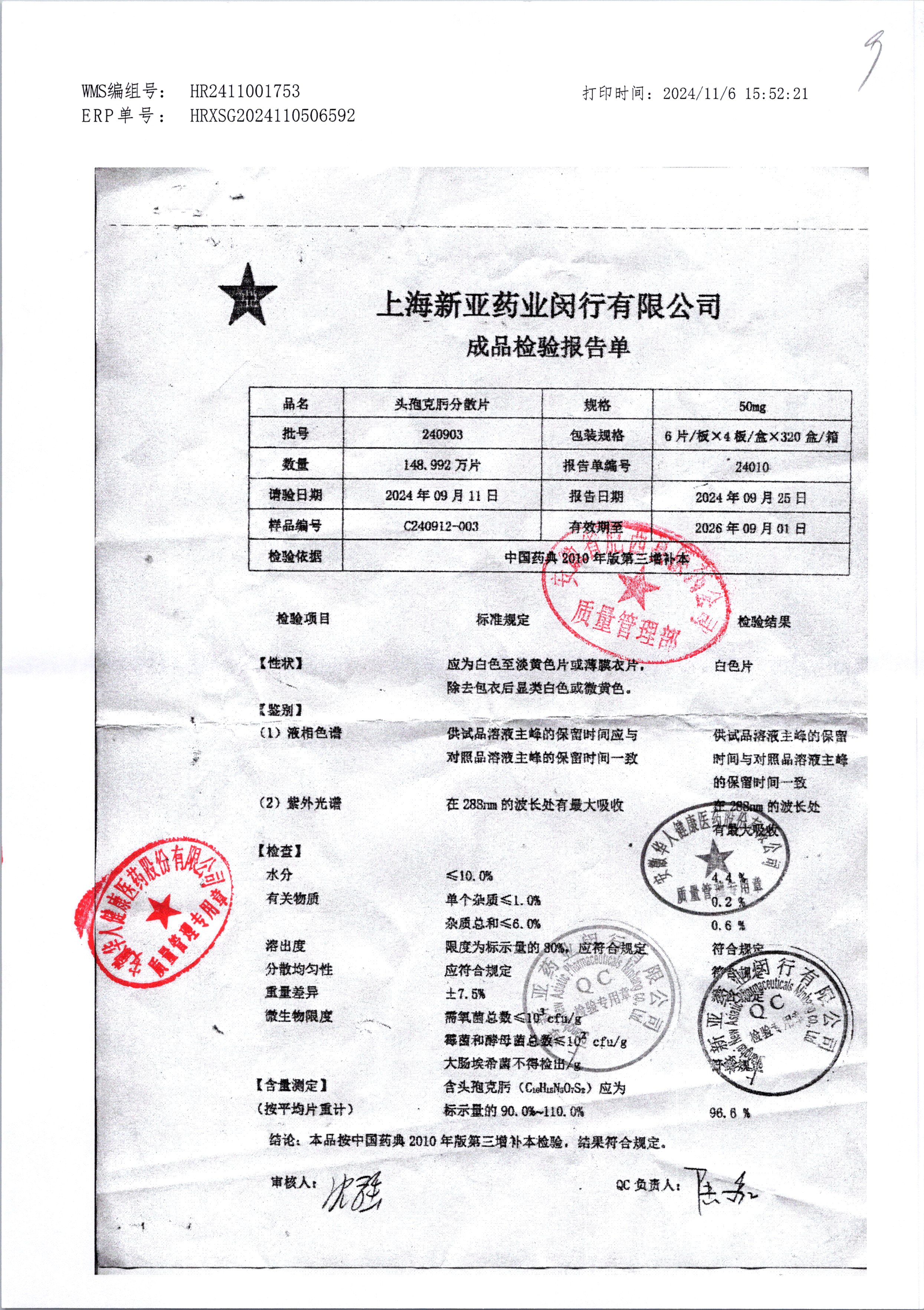 | 頭孢克肟分散片 | 50mg*24s | 240403 | 查看詳情 |