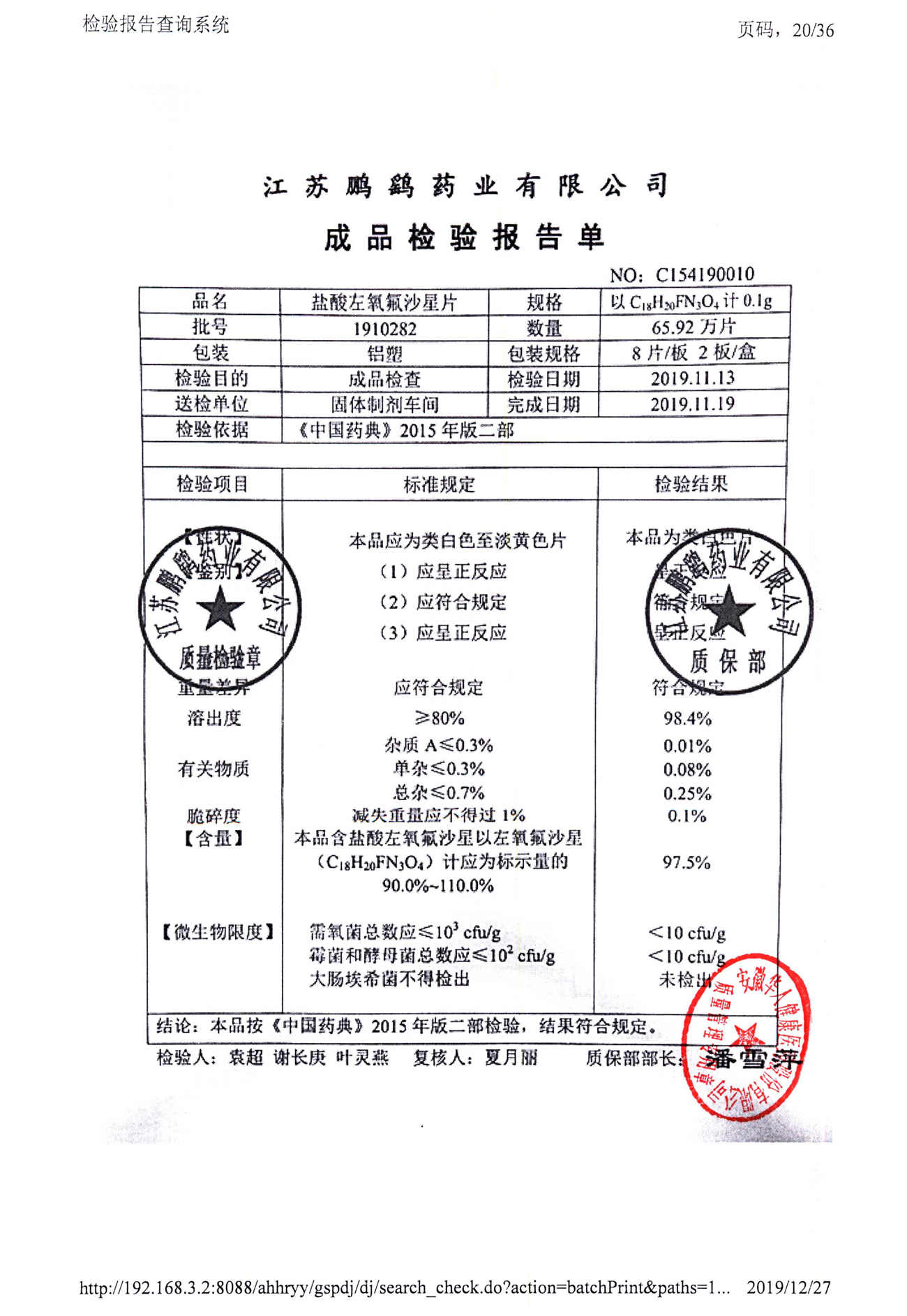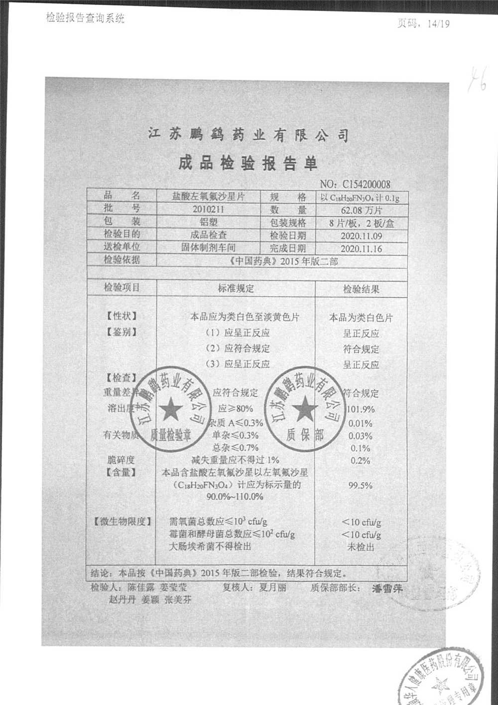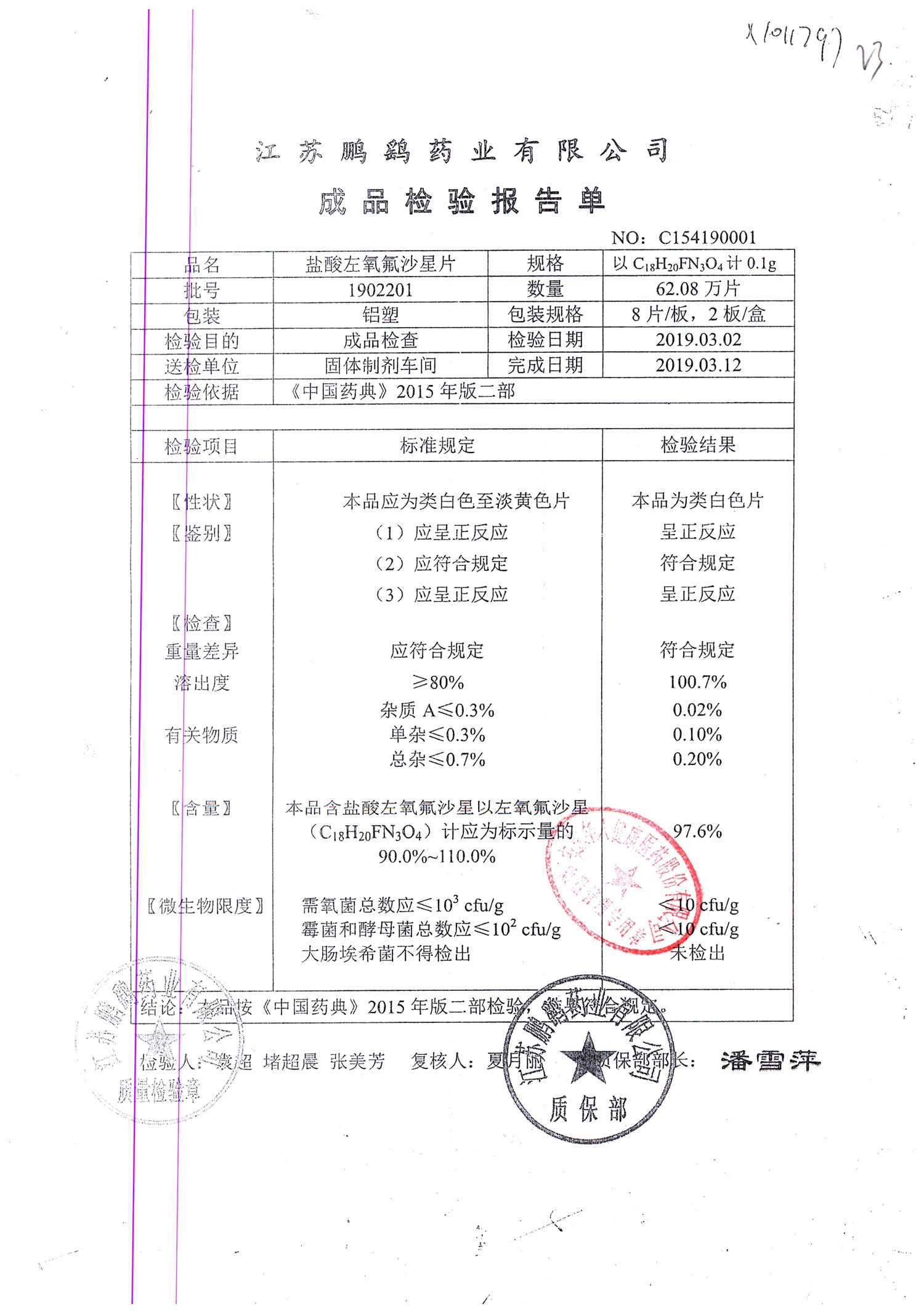 | 鹽酸左氧氟沙星片 | 16s | 2012071 | 查看詳情 |