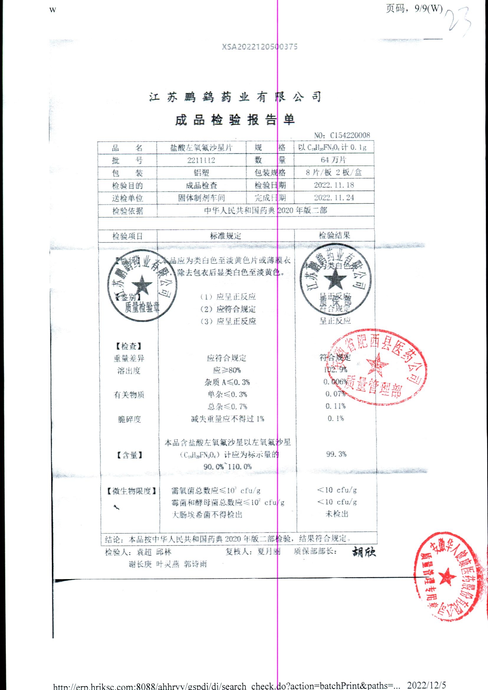 | 鹽酸左氧氟沙星片 | 16s | 2211112 | 查看詳情 |