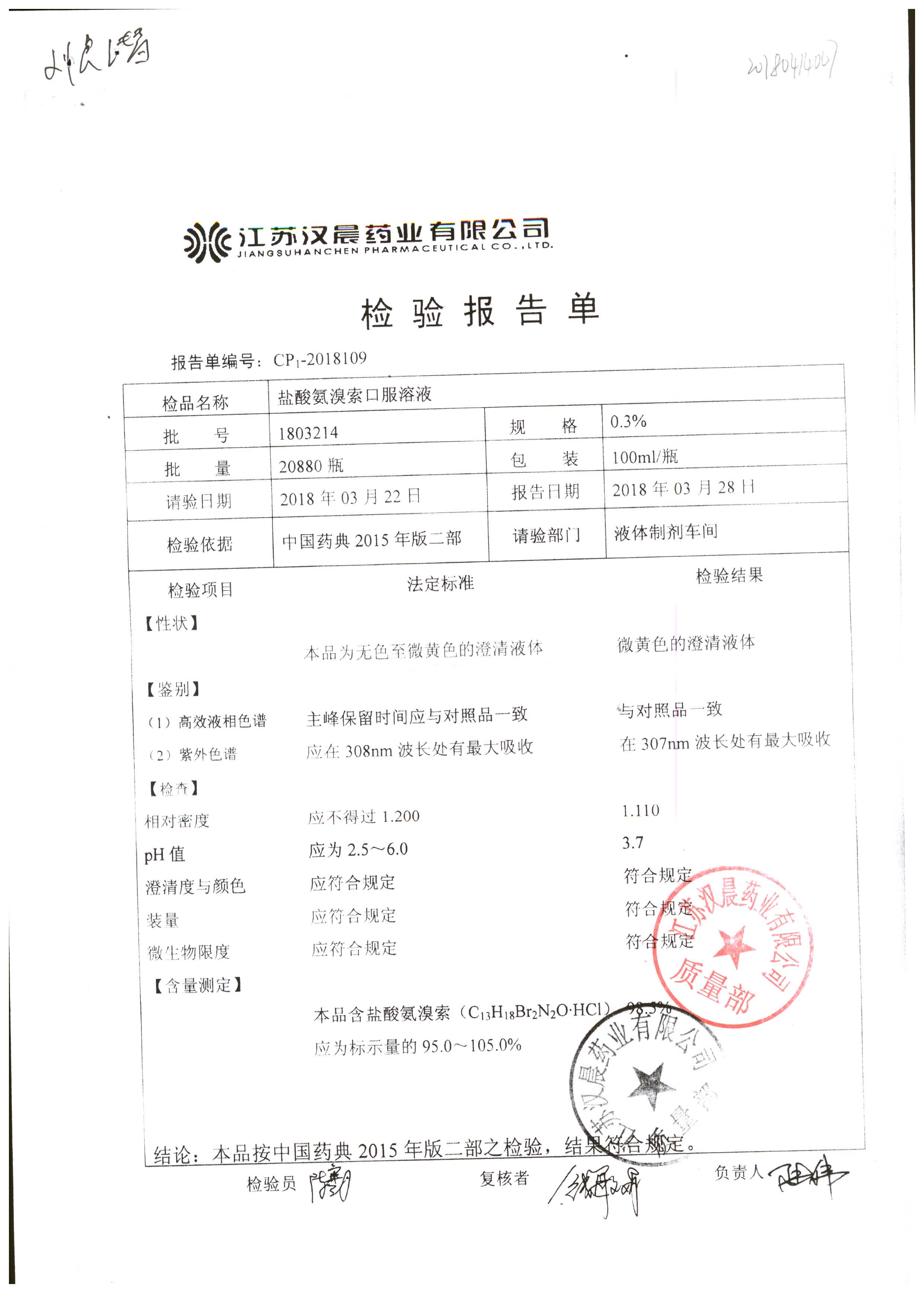 | 鹽酸氨溴索口服溶液 | 100ml | 1807015 | 查看詳情 |