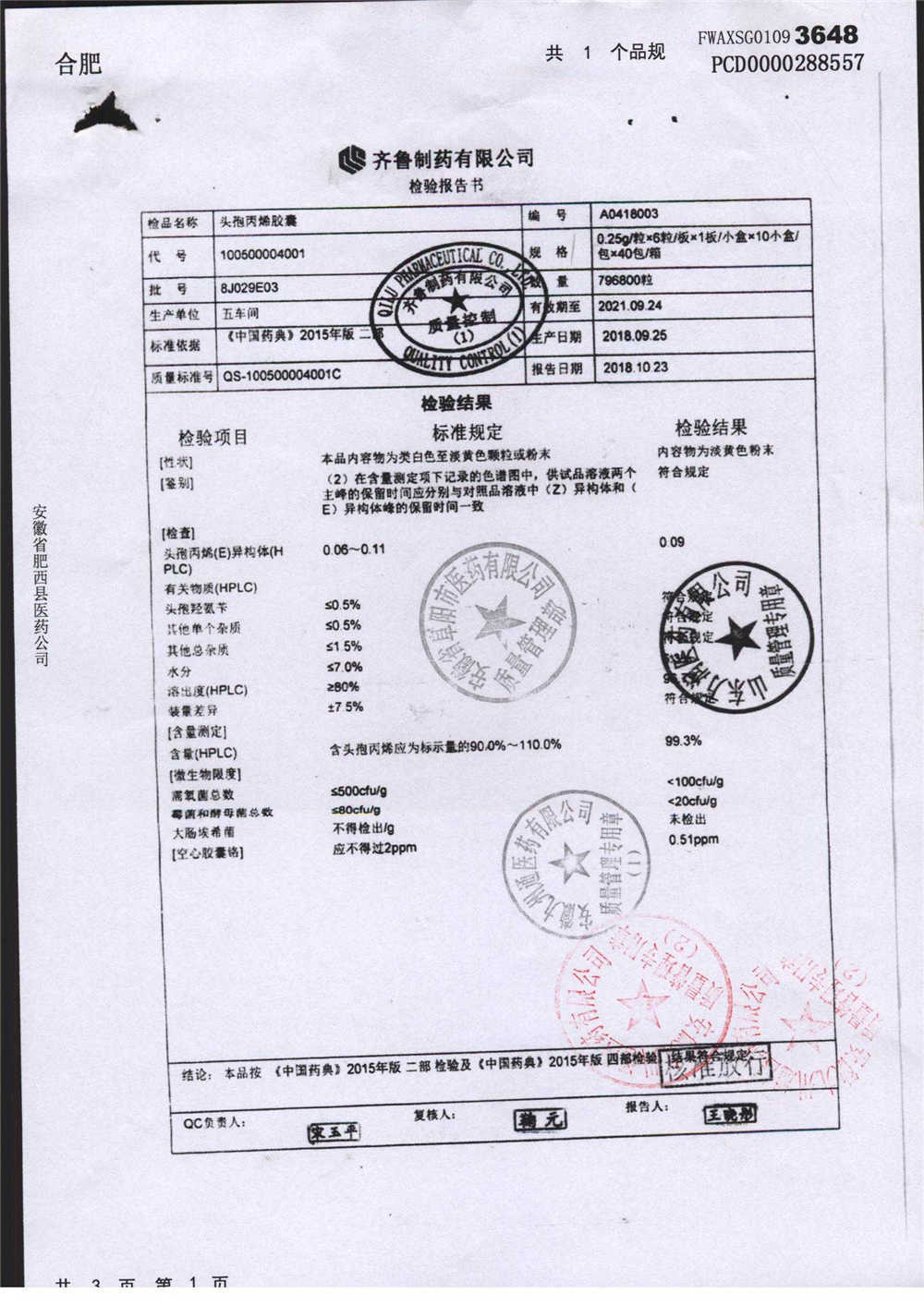 | 頭孢丙烯膠囊 | 0.25g*6s | 8C007E03 | 查看詳情 |